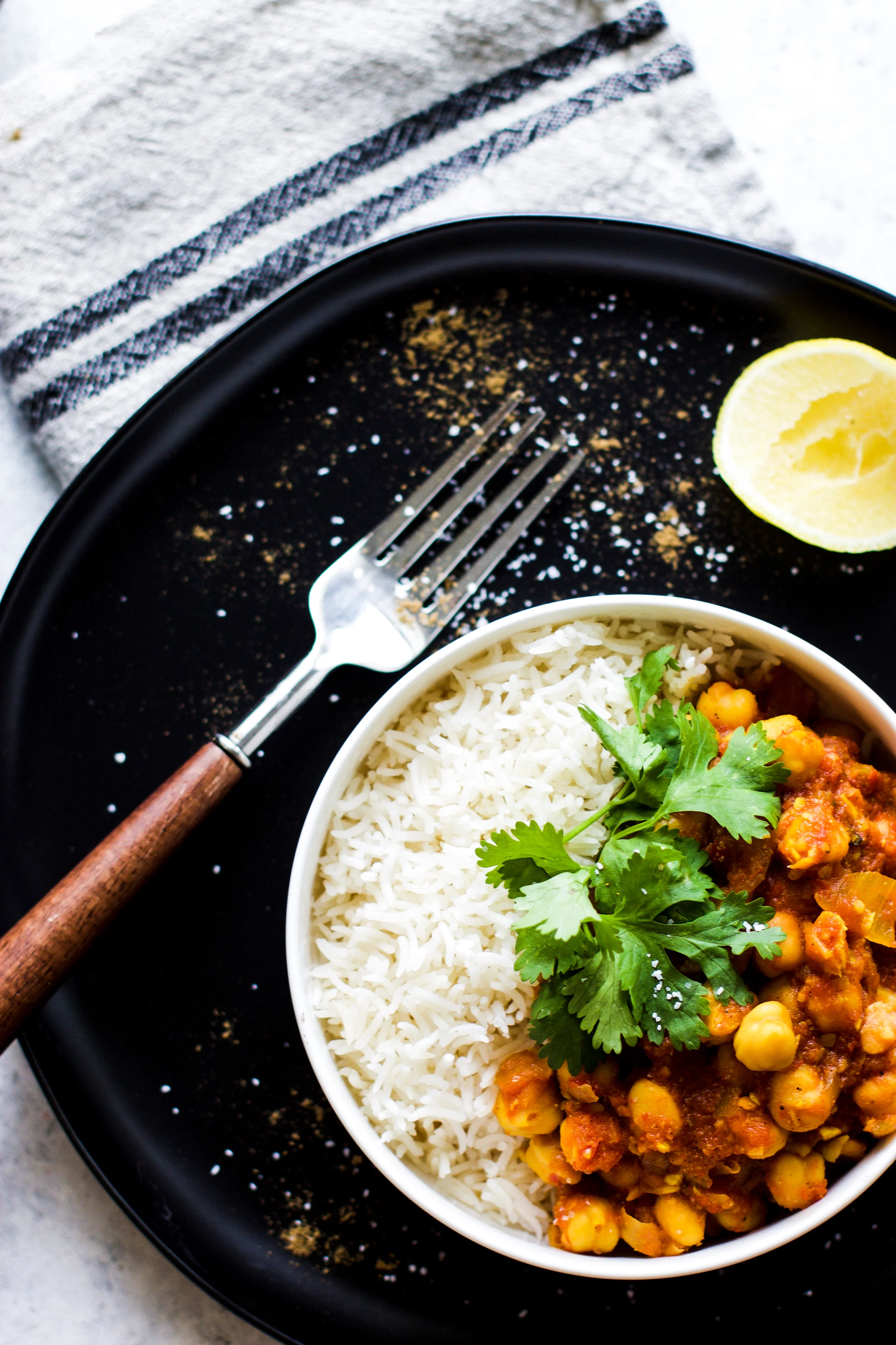We love going meat free at least once or twice a week! It’s a great way to do something good for your health and usually meatless meals are super cost effective too! We have a few recipes on rotation from week to week, but one of our favorite time and time again happens to be an Indian dish called Chana Masala. This is a quick and healthy meal that your whole family can enjoy any night of the week! My easy 30-minute chana masala can be whipped up on even the most exhausting of days no problem!
