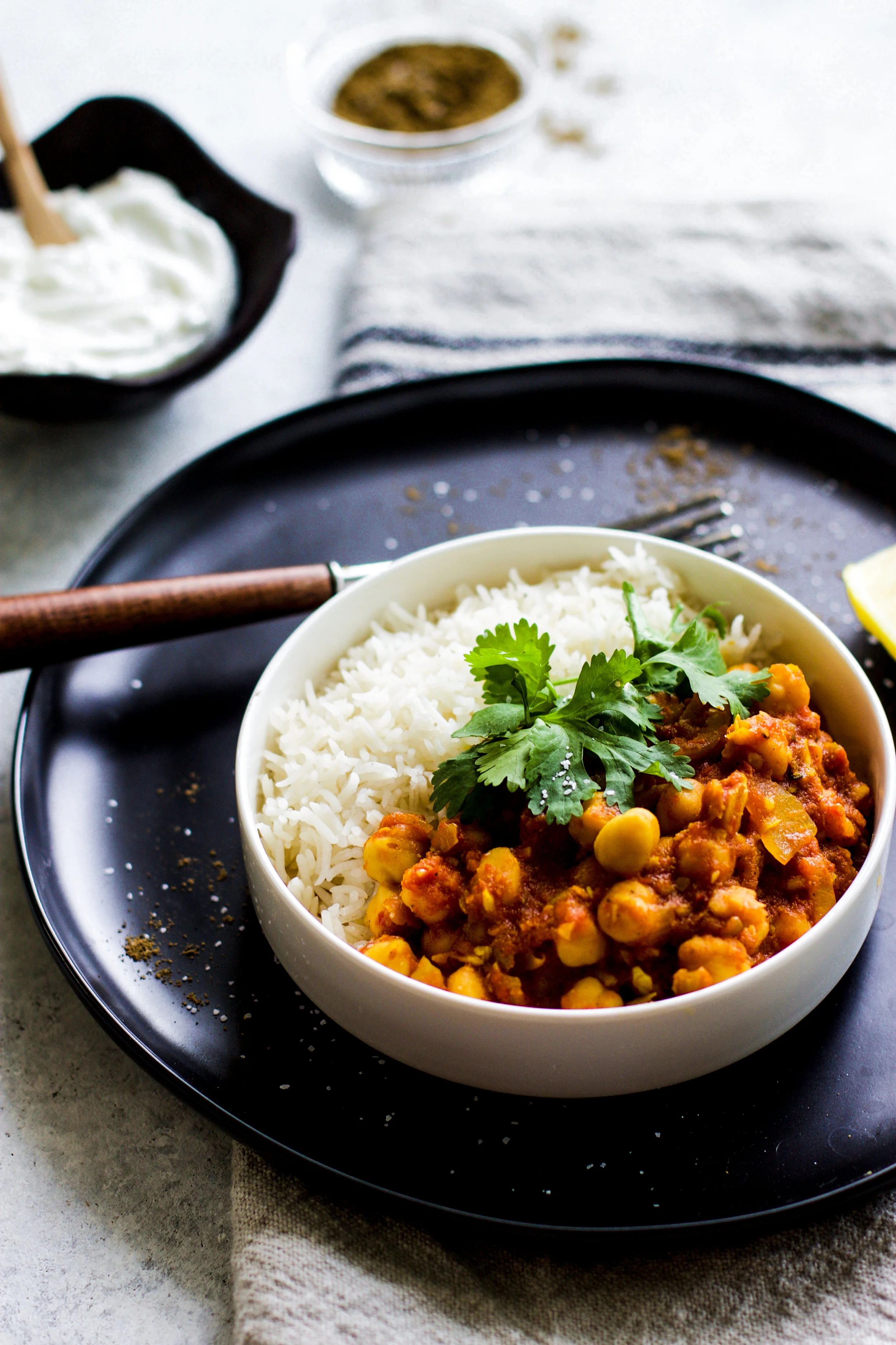 My mom travels to India a few times a year and she always brings me back big bags of spices! Spices like turmeric, cumin, garam masala, and so many more! Lucky for you, these spices are all available in most grocery stores too! This chickpea based meal is super cozy and comforting as we slowly move into the fall food mode, and it will quickly become one of your favorite vegetarian meals to make because of it’s intense and delicious flavors!