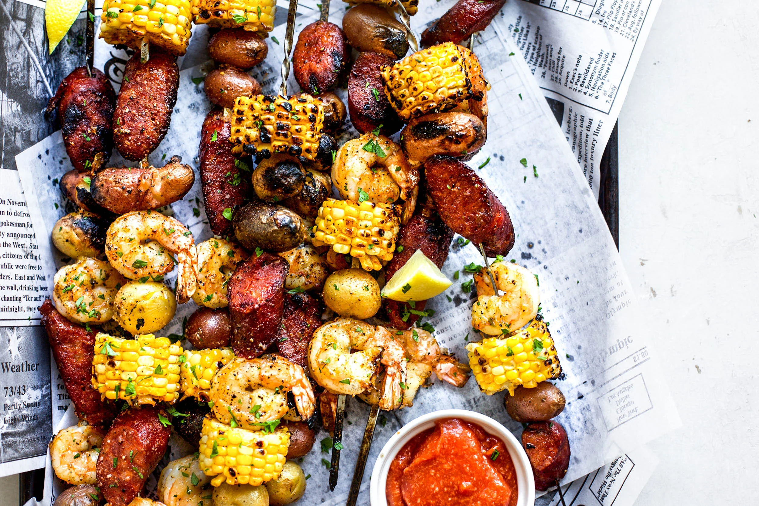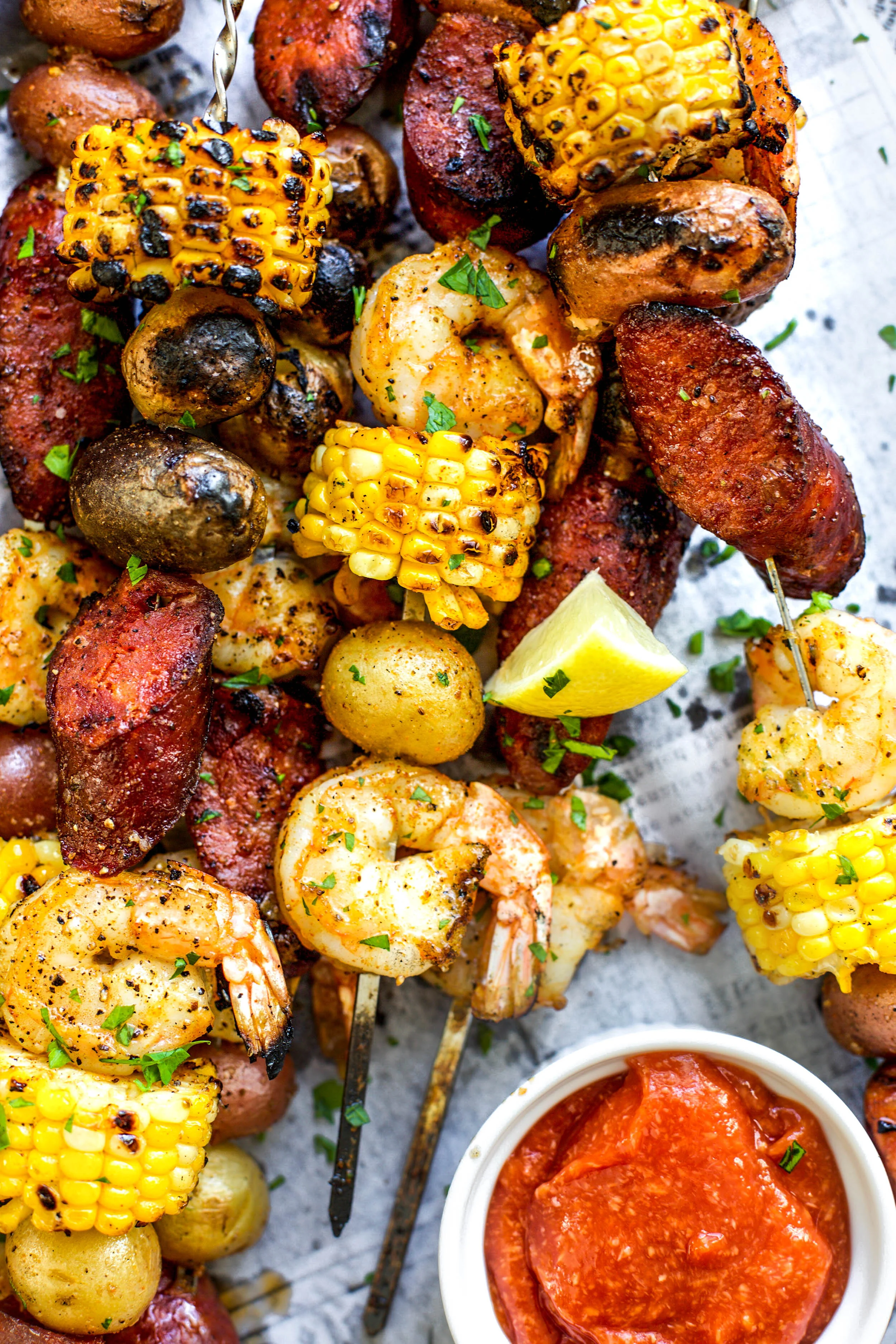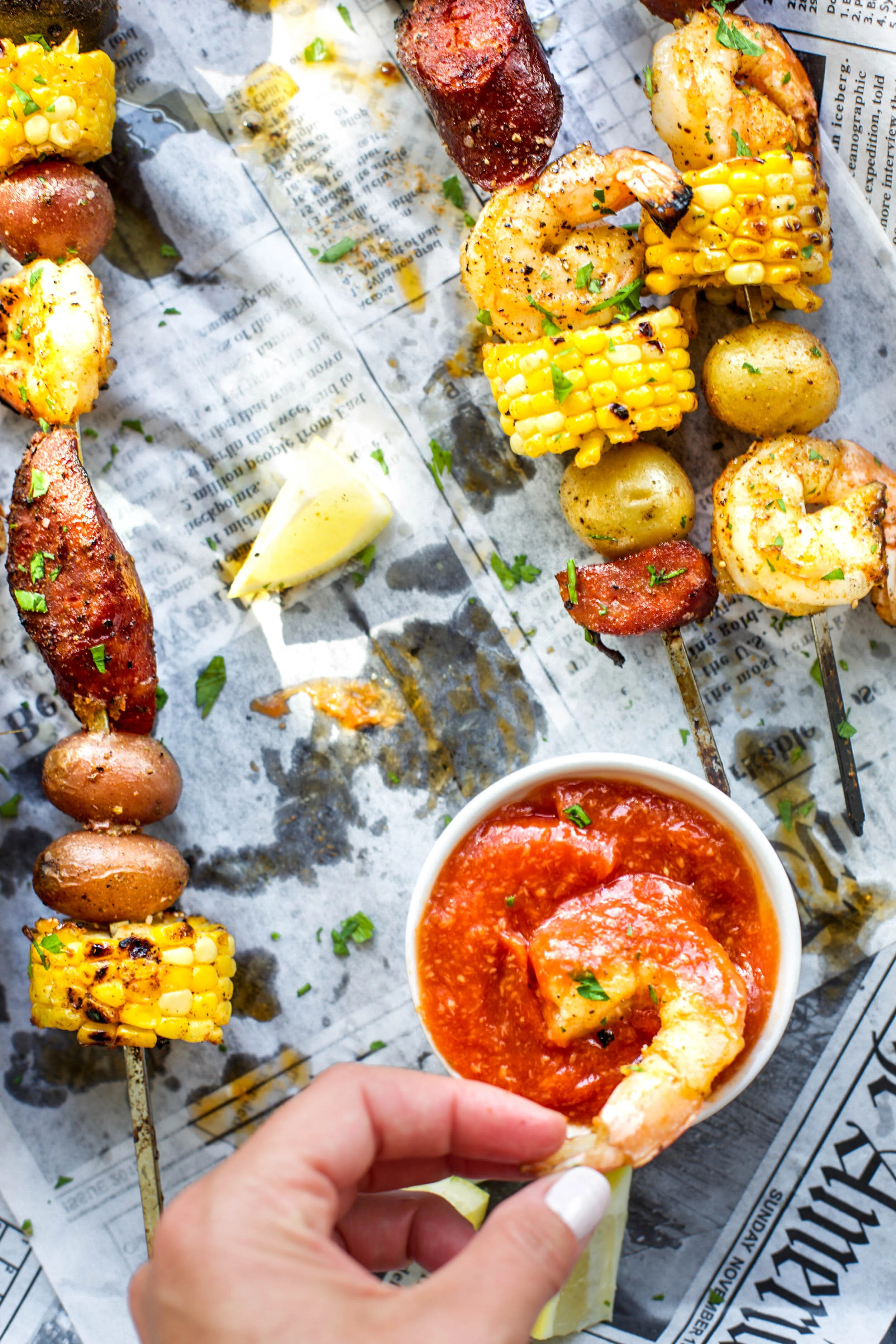 Shrimp, sausage, potatoes, and corn get seasoned with Old Bay, skewered, and grilled up for the perfect summertime dish. I brush them with butter, squeeze some fresh lemon over top, and then serve them up with homemade cocktail sauce. They are just so full of flavor and really are so simple to make. You could use any sort of sausage that you like here, and you could even make them spicy by using an andouille sausage and Cajun seasoning instead of the Old Bay. I can’t think of a more perfect summertime dinner to be enjoyed by family and friends. Can you?