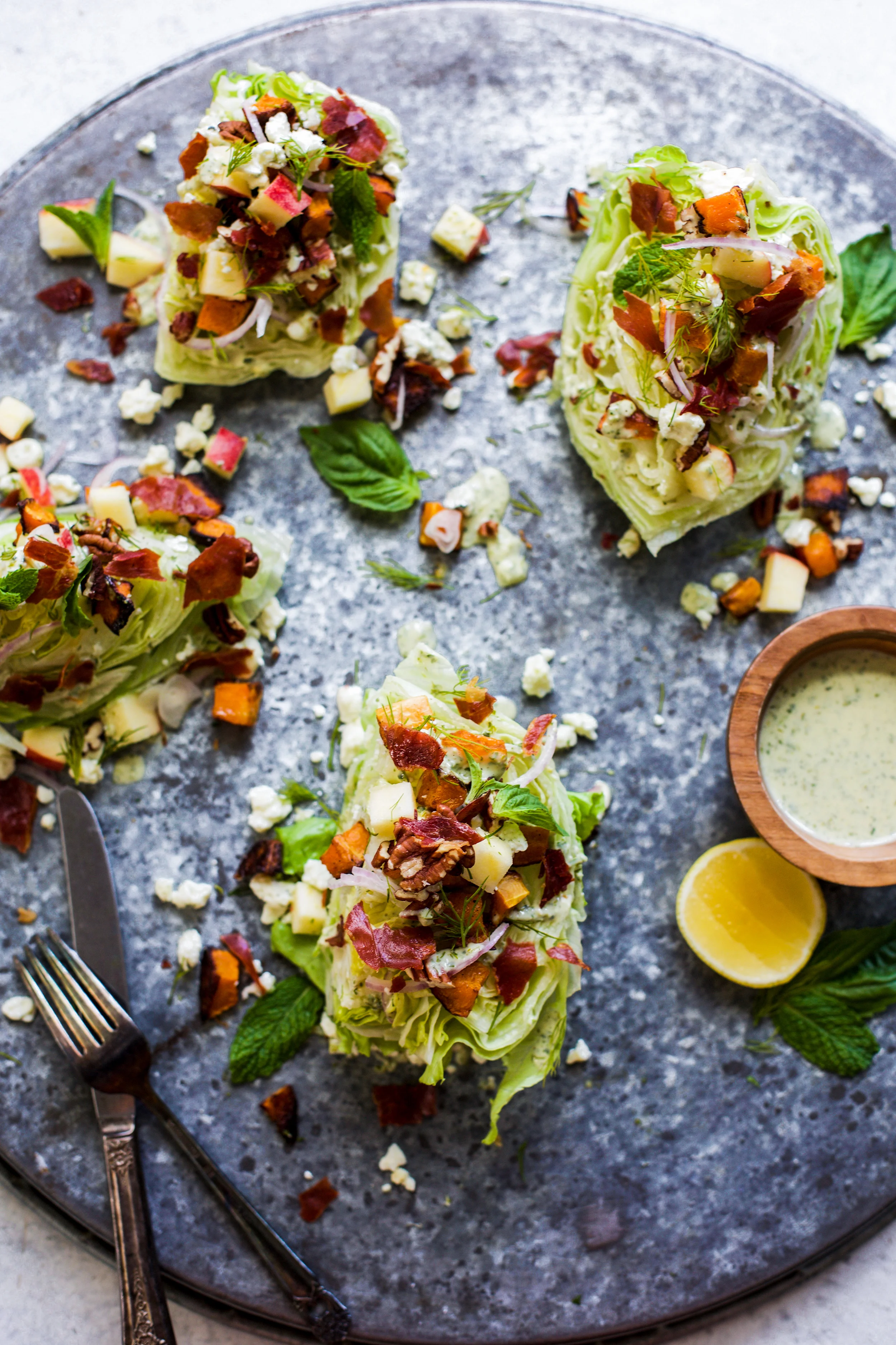 At this time of year, warm and cozy dishes seem to get all of the attention! From soups, to pastas, and everything in between, it feels like sometimes we forget about eating salads during this season! I don’t know about you, but I still crave some freshness in the midst of all the cozy! A good fall salad is one of my favorite dishes to make and I took one of my favorite wedge salads and turned it into the most delicious autumn wedge salad that you have ever tasted! My Autumn wedge salad with green goddess dressing is perfect for any night of the week, but also makes a great addition to any holiday menu too!
