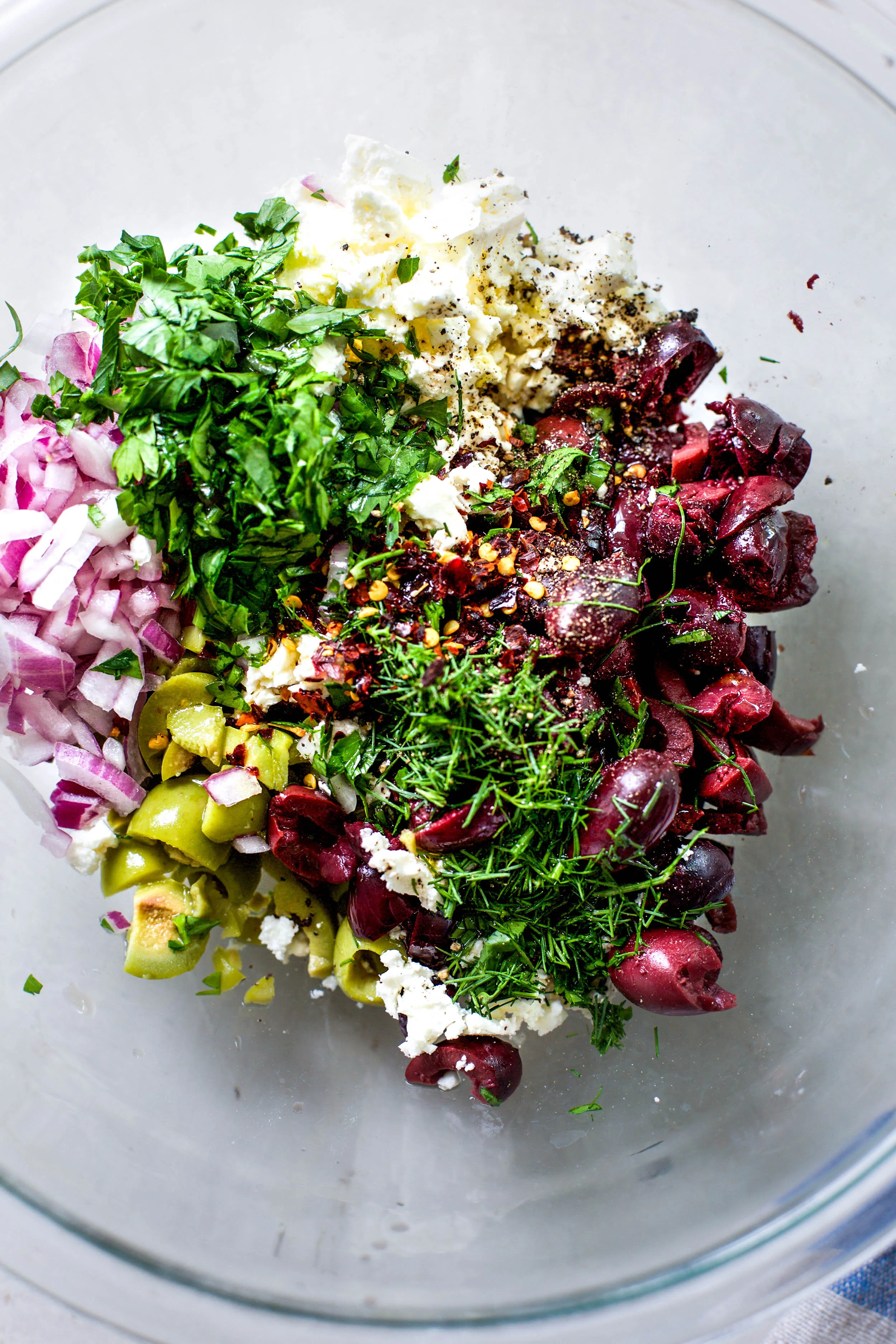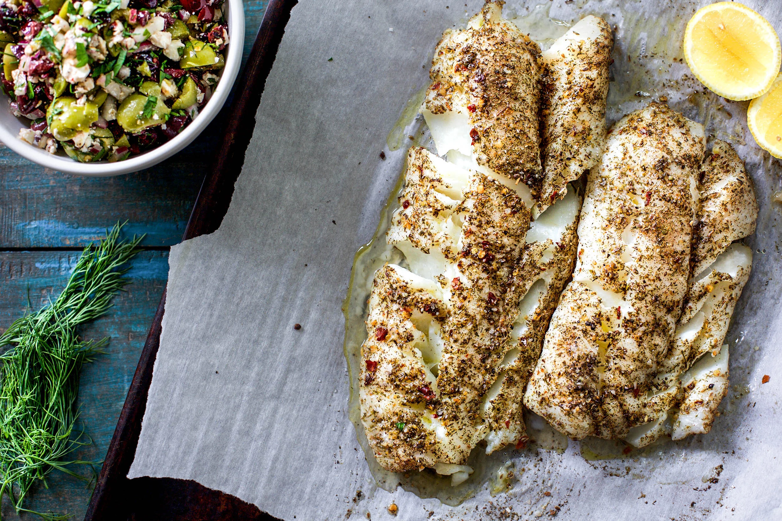 While the fish is cooking combine olives, red onion, parsley, dill, feta cheese, red wine vinegar, olive oil, 1/2 tsp. spice blend, 1/4 tsp. salt, and 1/4 tsp. black pepper in a bowl and stir to combine.