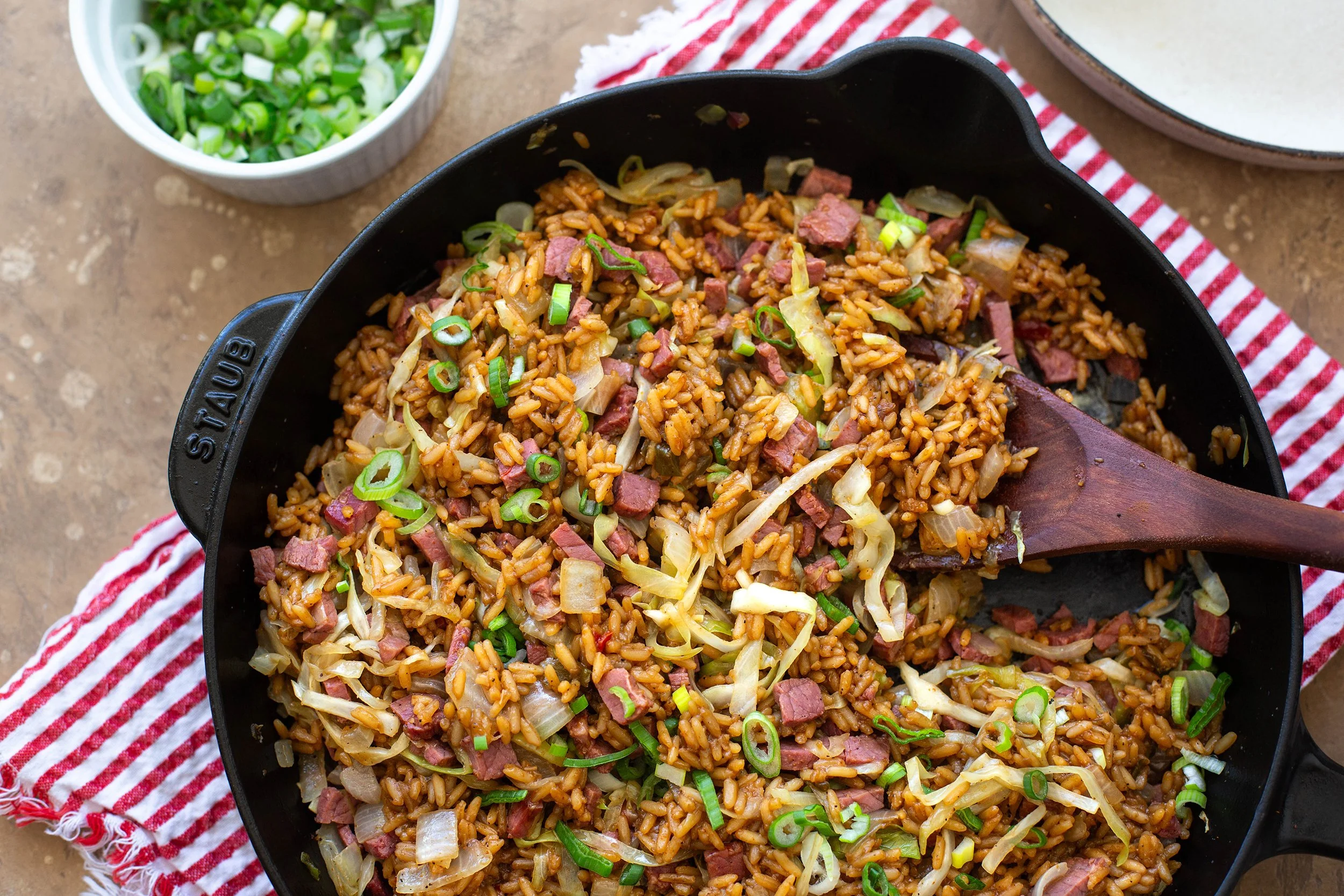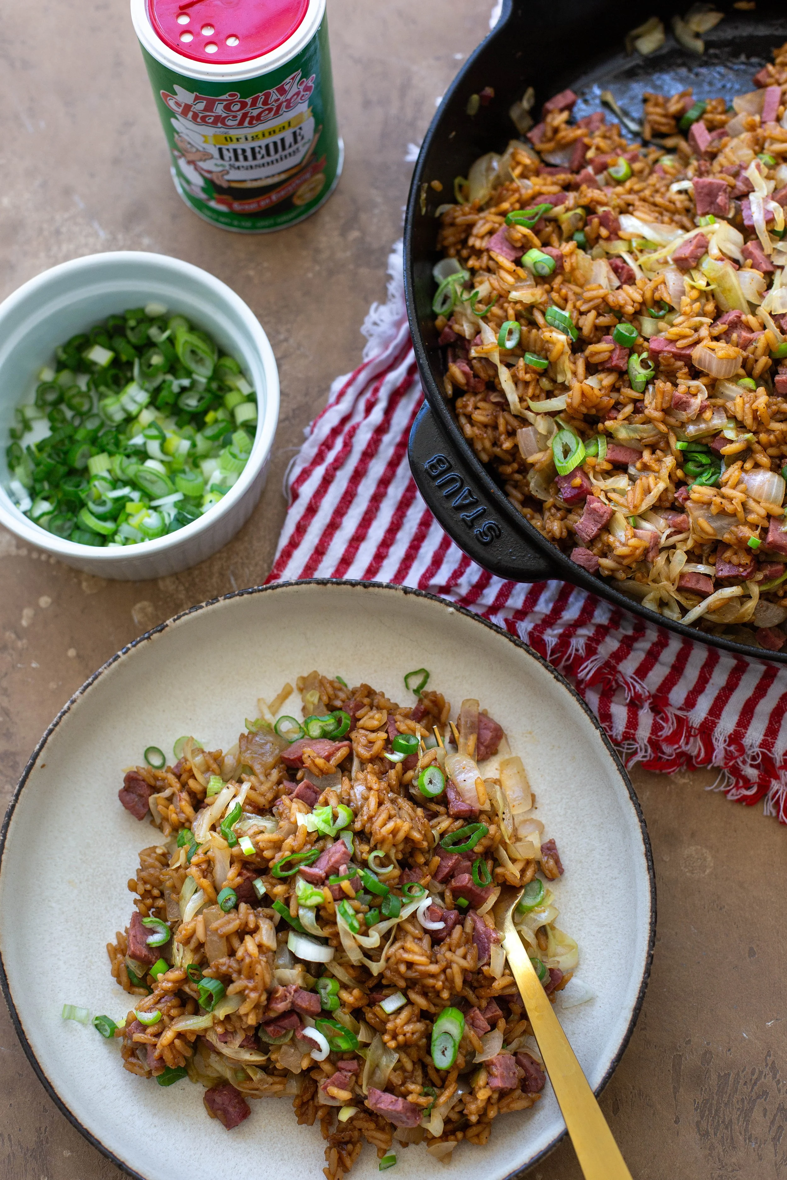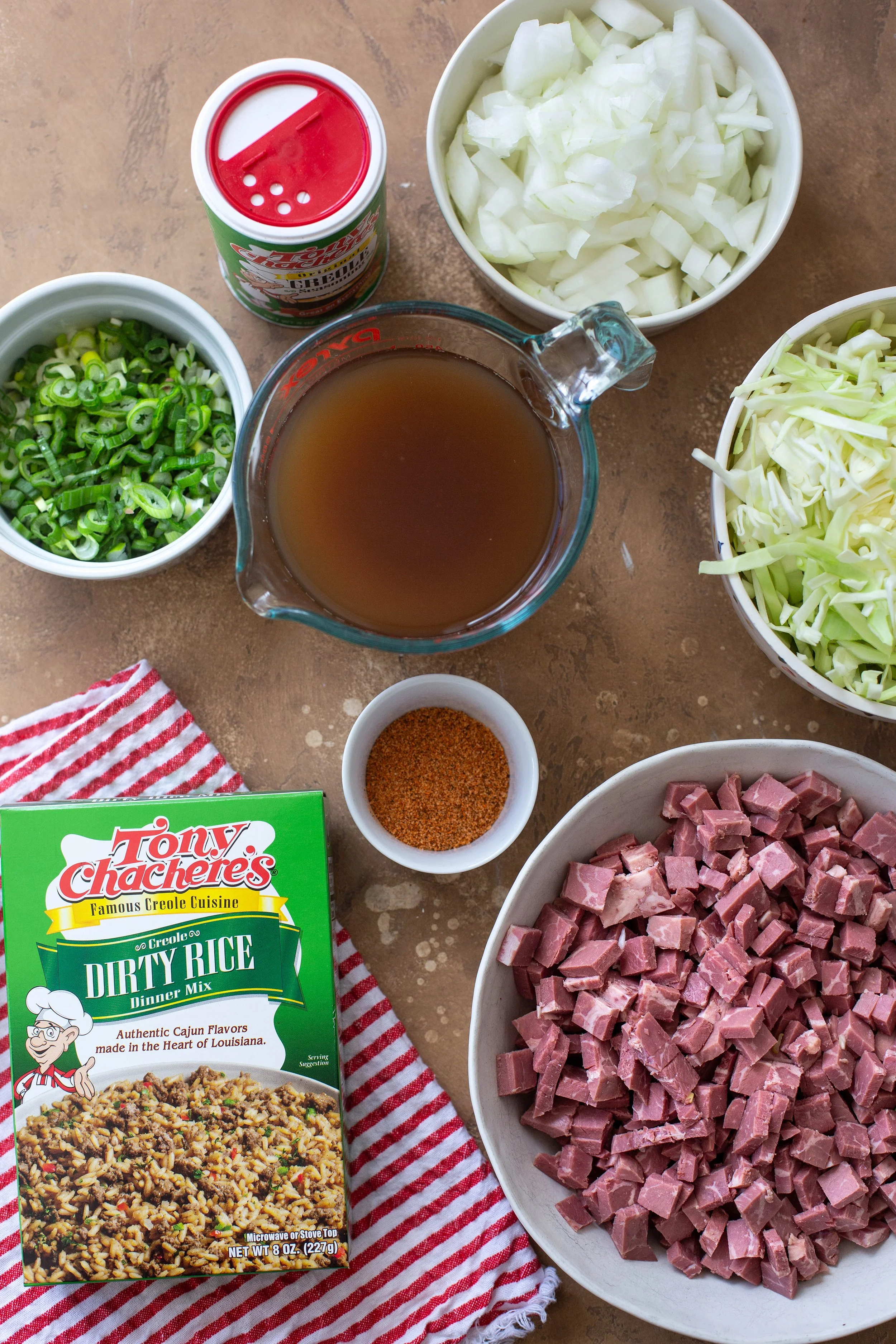 Traditional dirty rice is made by browning different meats along with the holy trinity of celery, bell pepper, and onion and then gently folding in rice and having it all simmer together to achieve that golden color and deep flavor. I love using Tony Chachere’s Dirty Rice Mix because the flavor is already created for me, and it’s a no fail delicious meal every time. This version with sautéed corned beef and cabbage is such a delicious way to change things up and enjoy it for the month of March for St. Patty’s day!
