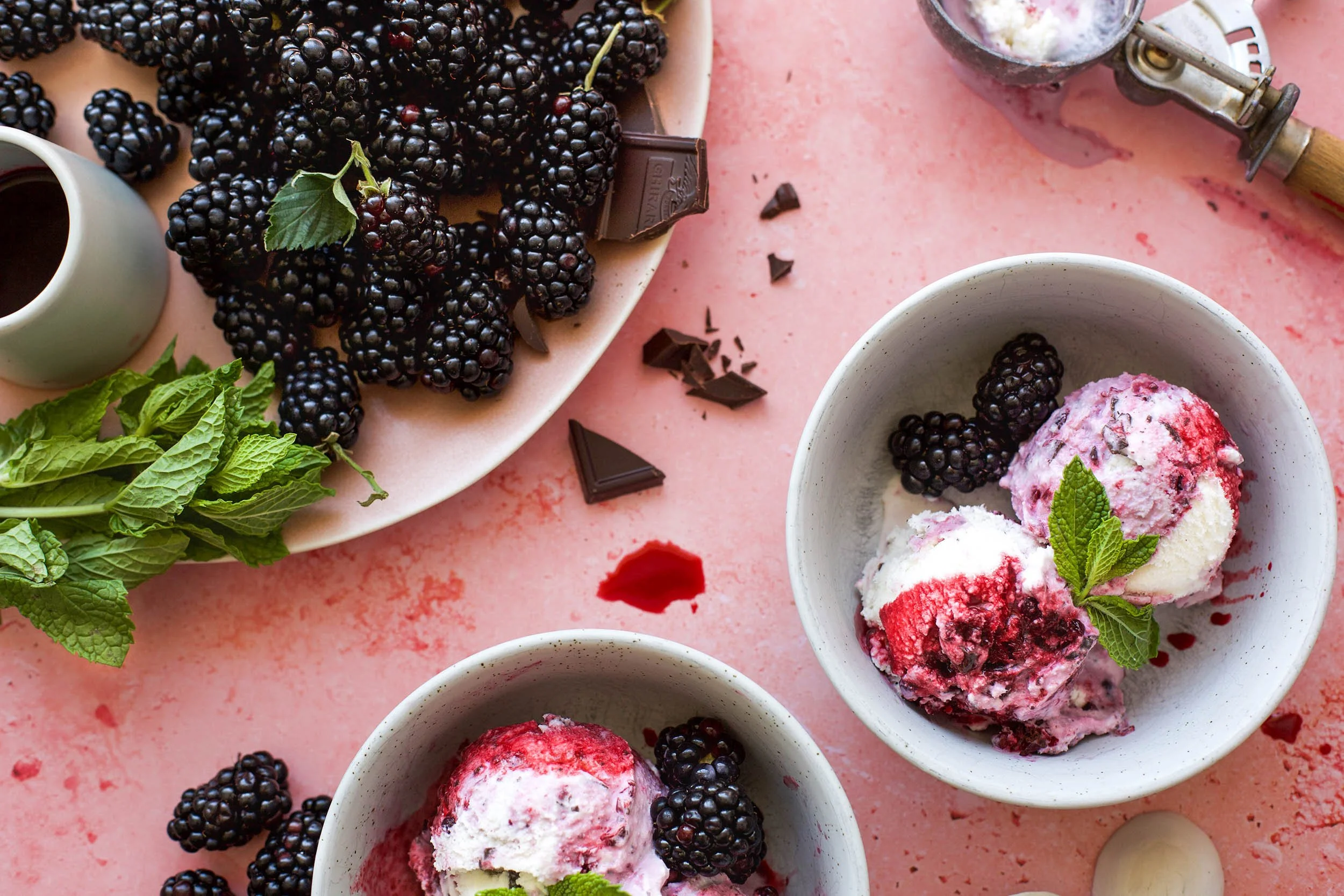 Make sure to cool your blackberry reduction and ice cream base thoroughly before adding to the ice cream maker. Both need to be very cold.