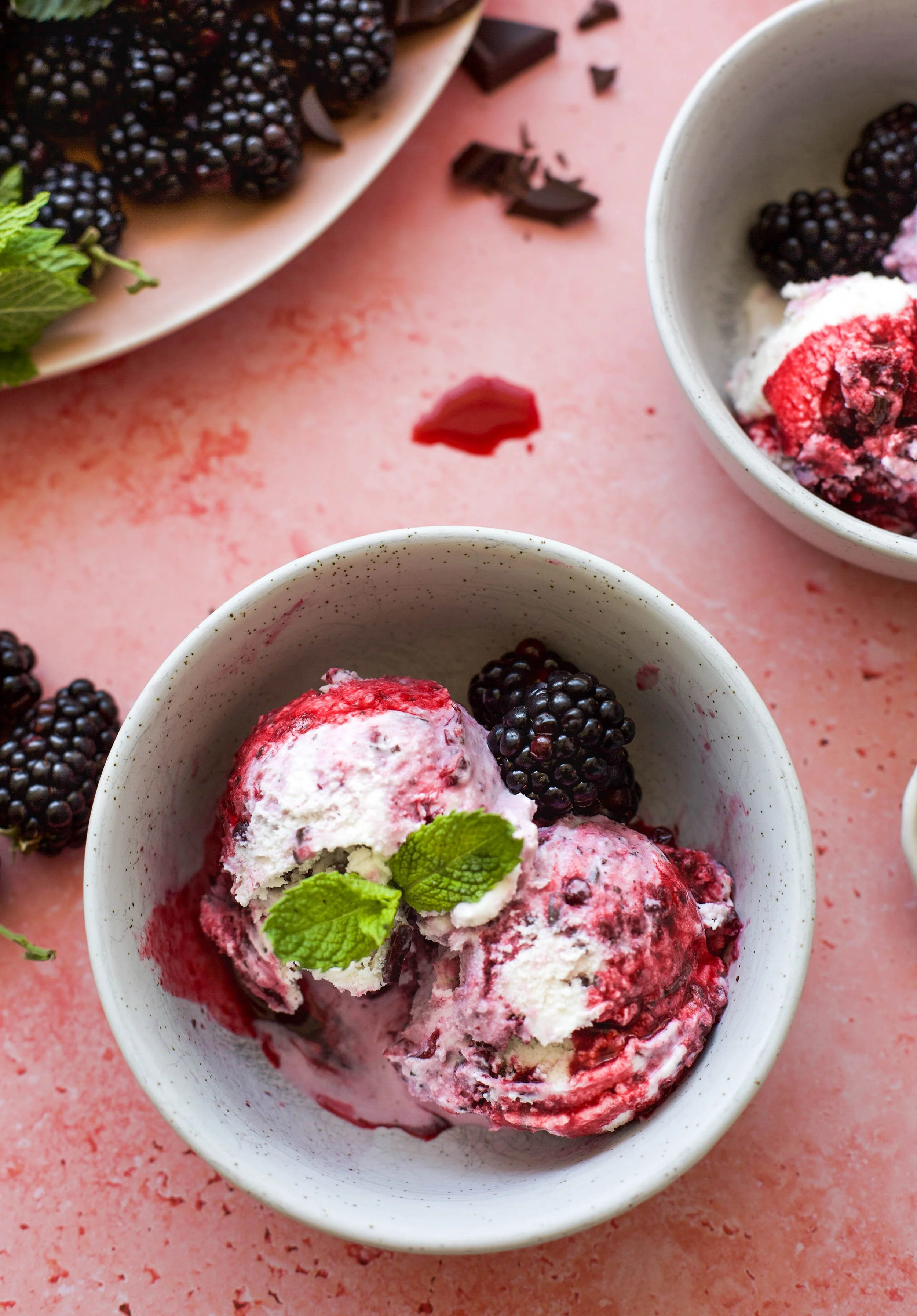 Blackberry mint chip ice cream is the ice cream flavor of the summer! If you are a mint chocolate chip fan, then you will love this fruity blackberry twist. The result is a refreshing ice cream that is light and creamy and full of flavor and textures. This ice cream base is egg free, which makes it even easier to make homemade ice cream right in your own kitchen. This recipe is a mix of my favorite mint chip ice cream with a layer of blackberry vanilla reduction swirled throughout. It is so delicious and perfect for serving up one or two scoops all summer long. This blackberry mint chip ice cream will surely become one of your new favorite ice cream flavors.