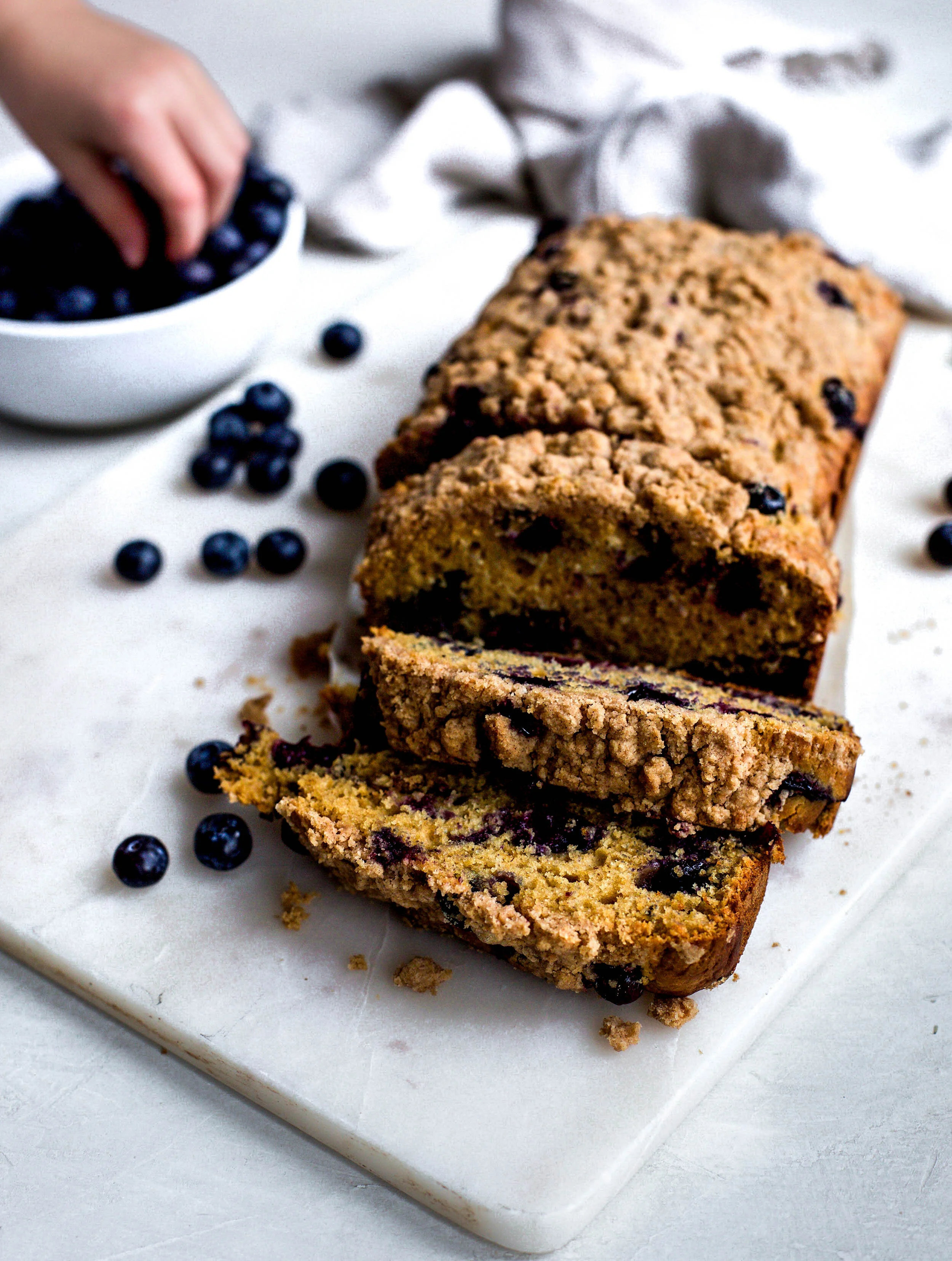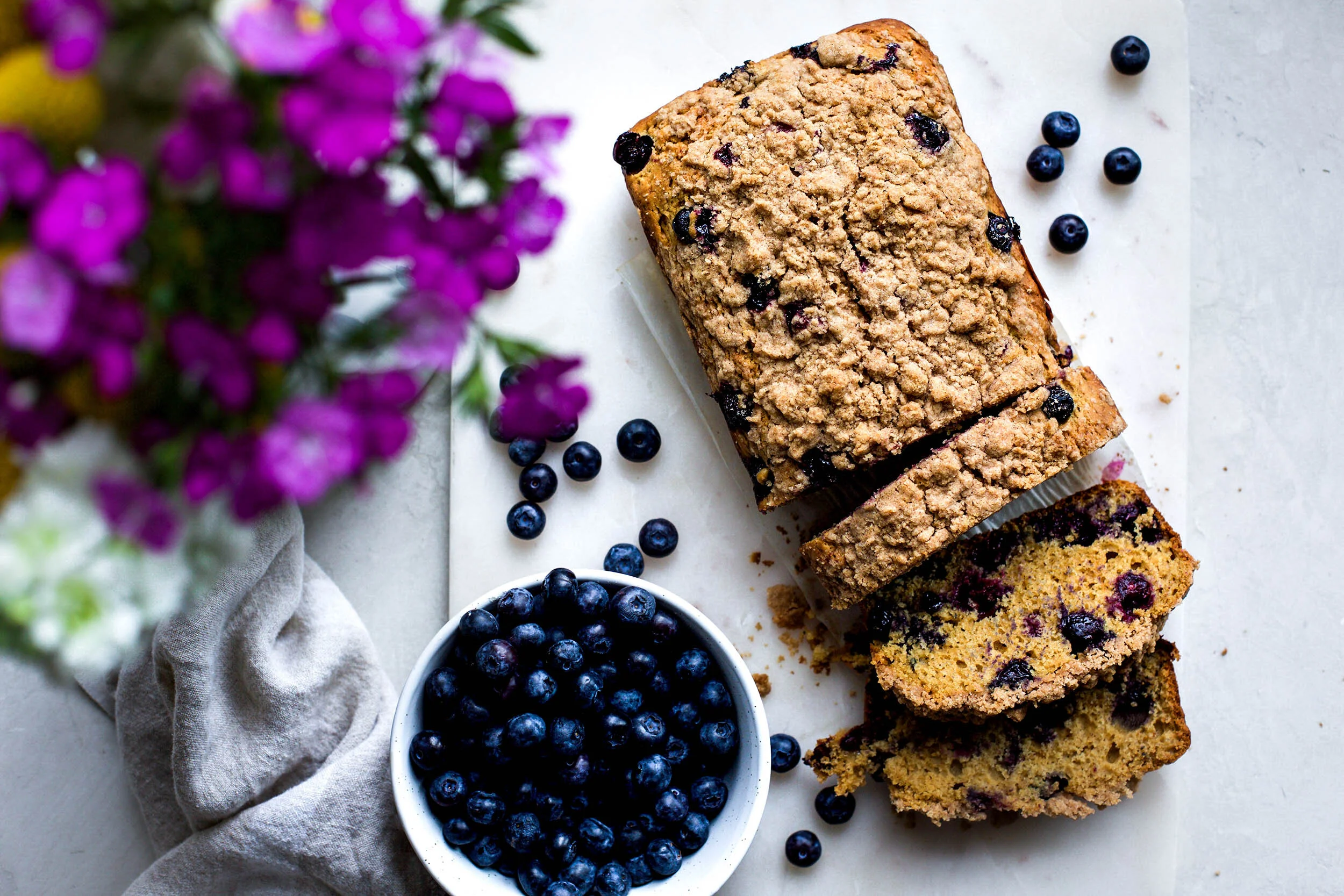 Blueberry muffins are one of those classic breakfast items that I tend to always go for when at a bakery because of their perfectly puffed tops and delicious crumble. For some reason I tend to make other flavors of muffins at home and leave the blueberry ones for the bakeries, but I decided I would make it even easier on you and me both and turn that same idea into a loaf bread! For some reason, breads are less intimidating than muffins to me because you aren’t trying to achieve the perfect dome top that makes a muffin great. For breads, you simply pour the ingredients into a pan and stick it in the oven. Done and done, and usually it’s pretty predictable that the outcome of the bread will be perfect every time.