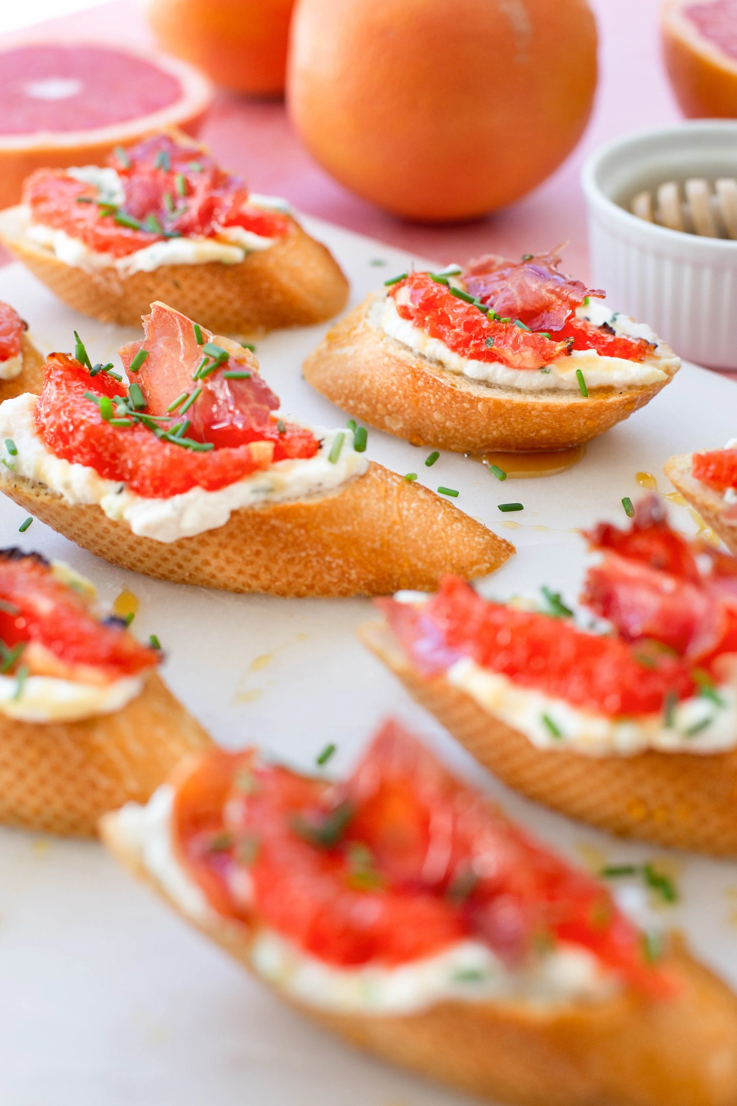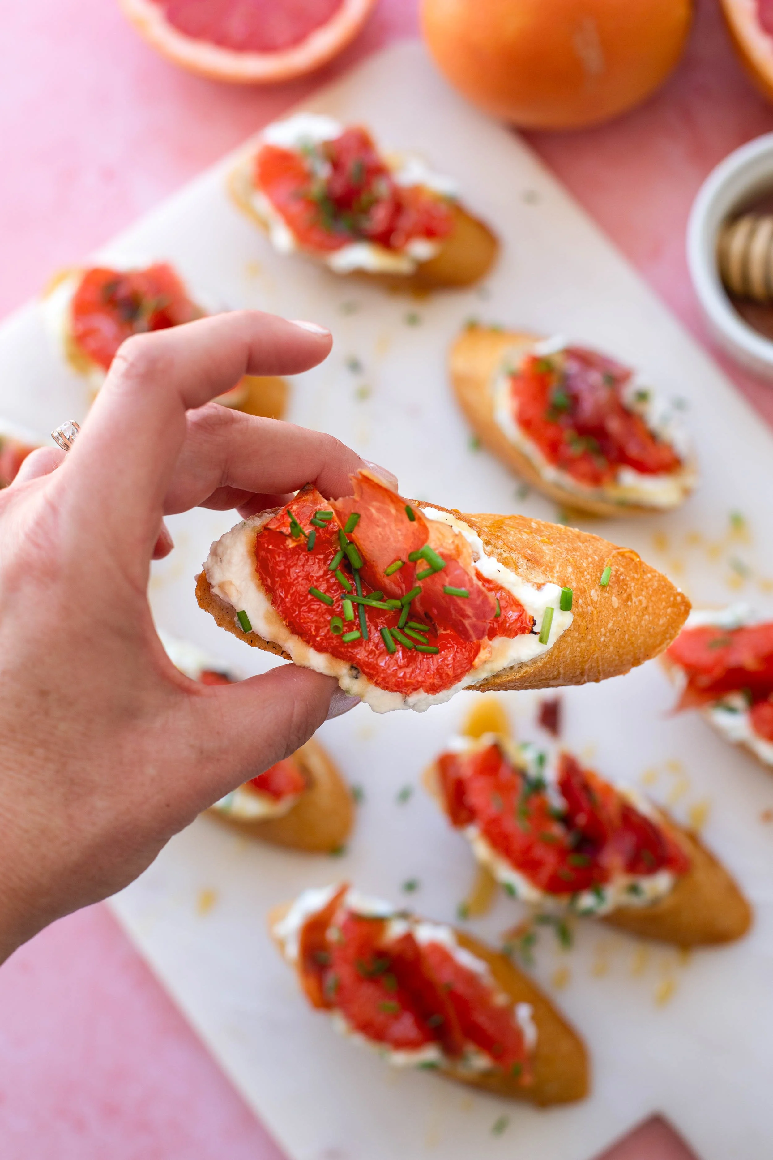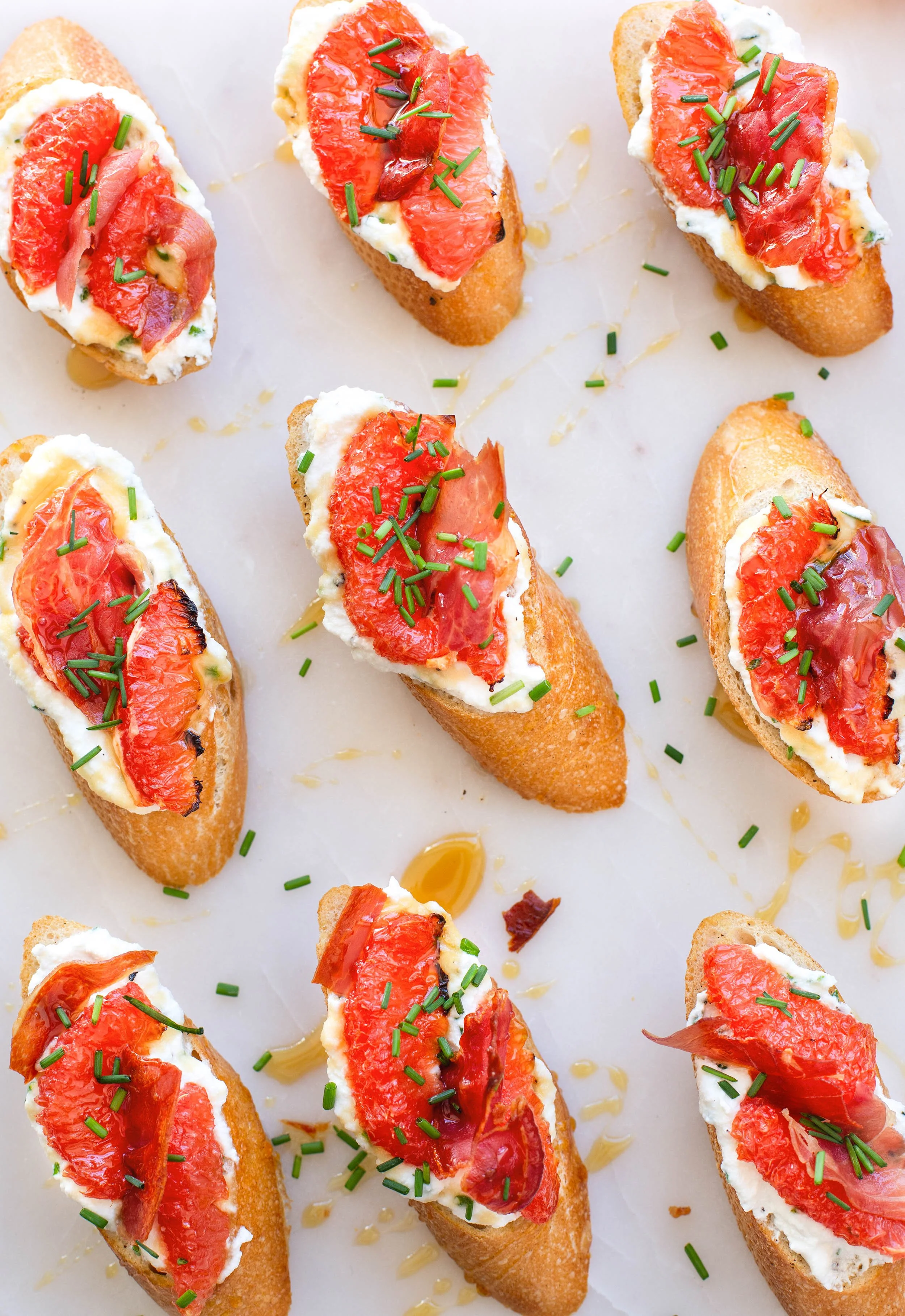 How good do these broiled grapefruit, crispy prosciutto, and ricotta crostinis look? Happy entertaining!