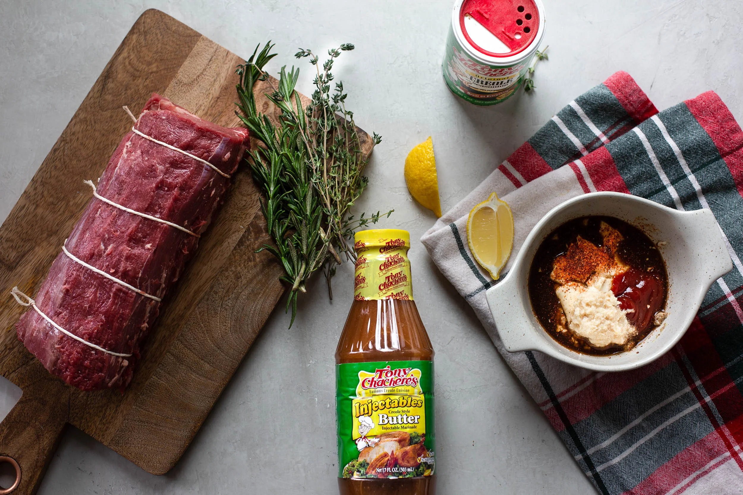 I get it, making a whole tenderloin at home can be scary especially since this cut of beef is a little pricey. But with my tips and recipe, you can guarantee a perfectly cooked tenderloin every time. For starters, this tenderloin is not only seasoned on the outside of the beef, but I also inject it with Tony Chachere’s Creole Butter to ensure a juicy piece of meat that is bursting with flavor. I also rub down the outside of the meat with a mix of Tony Chachere’s Creole Seasoning and some fresh herbs for a delicious crust on the tenderloin.