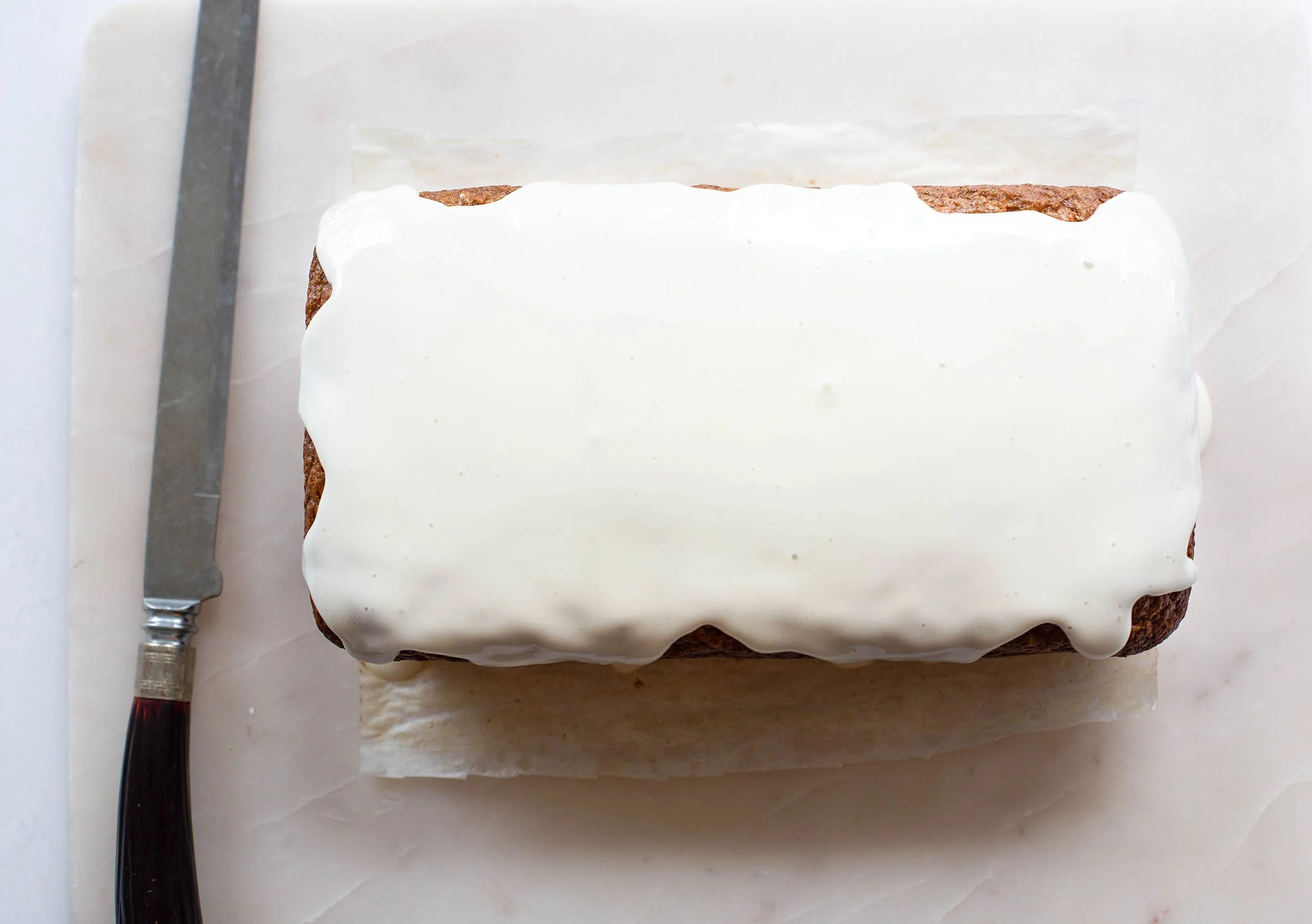 Remove the carrot cake bread onto a wire rack and pour the glaze over the top.