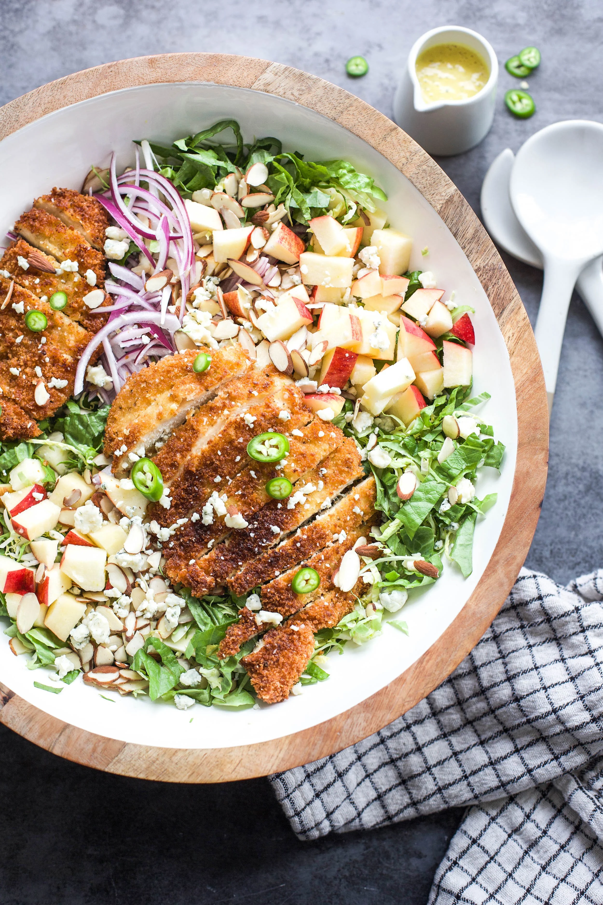 There are chicken salads, and then there are chicken salads that you want to eat over and over again. This chicken salad is one of those salads that you are going to crave on a weekly basis. It’s full of flavor and texture and the spicy sweet serrano honey mustard really brings it all together. This is the salad that no one will ever be able to call boring and is easy to make on any night of the week. This recipe for my crispy chicken cutlet brussel sprout salad with serrano honey mustard dressing is going to delight your tastebuds in the best way!