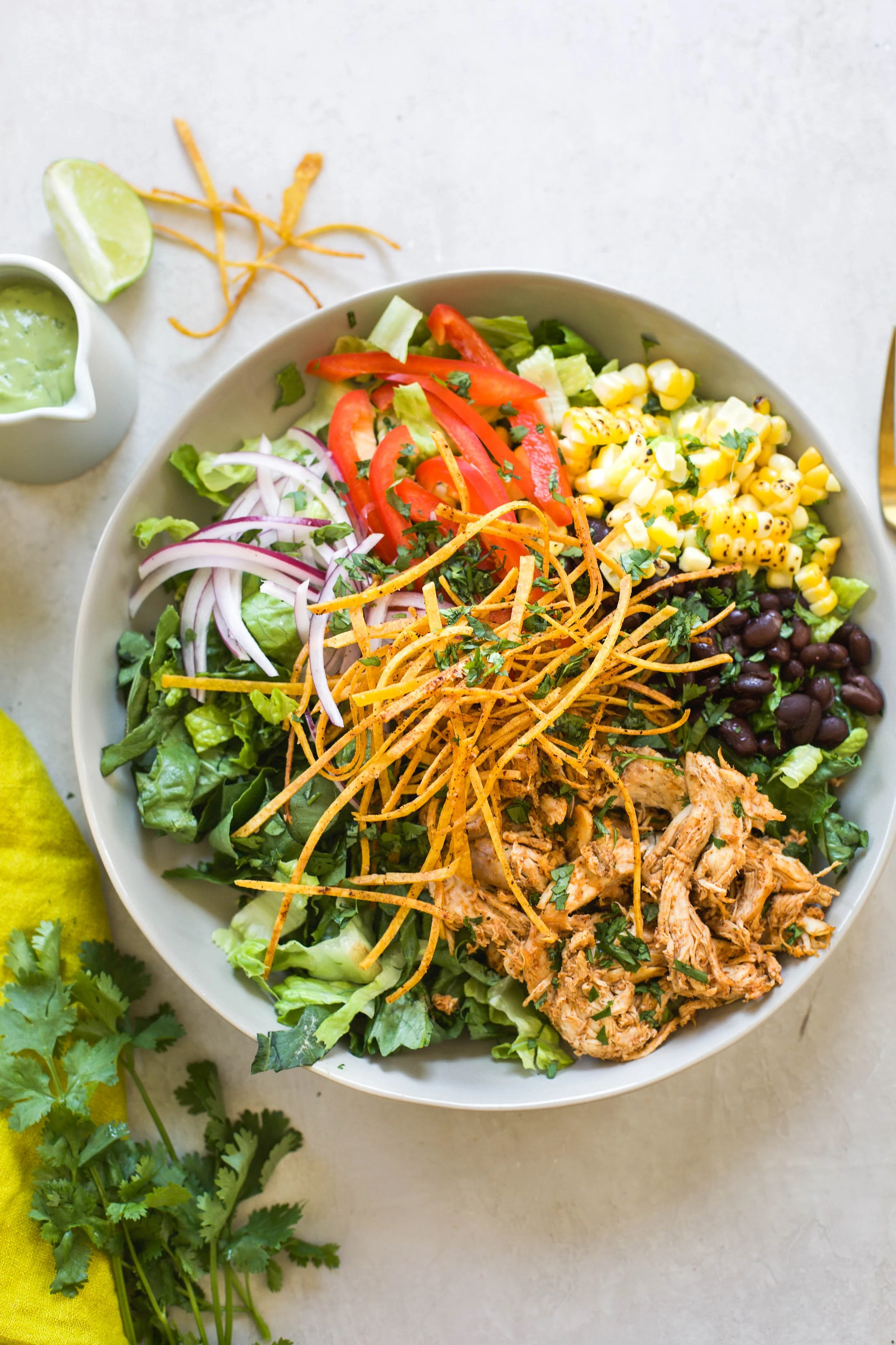 You are probably familiar with chicken tortilla soup, but have you ever tried to turn that same delicious soup into a salad? I created this delicious salad using all of the same flavors you love in a chicken tortilla soup, but in salad form. It’s the perfect weeknight meal while we are transitioning into cooler weather and can be made with a store bought rotisserie chicken making this recipe a breeze on even the busiest of nights. Make the ultimate chicken tortilla salad with a creamy avocado dressing and get ready to fall in love this with recipe.