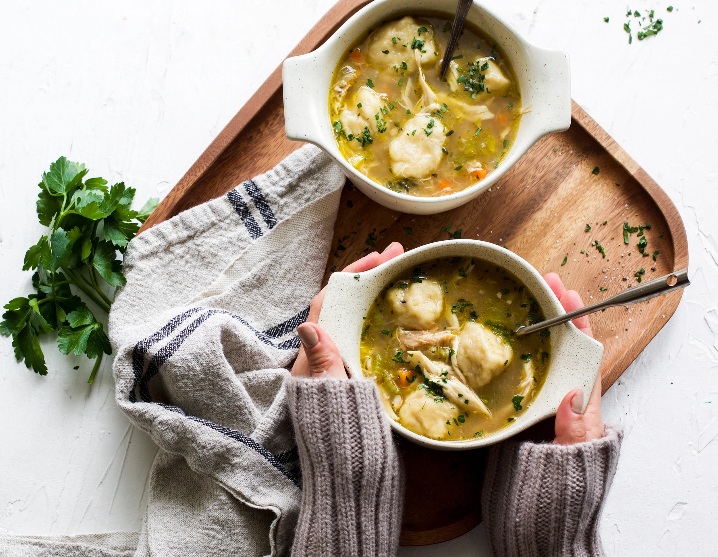 With just thirty minutes and ten ingredients, you can make this chicken and dumplings after even the most exhausting of days! These chicken and dumplings have an incredibly flavorful broth and are loaded with tender chicken, veggies, and fluffy dumplings that will warm your heart and your hands, guaranteed!
