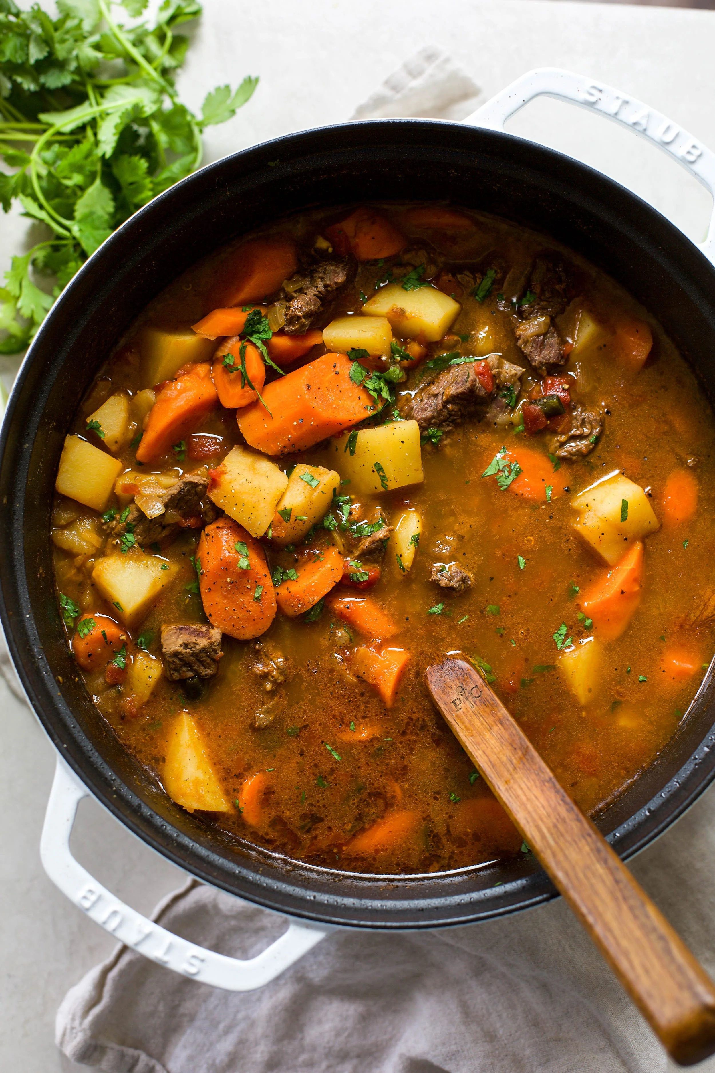 Beef stew is a classic comfort dish that is hearty, filling, and a favorite of my family. I took those same components and turned the idea into a delicious spin creating a Mexican inspired beef stew that is out of this world. While the base of the ingredients are the same of tender chunks of beef, carrots, and potatoes, the spices and toppings are what set this recipe apart from the classic. Cumin, oregano, garlic, and onion create a flavorful broth for the meat and vegetables to simmer in while getting tender and delicious. This easy Mexican beef stew is sure to become a new dinner favorite.