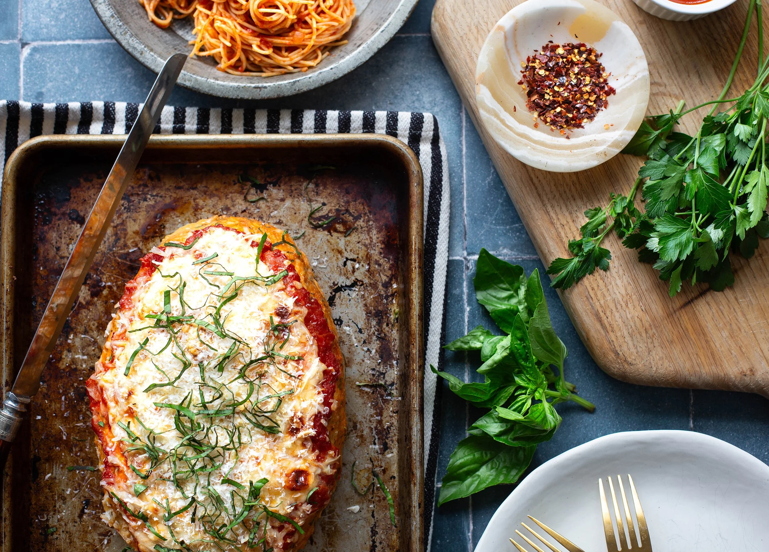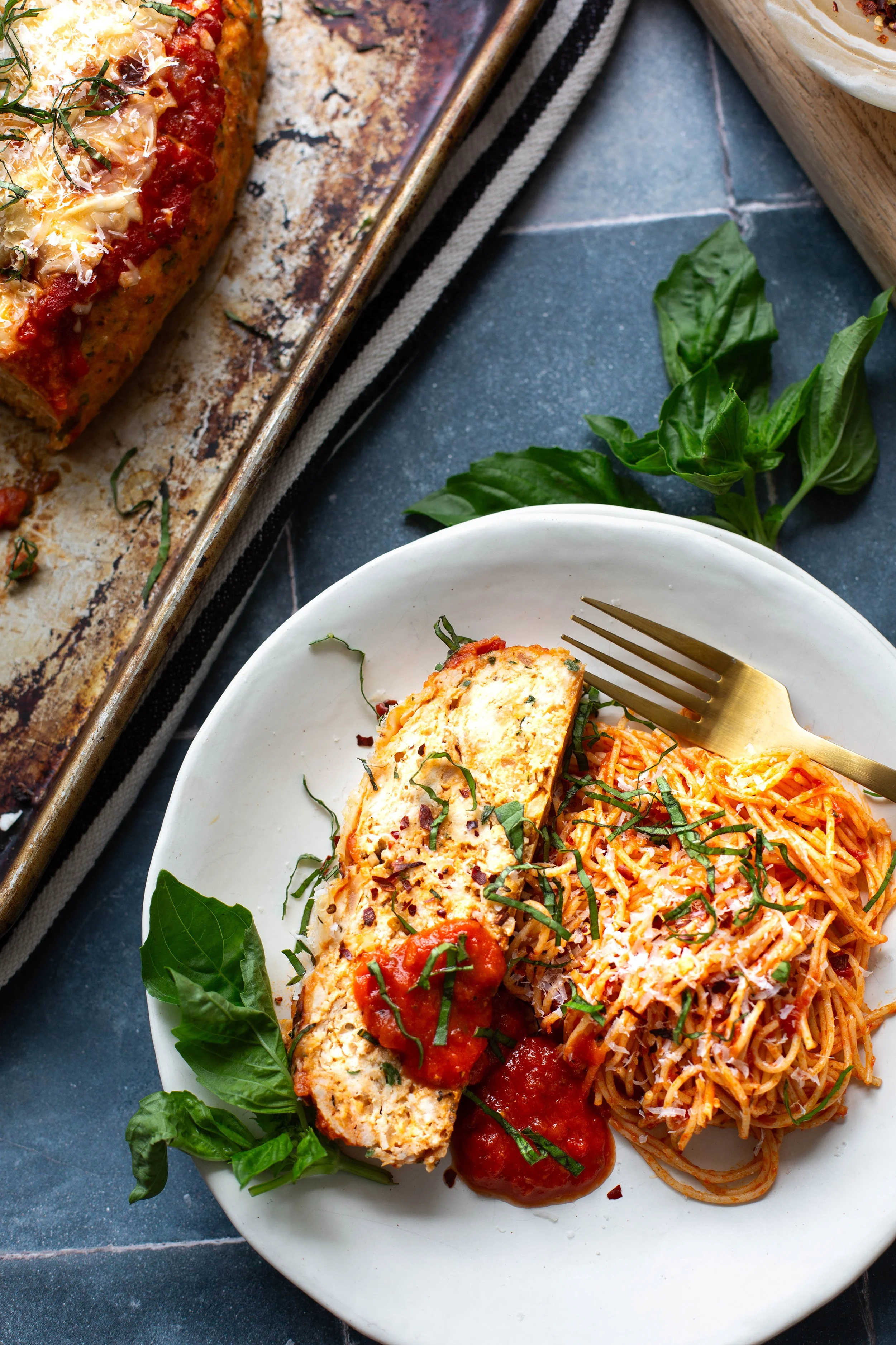 Ground chicken gets seasoned with a mixture of onions, garlic, tomato paste, anchovies, and fresh parsley to create a rich flavor in the meatloaf from the inside out. The seasoned chicken gets formed into a meatloaf shape and topped with marinara and mozzarella cheese and then baked until the meatloaf is cooked through and the cheese is melty. I top it all off with fresh basil and love to serve it alongside a big caesar salad and some pasta.