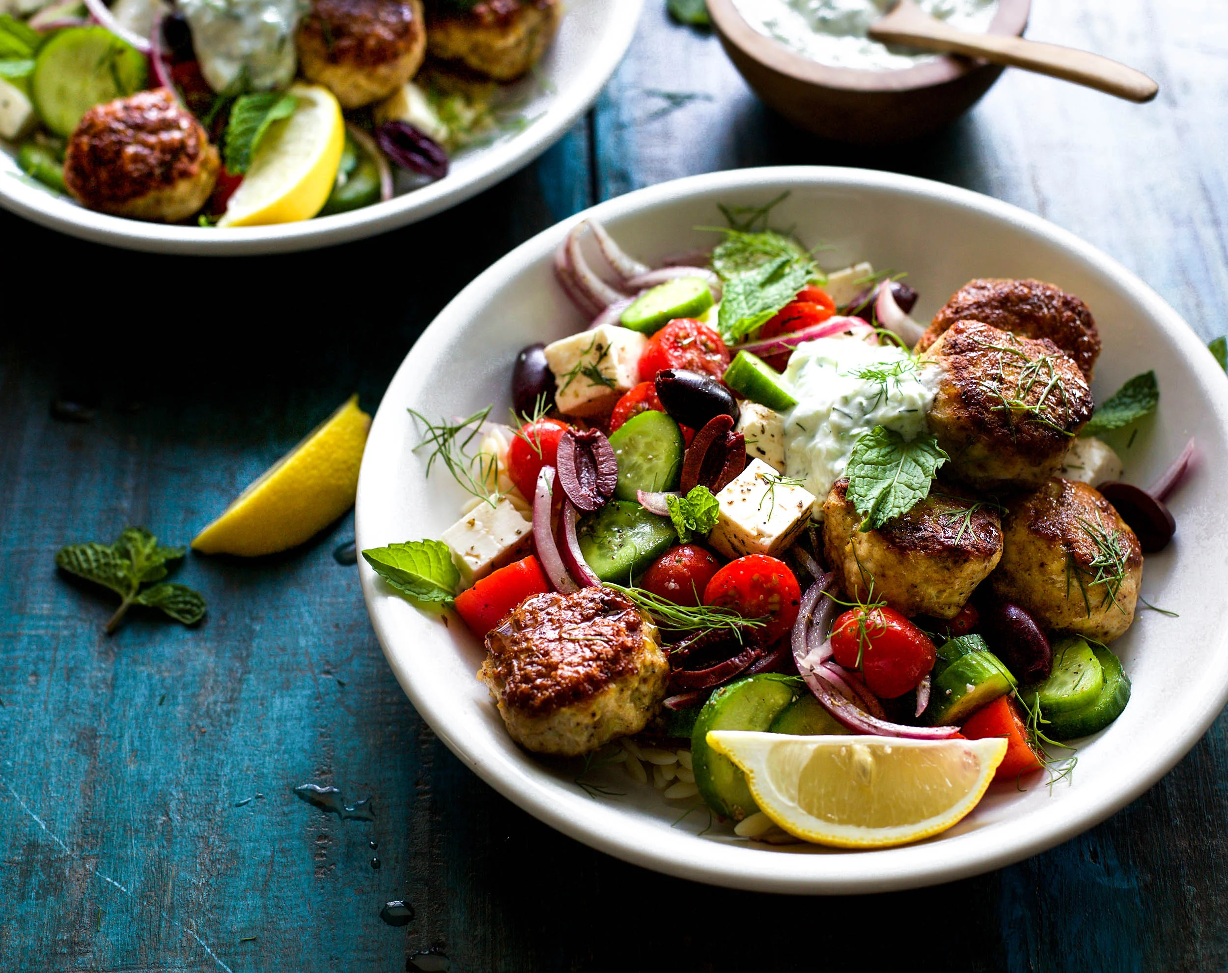 Layer cooked orzo, Greek salad, meatballs, and tzatziki sauce in a bowl and serve immediately.