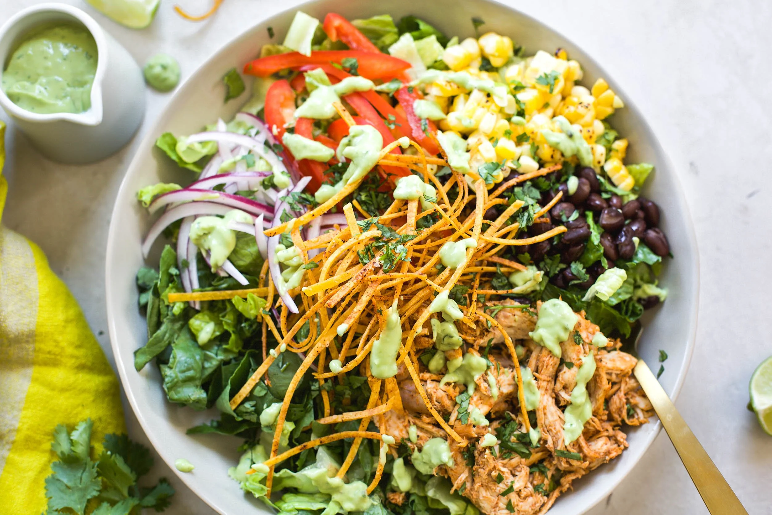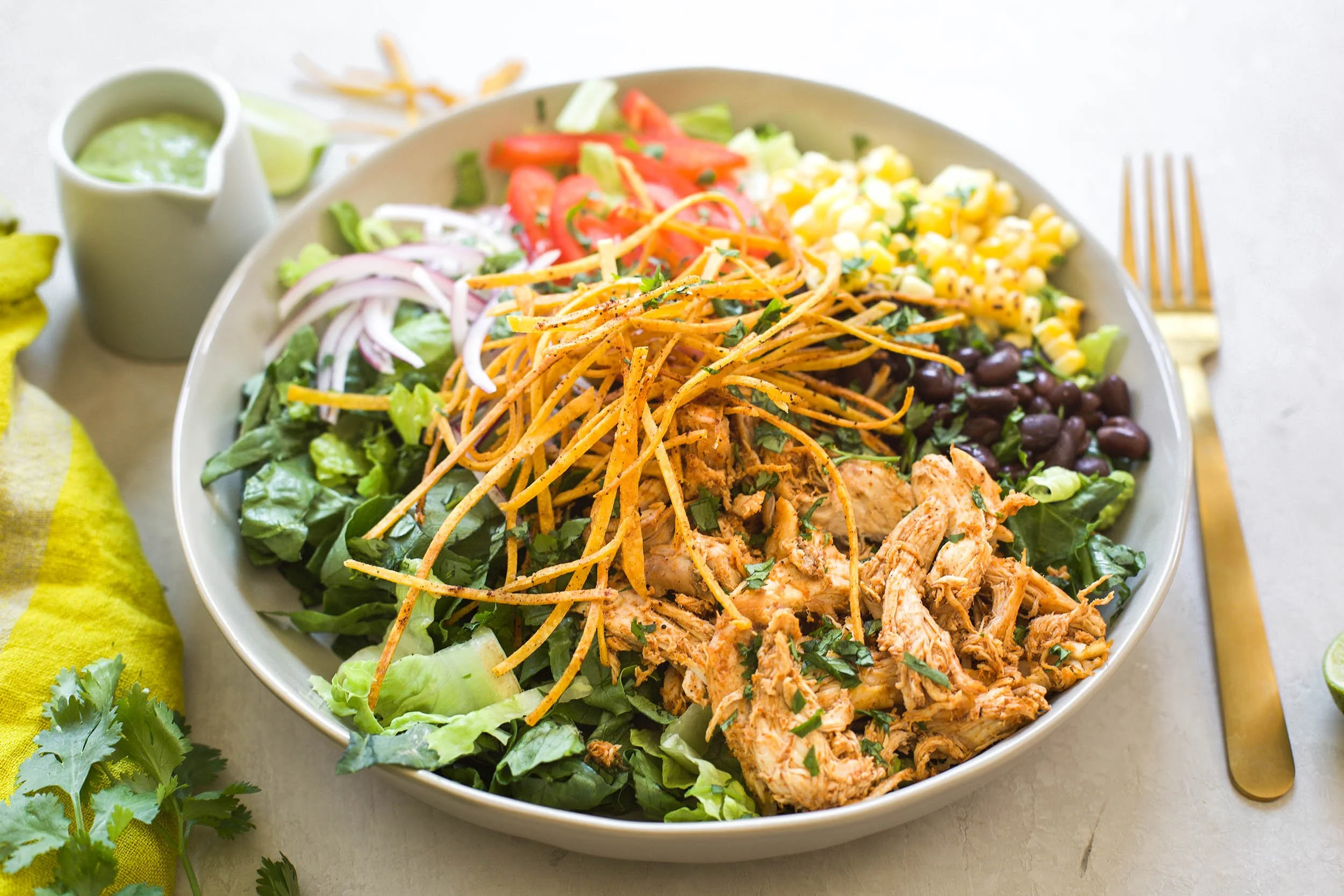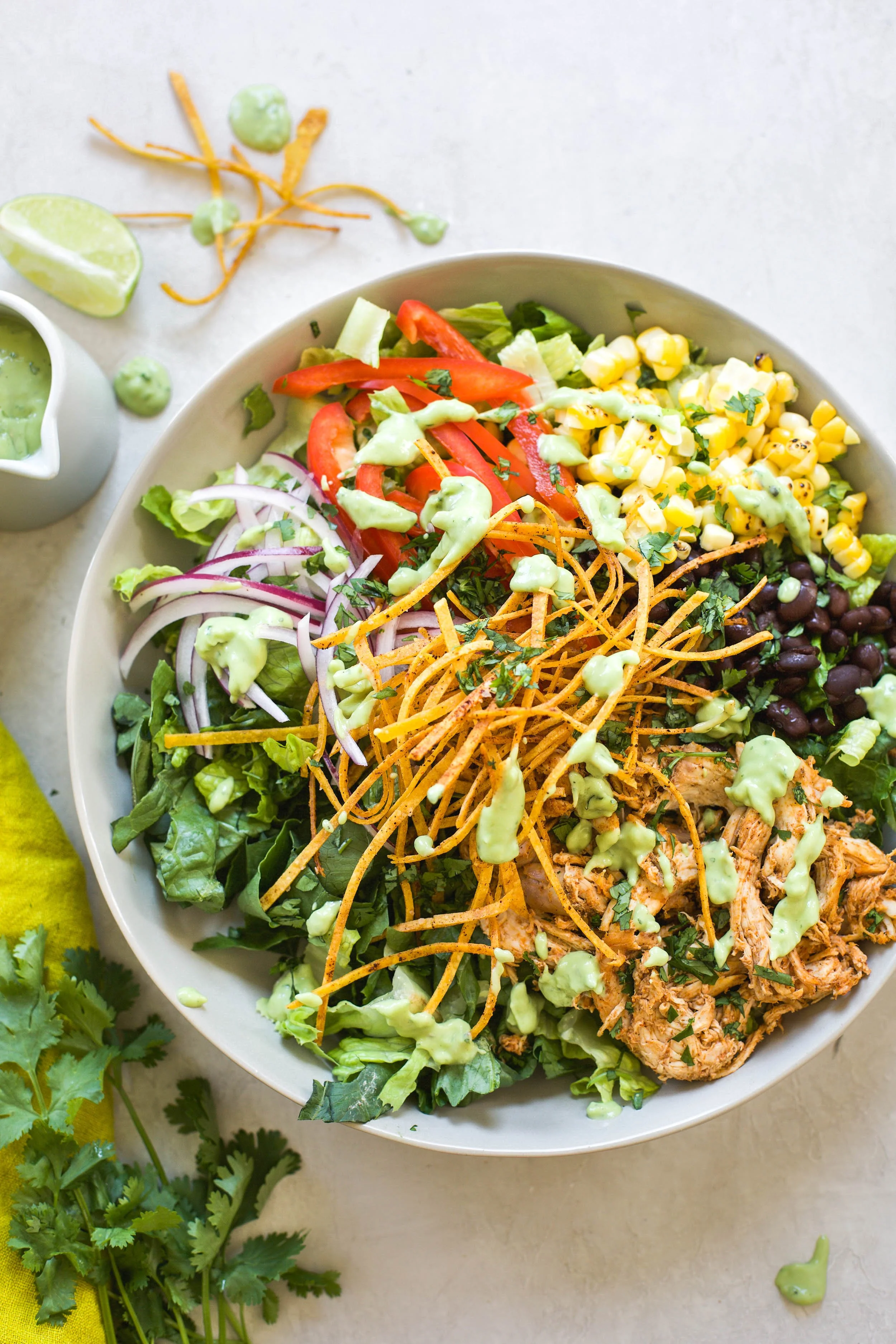You are probably familiar with chicken tortilla soup, but have you ever tried to turn that same delicious soup into a salad? I created this delicious salad using all of the same flavors you love in a chicken tortilla soup, but in salad form. It’s the perfect weeknight meal while we are transitioning into cooler weather and can be made with a store bought rotisserie chicken making this recipe a breeze on even the busiest of nights. Make the ultimate chicken tortilla salad with a creamy avocado dressing and get ready to fall in love this with recipe.