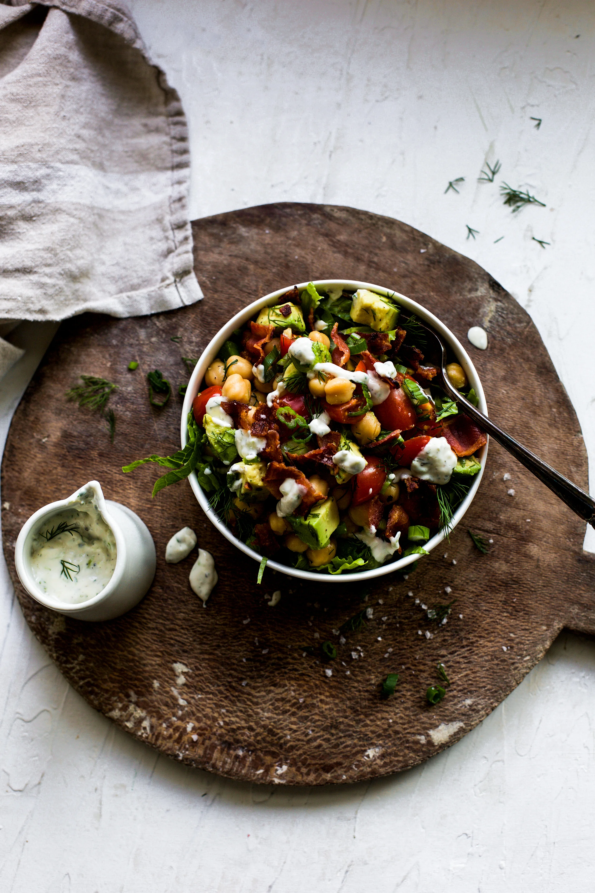 This salad is full of texture, flavor, and is hearty enough to stick with you! With healthy fats from avocado and full fat yogurt dressing, fresh herbs, and salty bacon all on top of a bed of crunchy romaine, you are going to love satisfying your BLT craving in a new way that is a bit healthier and lighter!