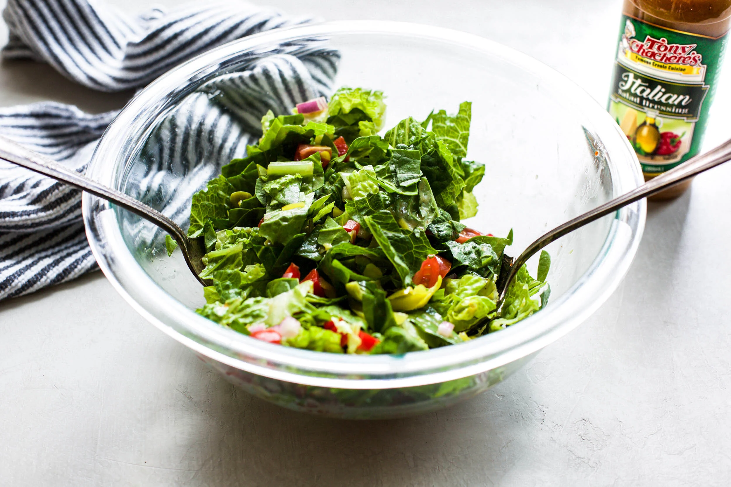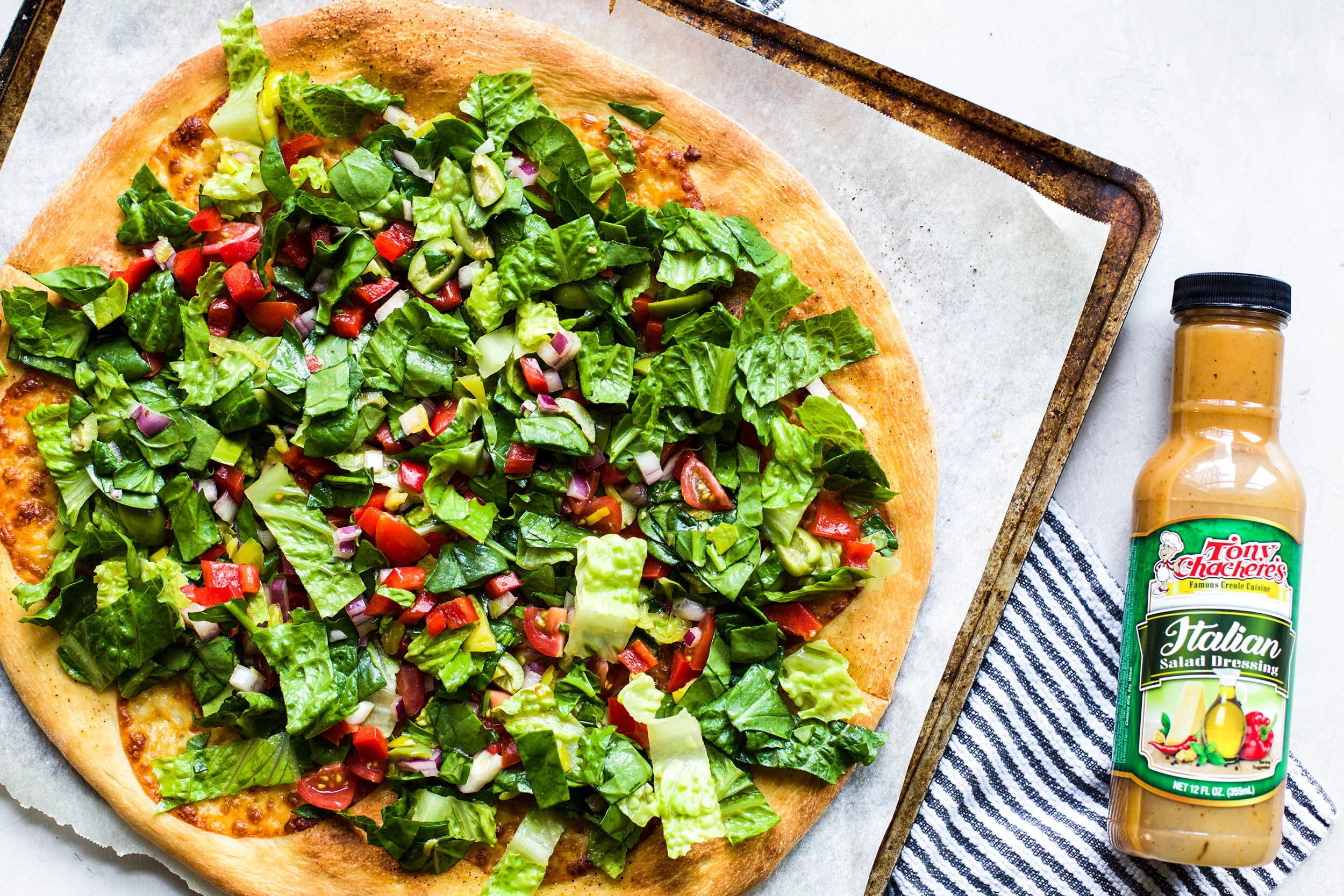 You could really do any type of salad combination on top of your pizza that you prefer, but I like pairing a crunchy Italian chopped salad dressed perfectly the right amount of Tony Chachere’s Italian Dressing for a little zing on top of the pizza. The salad has great texture and flavor and it pairs perfectly with a cheesy pizza crust. You could add a meat like salami or pepperoni into the chopped salad if desired, but this pizza is perfectly satisfying as is. While I am a fan of making my own dressings from time to time, Tony Chachere’s just released three new salad dressings that are perfect to keep in your pantry to add flavor to salads and so many more meals. I ended up using Tony Chachere’s Italian Dressing in this recipe, however, the Ranch Dressing and the French Dressing would also be delicious choices if you prefer them.