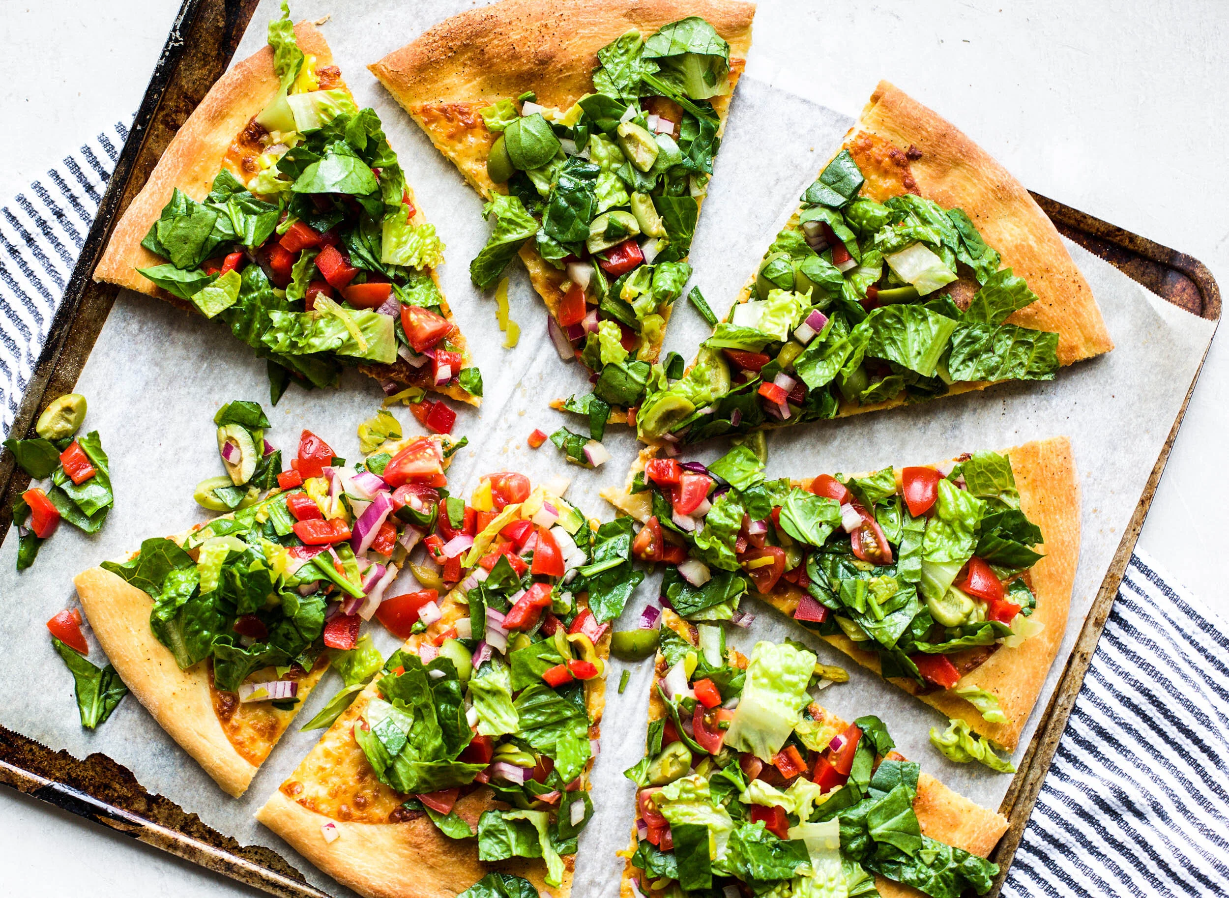 While the pizza bakes, chop all salad ingredients small and mix in a bowl.