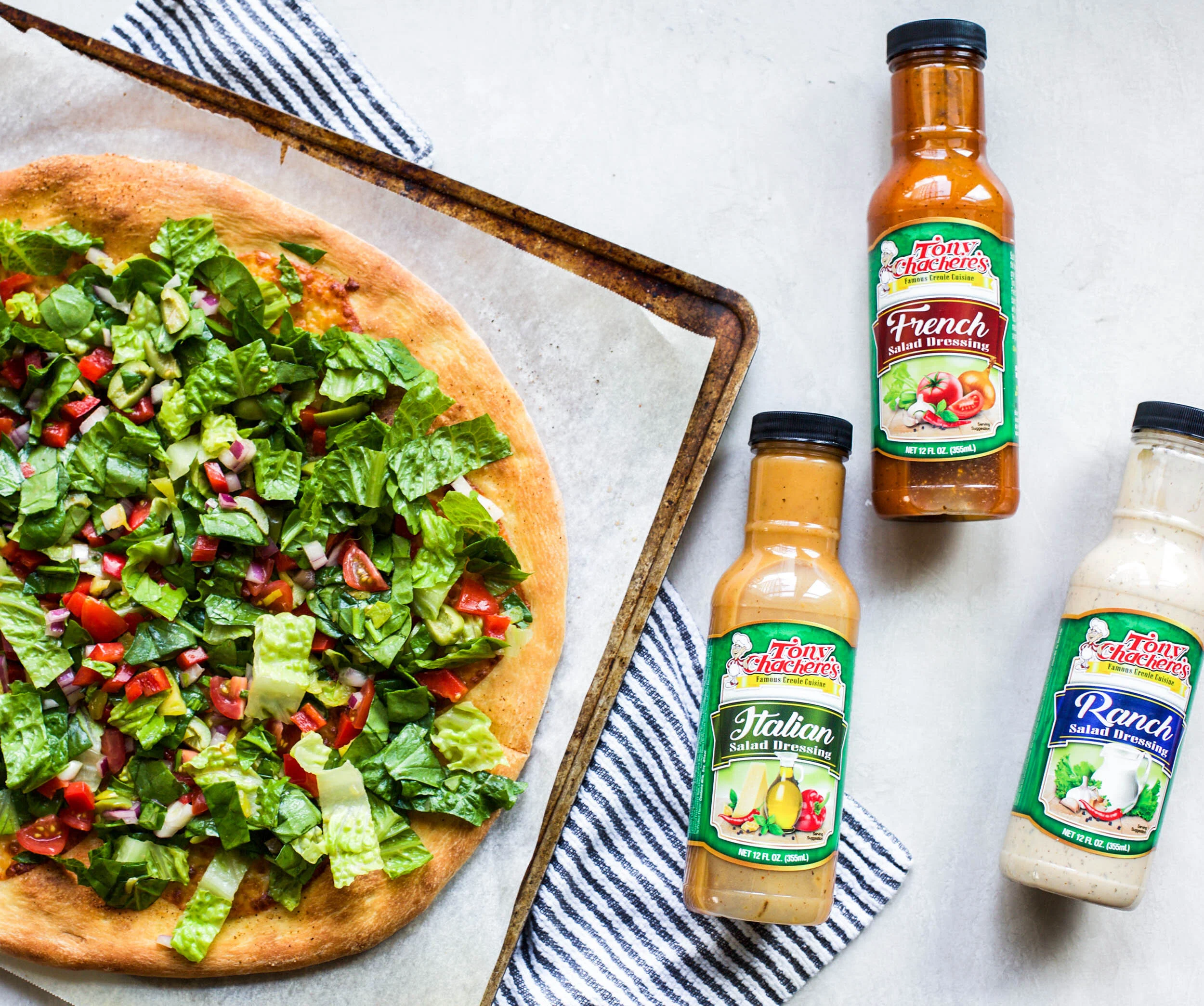 Pizza is one of those meals that I know my family will be on board with any night of the week. I started making my own pizzas years ago once I realized how easy and how delicious it could be. With the availability of store bought pizza dough in regular grocery stores nowadays, making homemade pizza has never been easier. I partnered with Tony Chachere’s to bring you a chopped salad pizza using their new line of salad dressings that combines pizza and salad together in perfect harmony. You may be thinking, salad on pizza? But trust me, it’s the best of both worlds and makes me feel a little better about serving up my weekly pizza to my family! Plus anytime I can get my toddler to eat more salad, is a meal that I will continue to make over and over. My chopped salad pizza is going to quickly become one of your family’s new favorite ways to eat pizza!