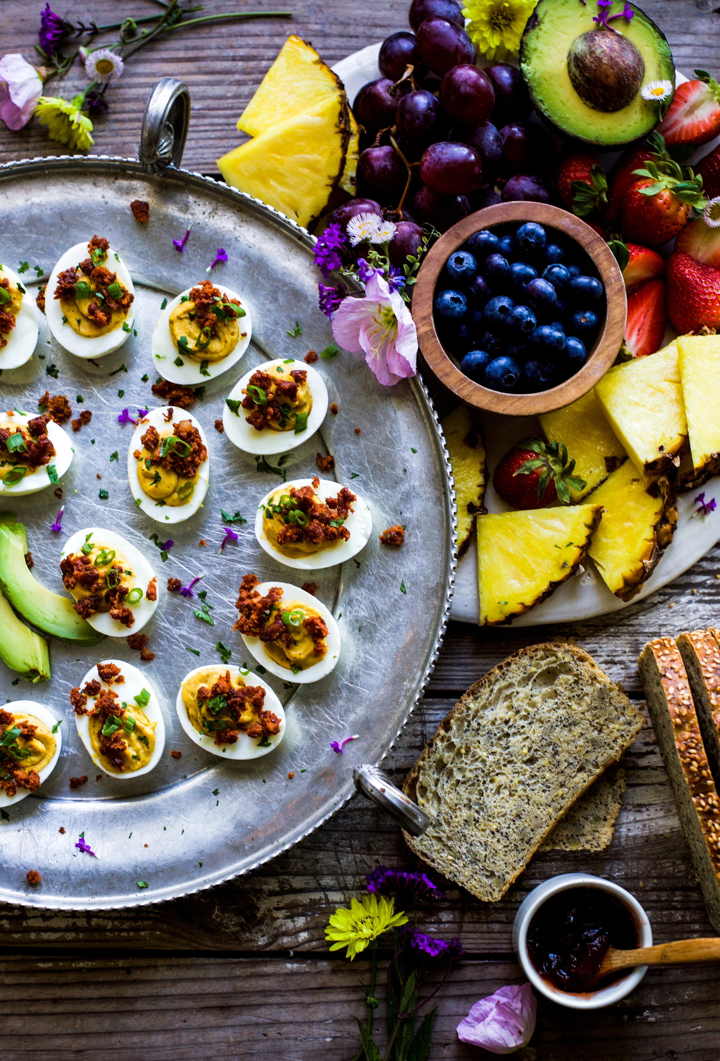 Go ahead and boil and peel your eggs a few days in advance and you can even make the filling ahead of time and simply pipe into the eggs the day before or Easter morning! I have kept these deviled eggs in the fridge for up to two days in advance and they hold up perfectly! I think putting them on a platter and serving them alongside some yummy toast and an assortment of fruit is a really easy and beautiful brunch idea all on it’s own too!