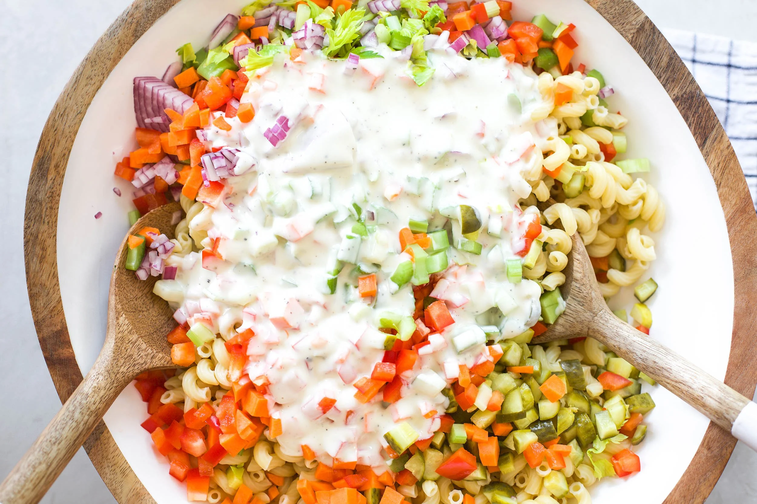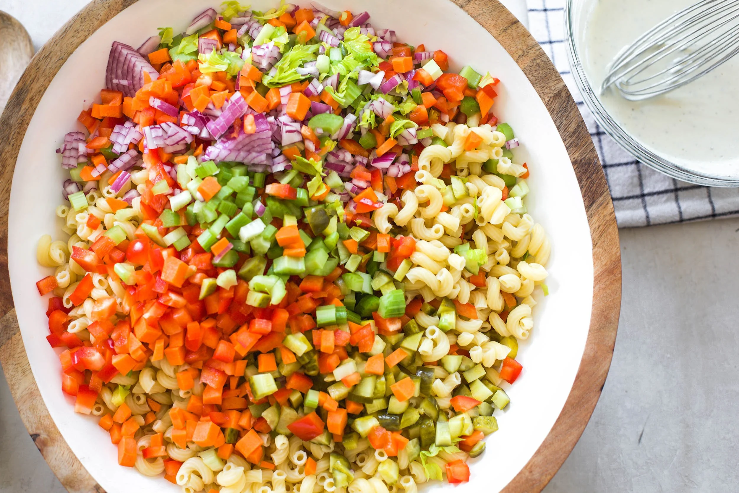 The dressing is a mayonnaise based dressing, but I like to cut it with some Greek yogurt and then add white vinegar, sugar, salt, pepper, and some dijon mustard to create a delicious savory with a touch of sweet creamy dressing that is perfect for coating the pasta and crunchy vegetables. Once mixed, the macaroni salad gets chilled and the flavors get even better!