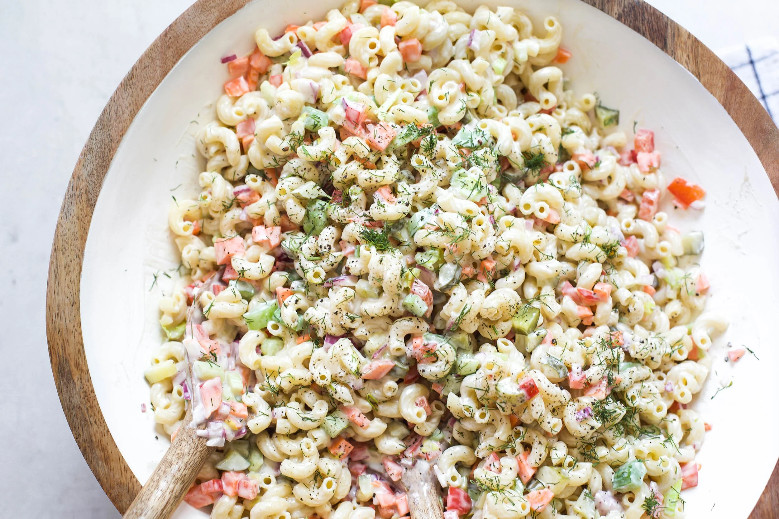 Summer is almost here which means BBQ and picnic season are quickly approaching. Macaroni salad is a classic summer side dish that is perfect for bringing to a friends house or serving alongside your favorite main dishes. it’s one of those recipes that everyone loves and you truly can’t go wrong with it. I lightened my version up a tad by cutting the mayo with Greek yogurt and reducing the amount of sugar that is traditionally used plus I add a ton of crunchy veggies for texture and flavor. This recipe for classic macaroni salad will surely become one of your new favorite dishes to make all summer long!