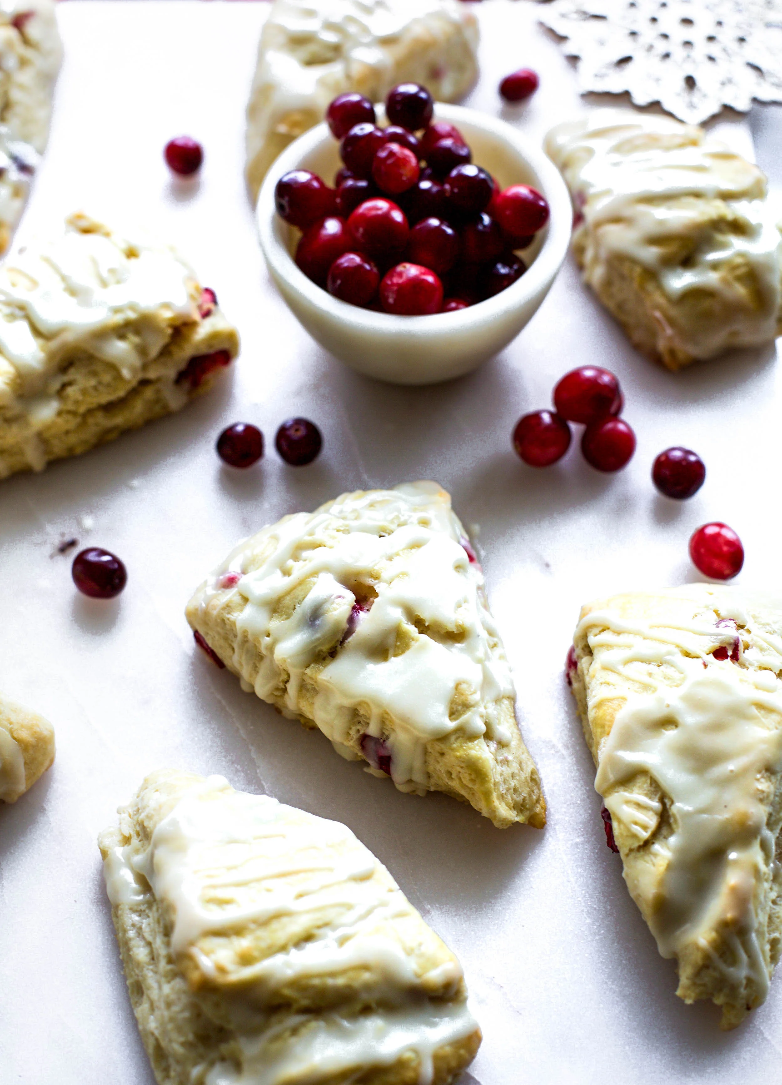 Egg nog is one of my favorite ingredients to use at this time of year to really infuse desserts with flavor without having to add a ton of ingredients. Because it’s already spiced with all of the holiday flavors and the base is basically cream and milk, it’s the perfect base for an ice cream, or to use in baked goods like scones! The richness from the egg nog pairs perfectly with the tart cranberries and makes for a super festive breakfast addition all season long.