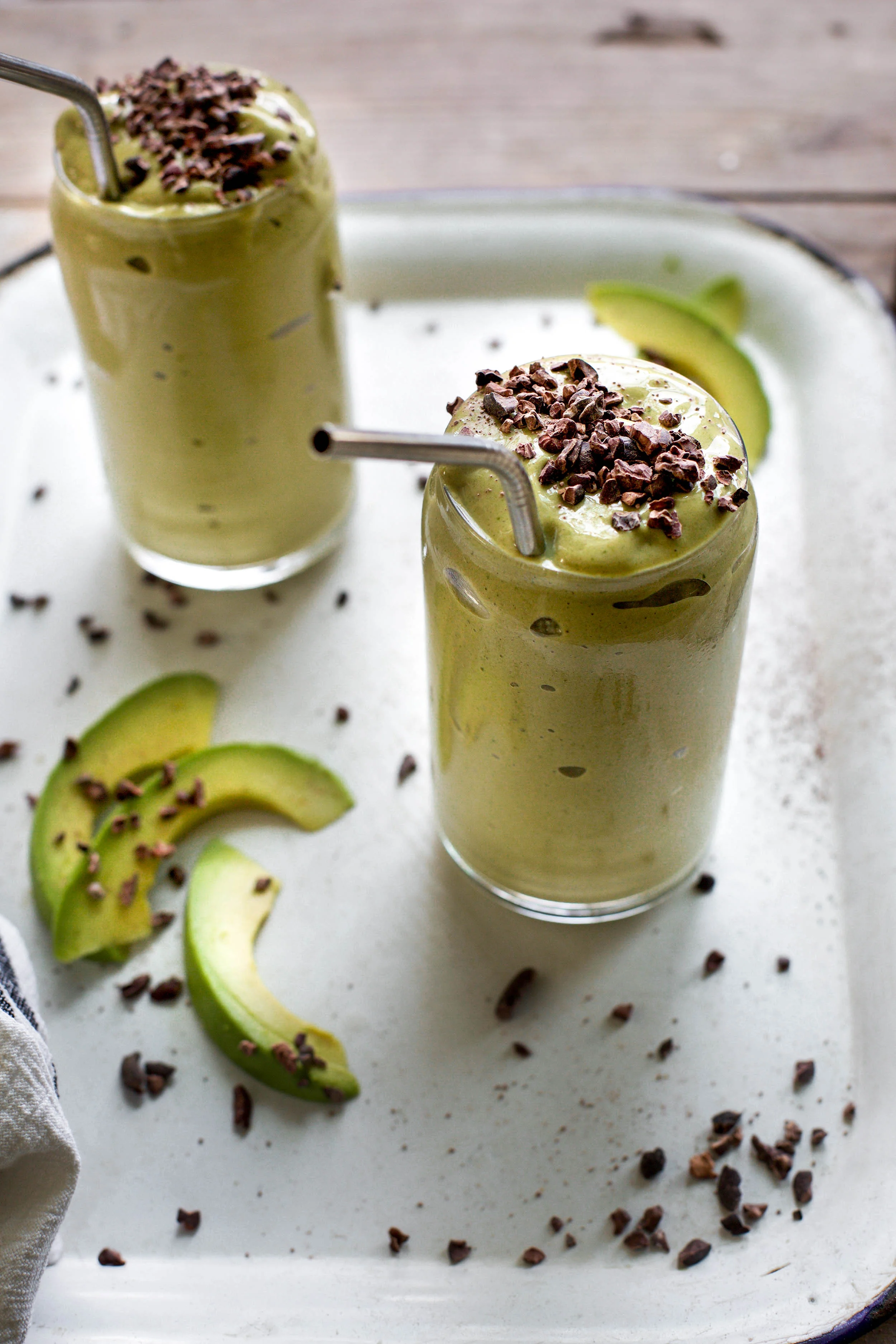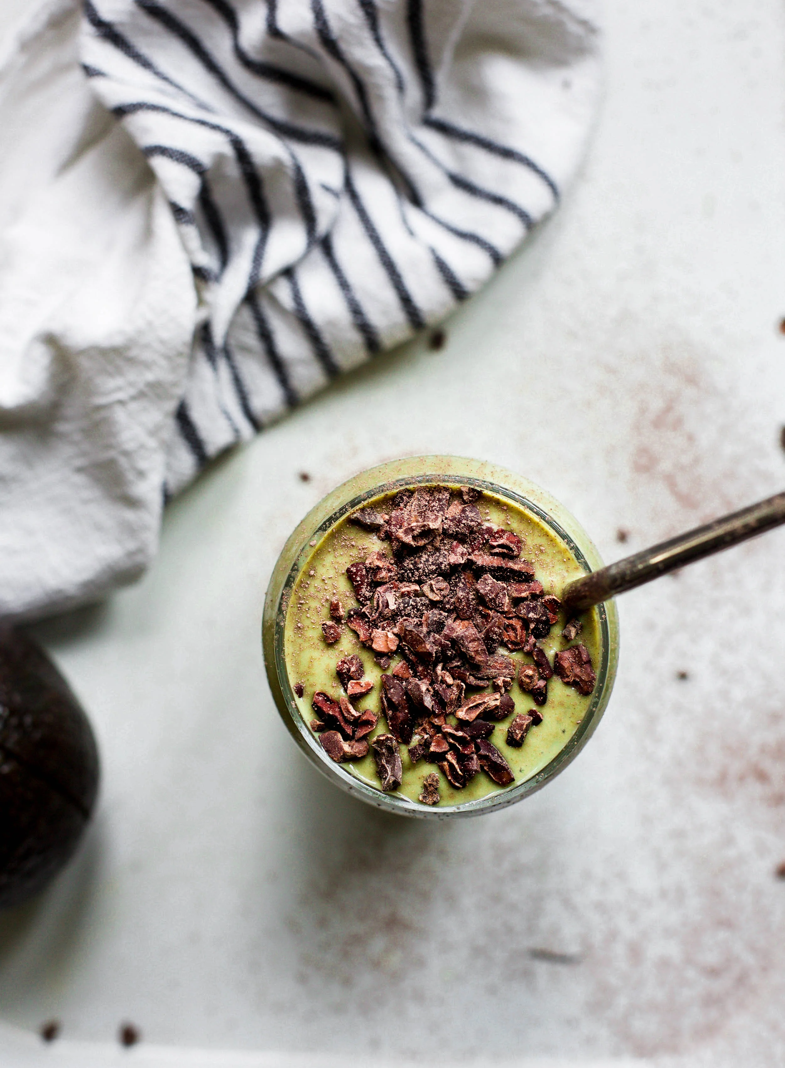 Pour into a glass and sprinkle with organic cacao nibs.