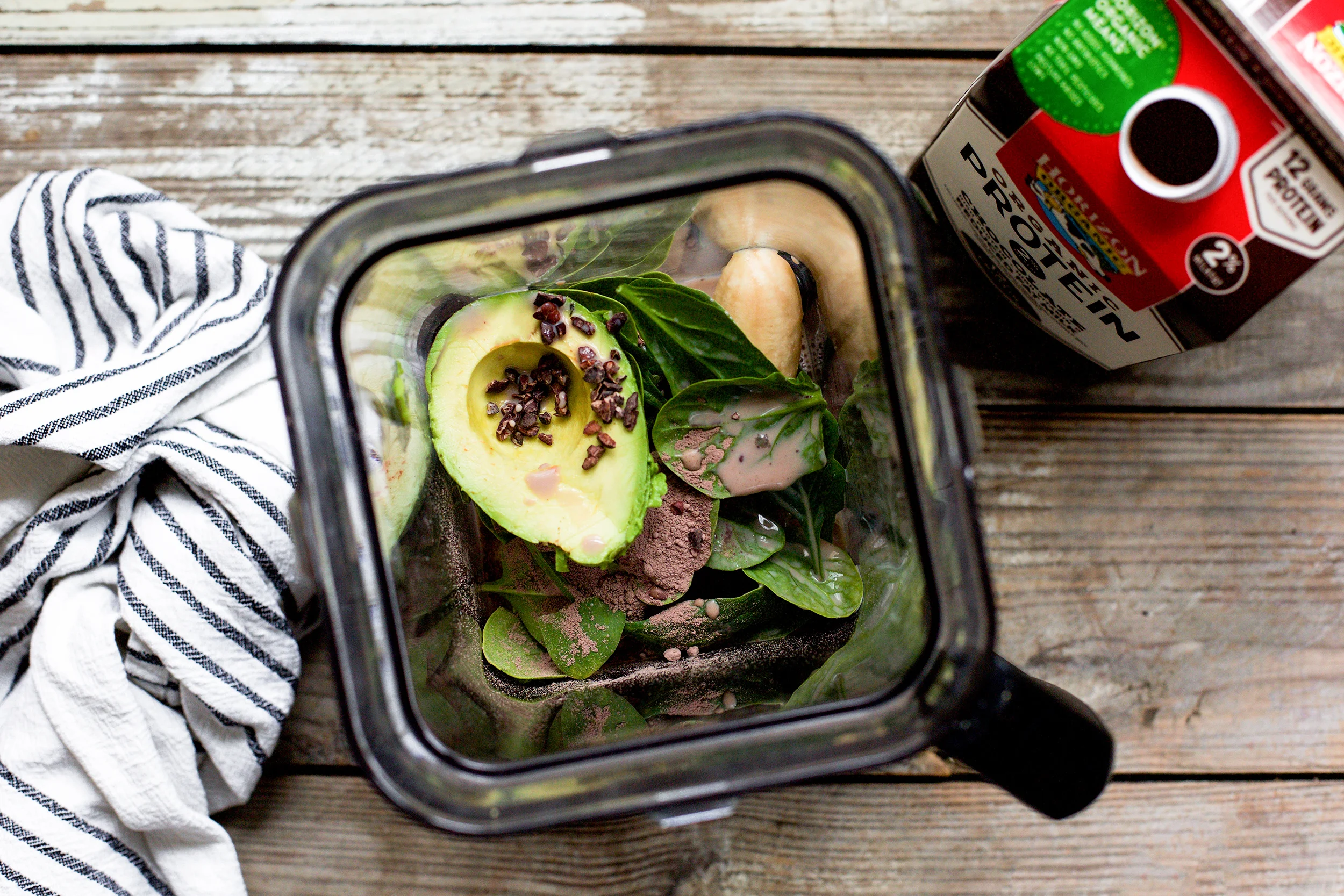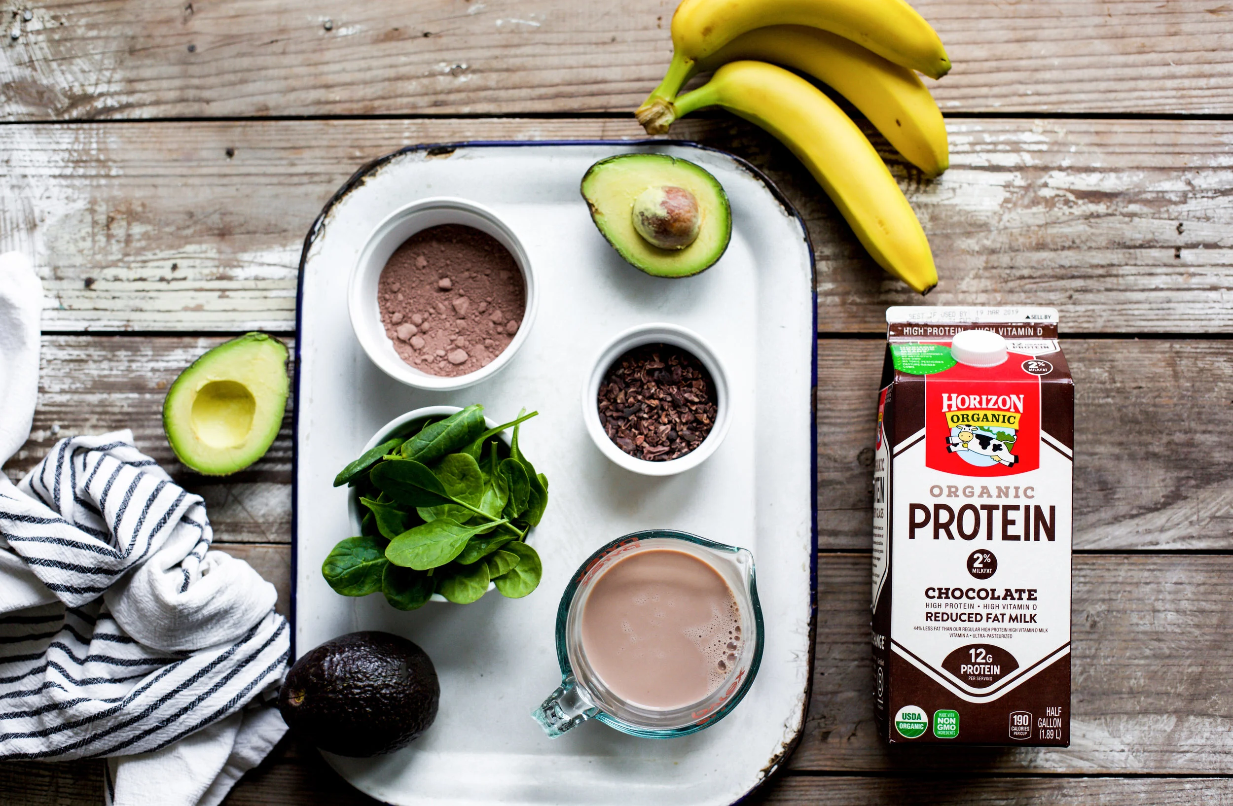 I created a creamy avocado cacao smoothie that could easily pass as dessert but is loaded with some serious nutrition! This smoothie has a full serving of spinach, fruits, healthy fats and, thanks to New Horizon Organic High Protein Chocolate Milk, has a complete source of dairy protein! The chocolate milk makes this smoothie extra smooth and delicious, and you are going to love it!