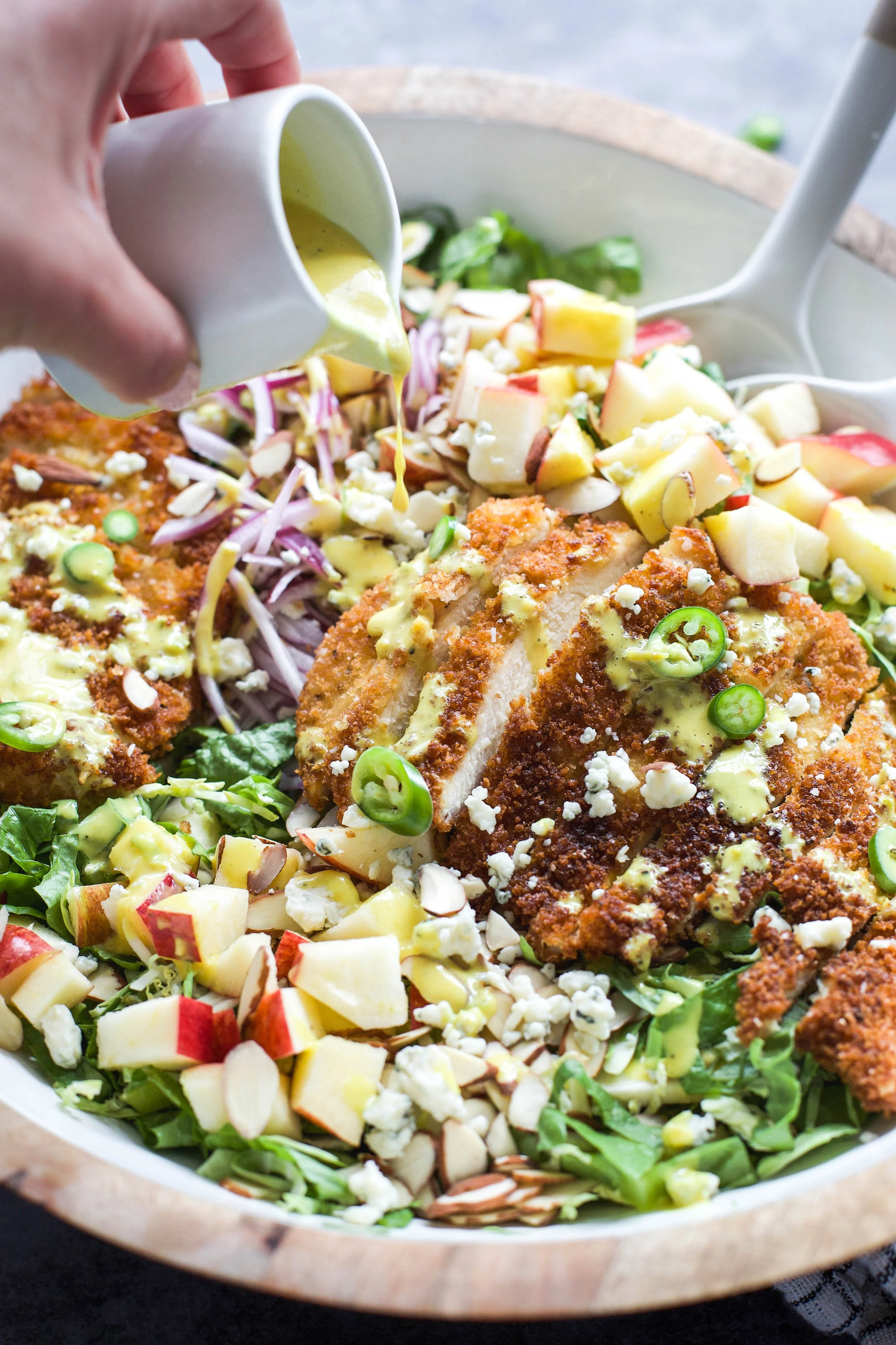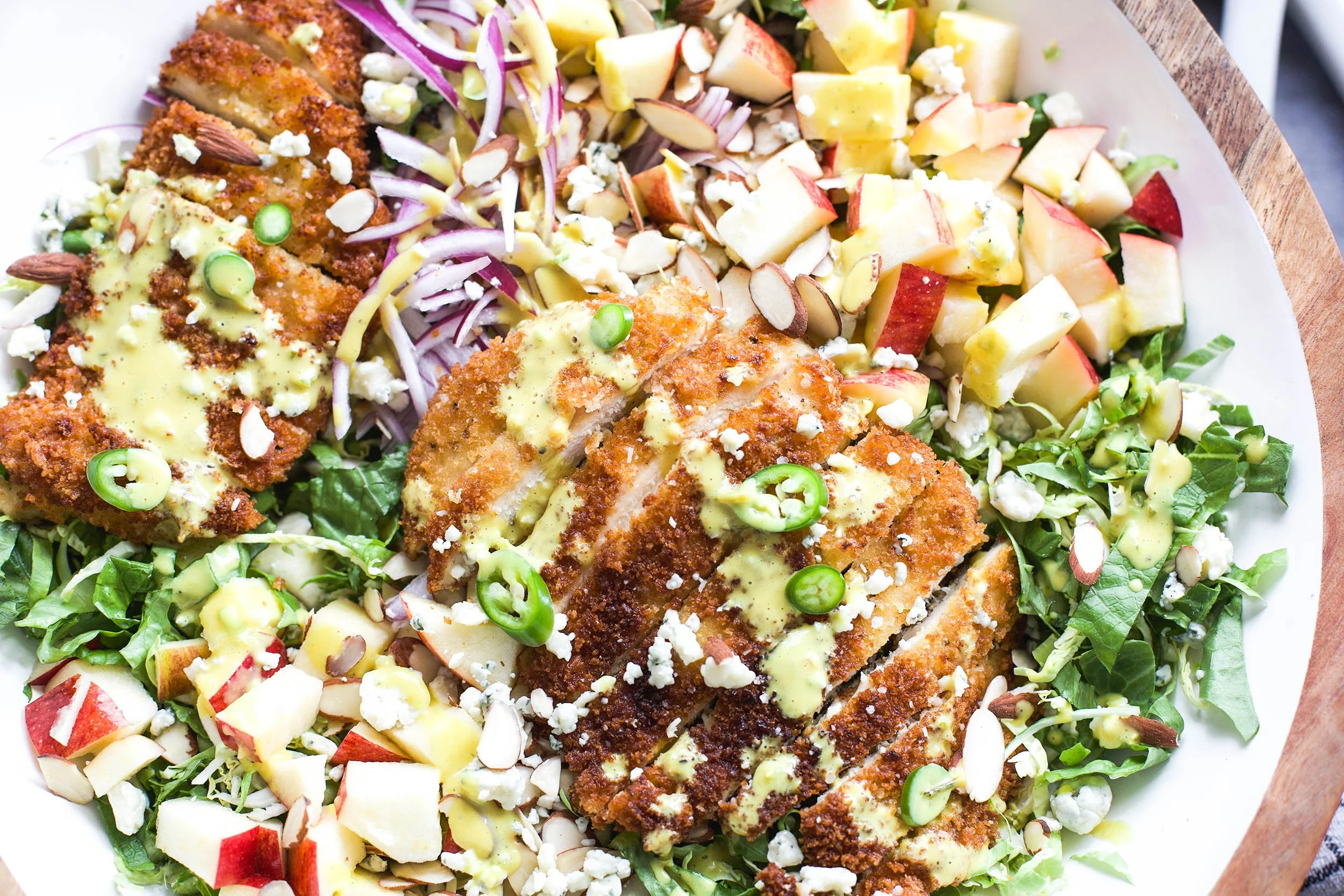 This salad has a base of thinly sliced romaine lettuce and shaved brussel sprouts and is topped with crunchy almond slices, apples, blue cheese, a little red onion, and the best crispy chicken cutlets. The dressing is a spicy honey mustard that has roasted serrano peppers, honey, two different mustards, a little mayo, and vinegar. It might sound odd, but trust me this dressing is going to blow you away when you try it out! It’s amazing on this salad with all of the other flavors, but it is so good that you might want to keep it in your fridge at all times for a dipping sauce too.