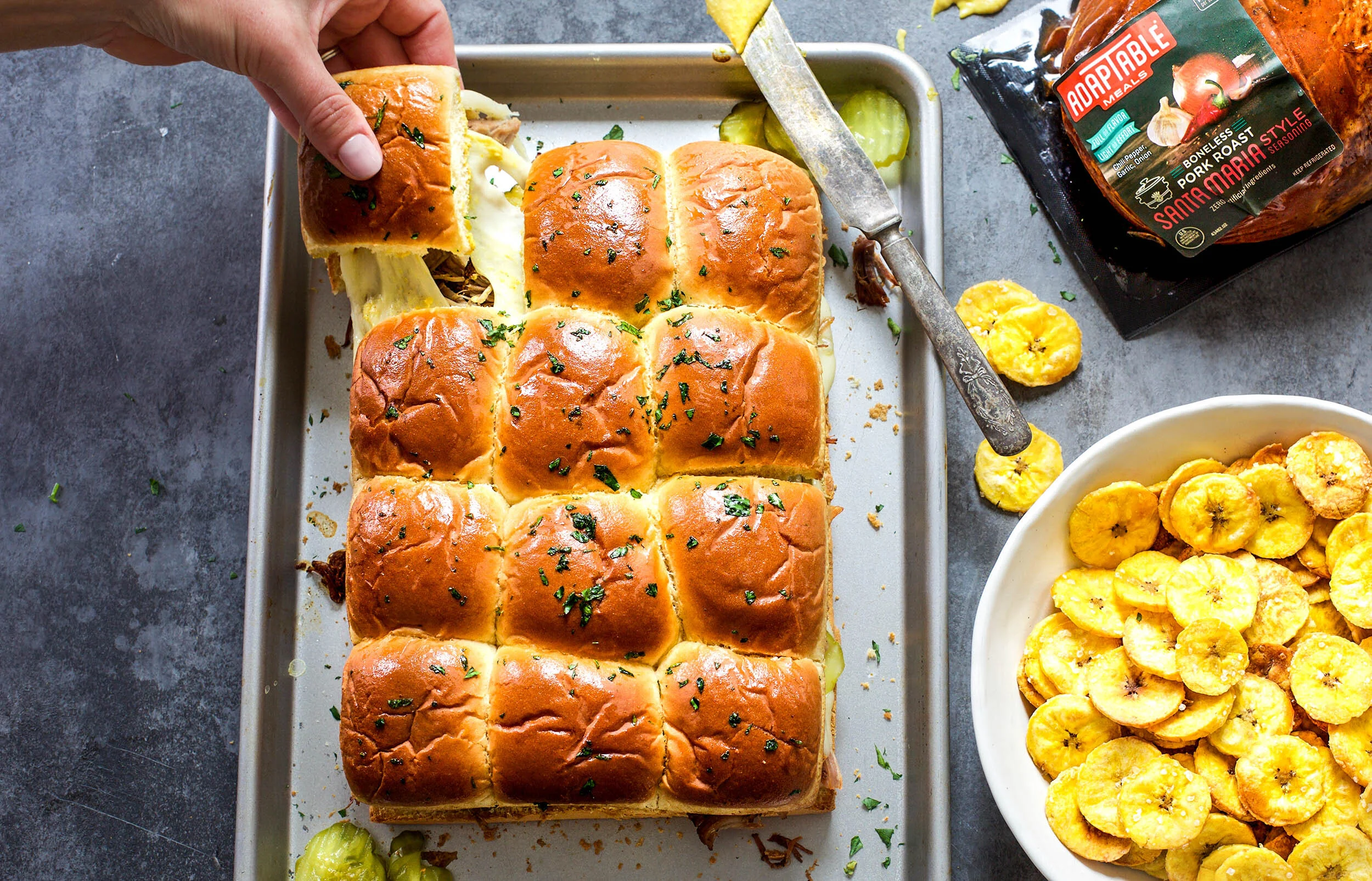 Cuban sandwiches are one of those iconic sandwiches that I love getting when I am out at a restaurant. I find it hard to find the classic Cuban sandwich bread, so I rarely make them at home. However, I partnered with my friends at AdapTable Meals to bring you a fun recipe that delivers the delicious flavors of a Cuban sandwich right at home without having to find special bread. I created a recipe for out-of-this-world Cuban sliders using AdapTable Meals Santa Maria Pork Roast, complete with a side of baked plantain chips. They are the perfect combo and so tasty too!