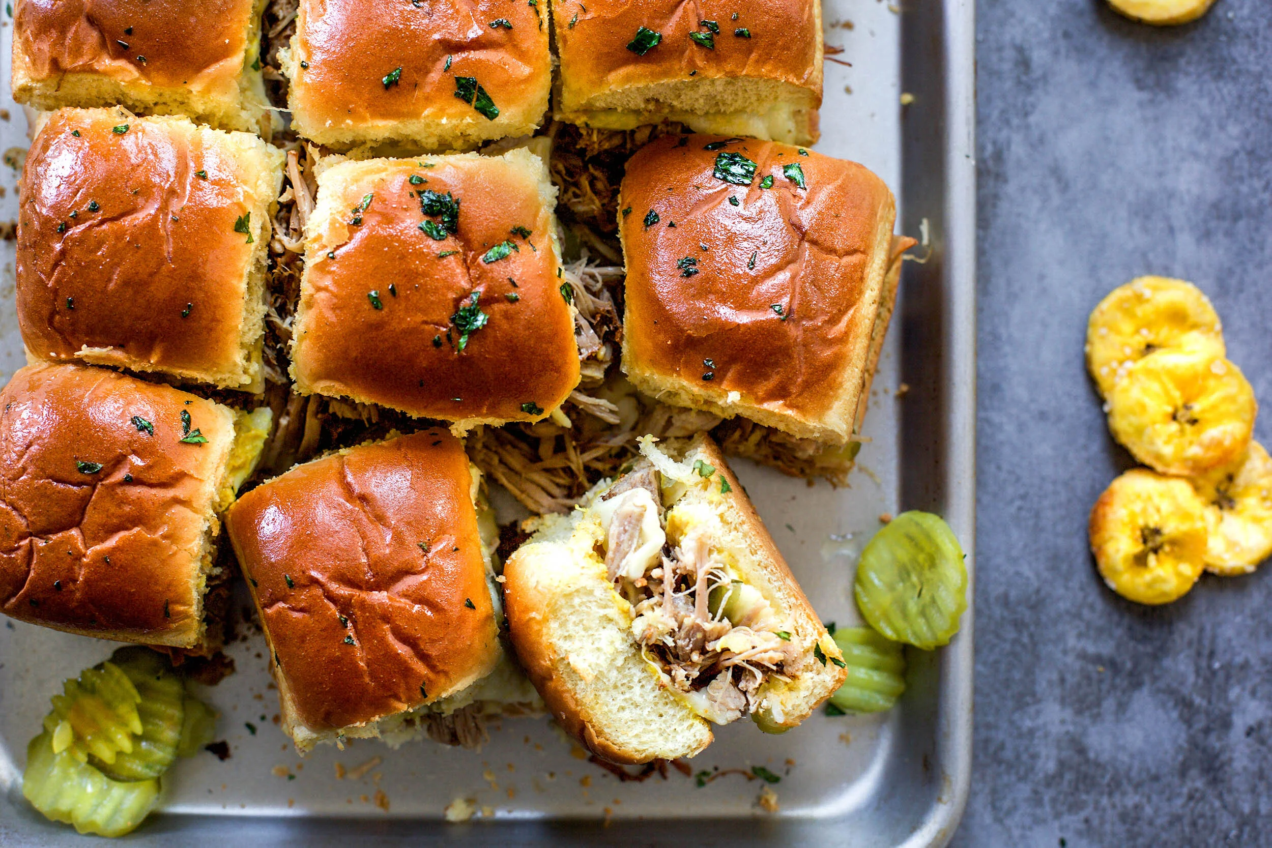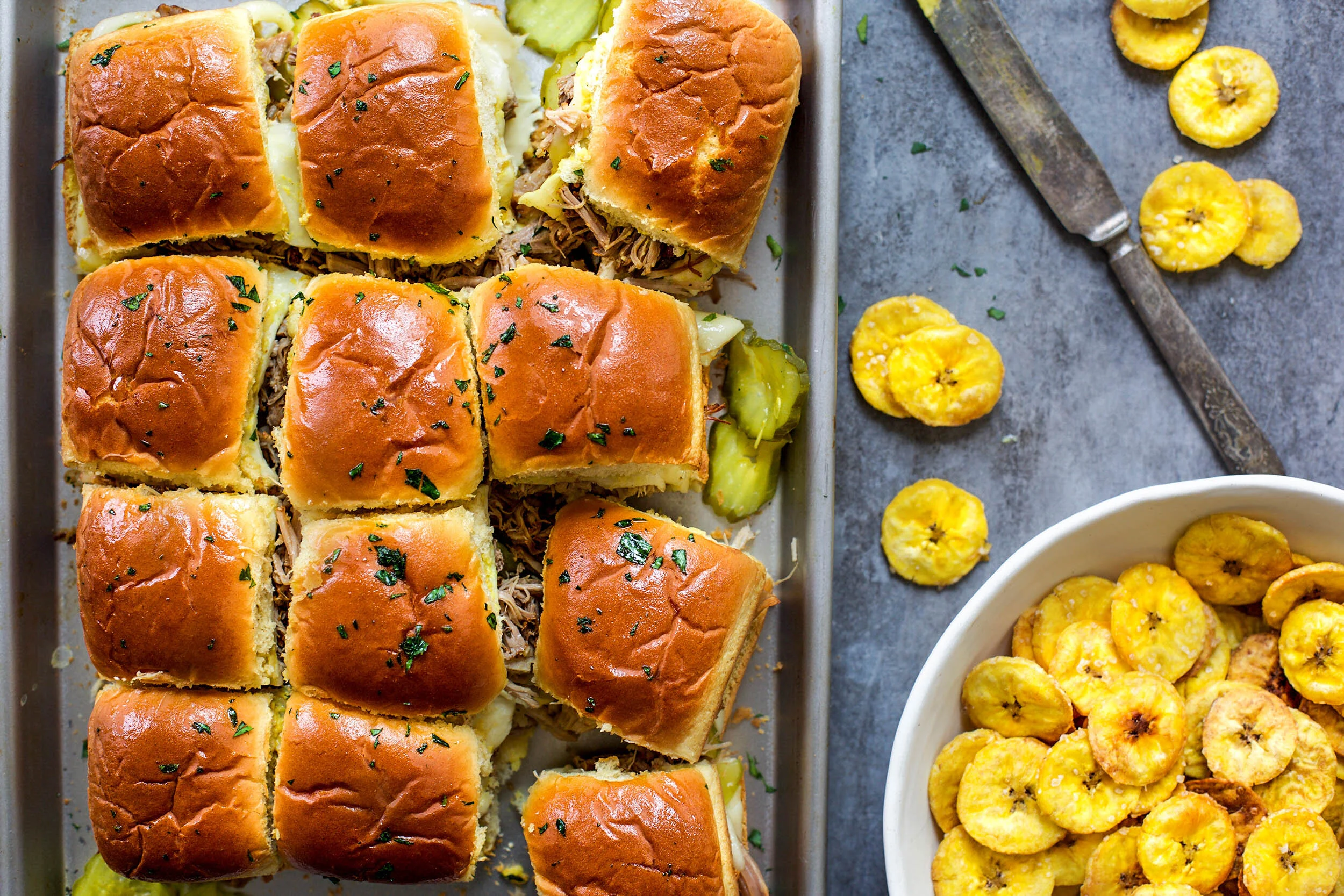 Speaking of a no-brainer meal idea, I am not even kidding you when I say these sandwiches are 100% addicting and also super easy to make. Tender roasted shredded pork, melty cheese, mustard, and tangy pickles get sandwiched between toasted dinner rolls for the ultimate sandwich, and each bite is better than the last. I bake some plantain chips to serve on the side to complete the meal. My family never can get enough of this recipe. These sliders are not only great for weeknight cooking for the whole family, but they are also great for entertaining a small group of family or friends. I promise you that they will be a crowd pleaser every single time.