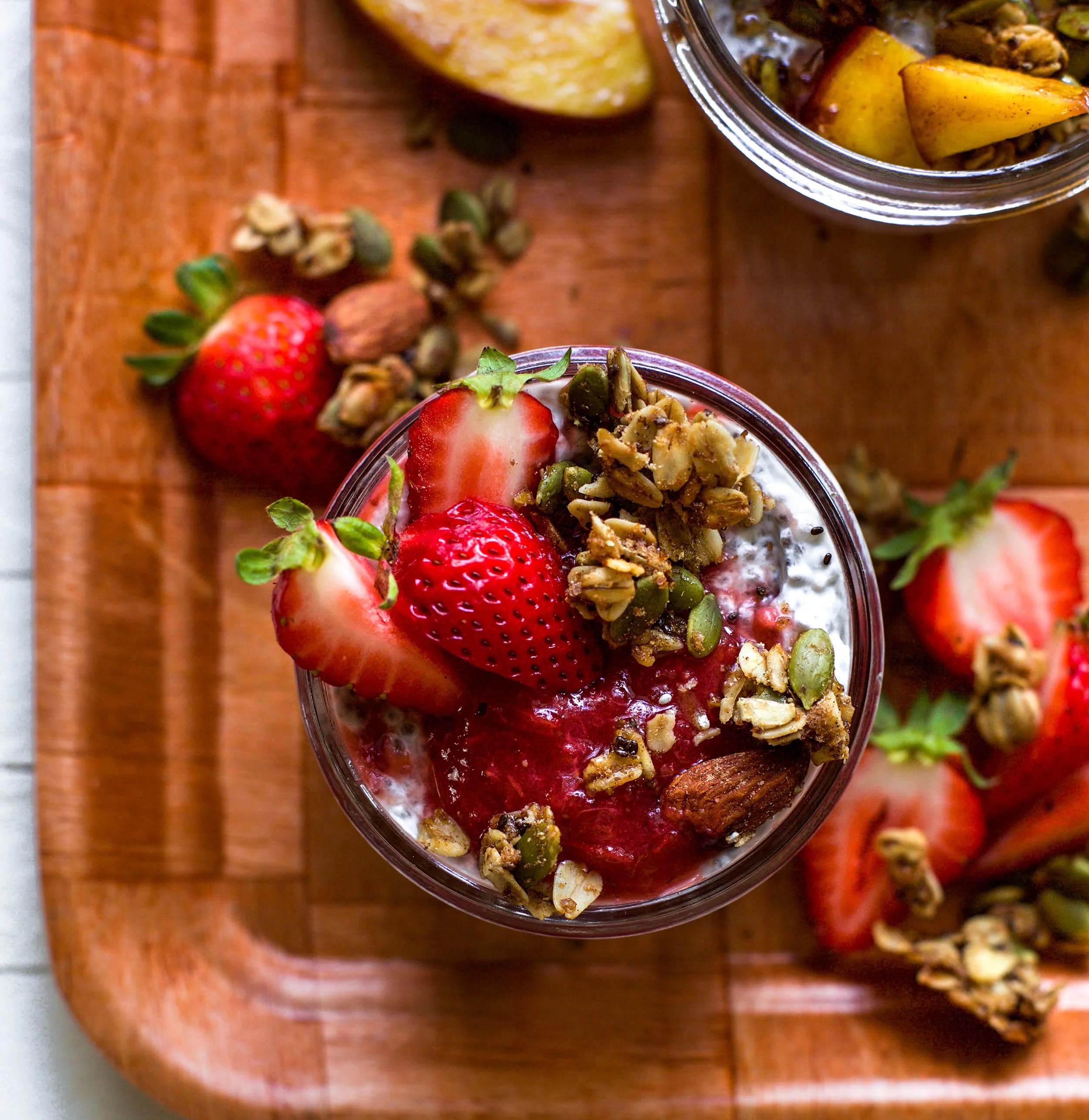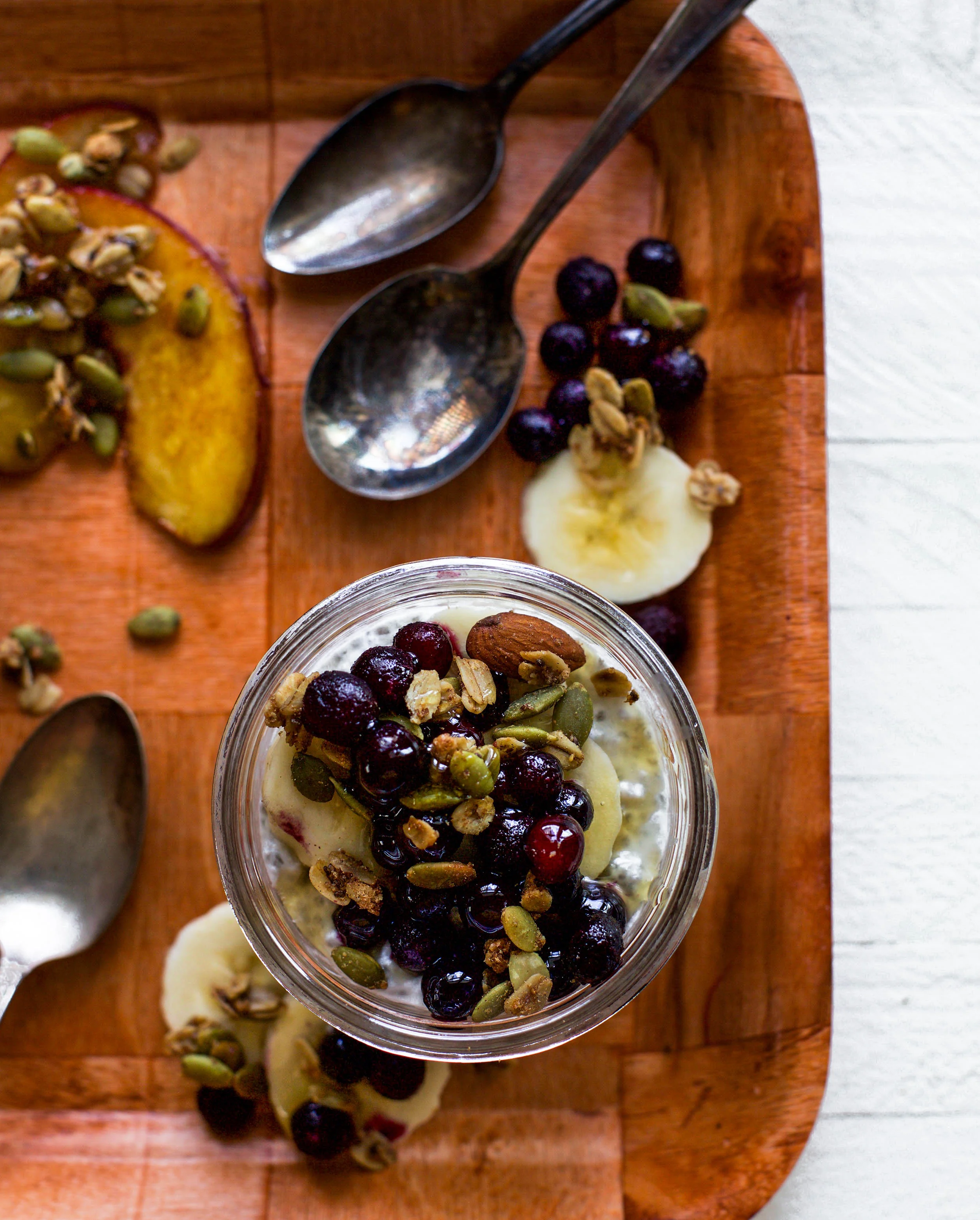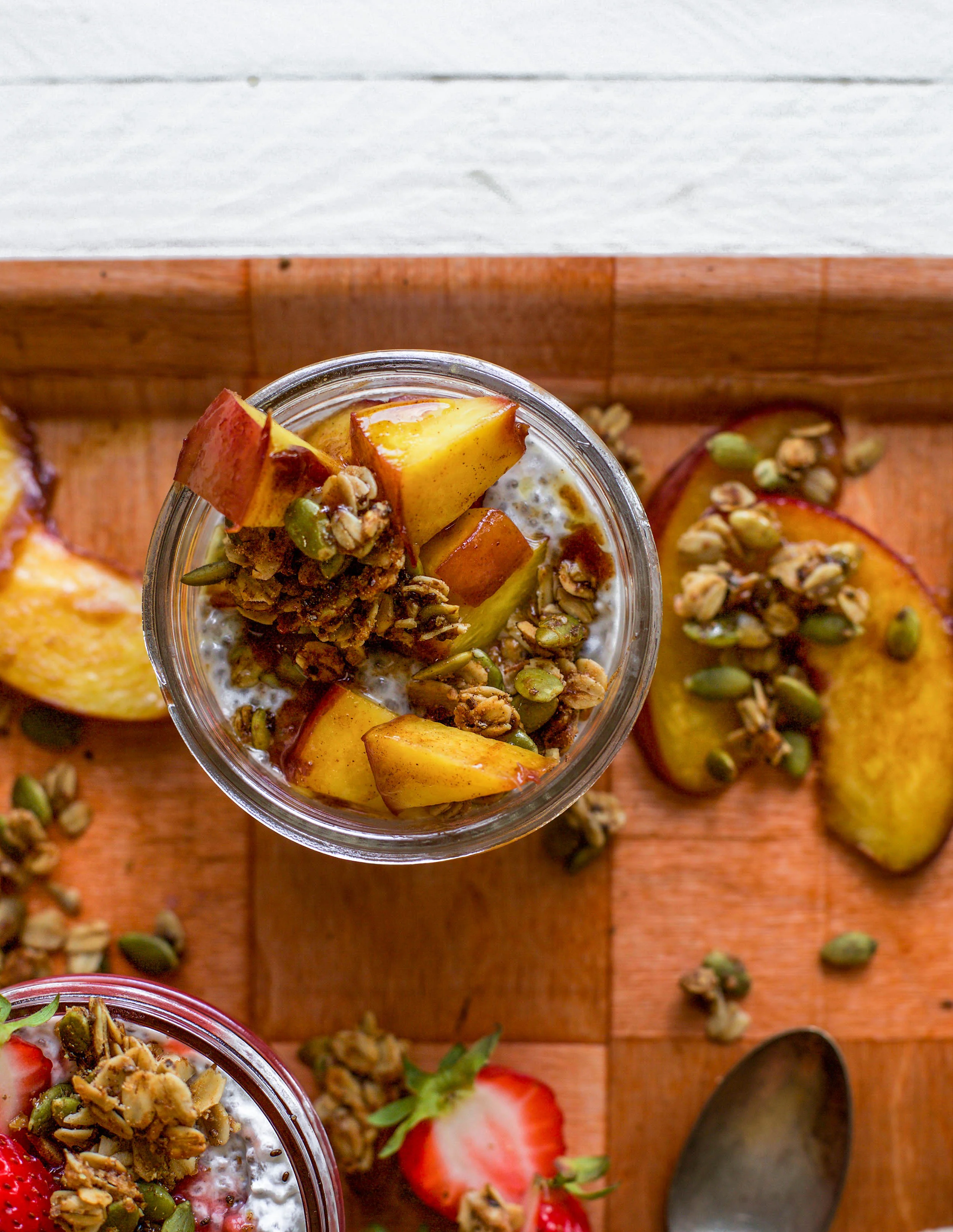 You can literally top chia pudding with whatever ingredients you have on hand, but I have created three different combos that are my favorite way to enjoy chia pudding at the moment! Strawberry rhubarb compote + granola, brown sugar peach, and blueberry banana are just a few options for how you can enjoy your pudding and man oh man are they good! You can prep a week’s worth of chia puddings in mason jars and then simply top them the morning of with your desired toppings! I like to prep the toppings to so that it takes less than a minute to get breakfast ready to go, plus you can use the toppings on yogurt or whatever throughout the week as well!