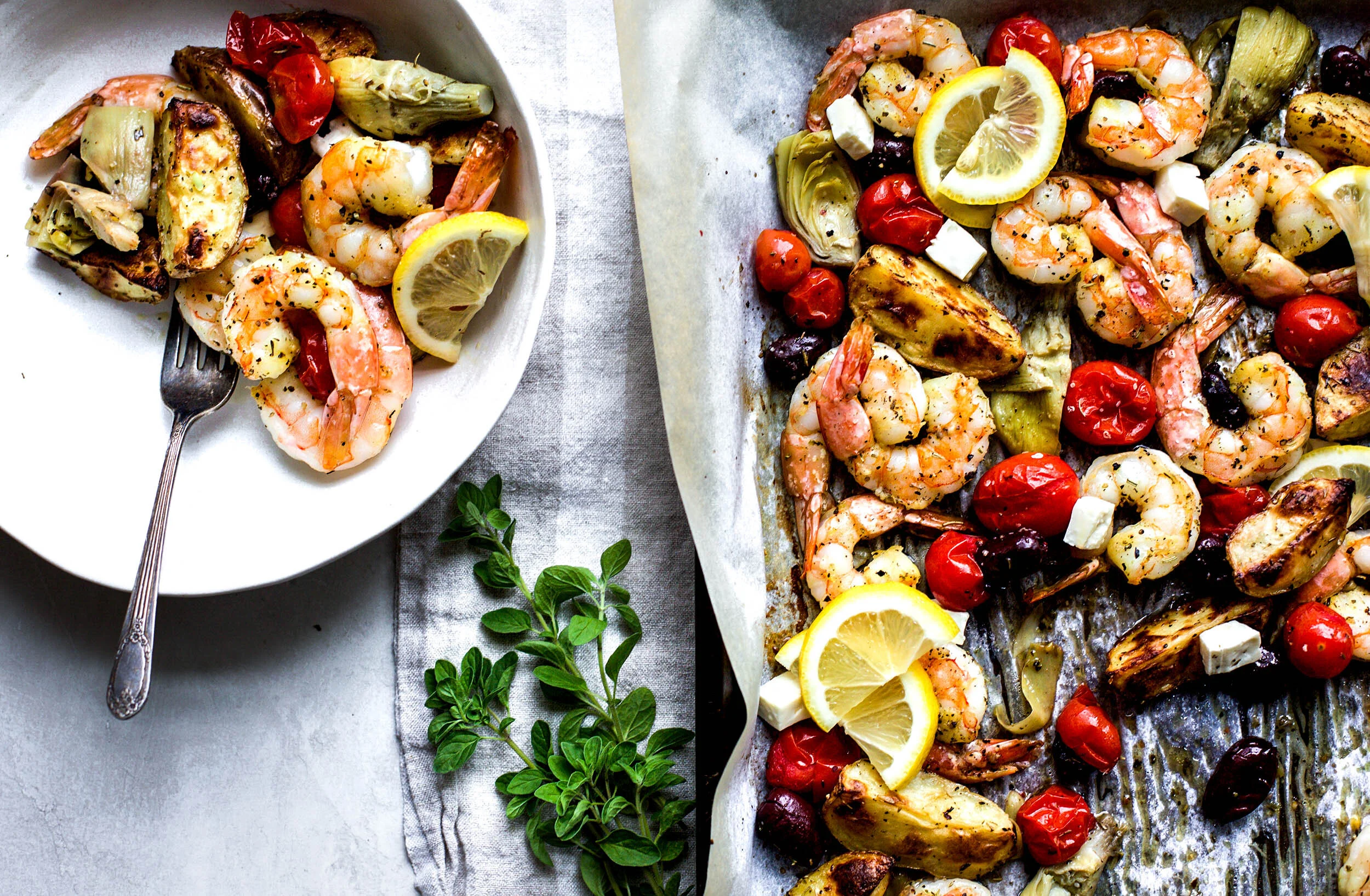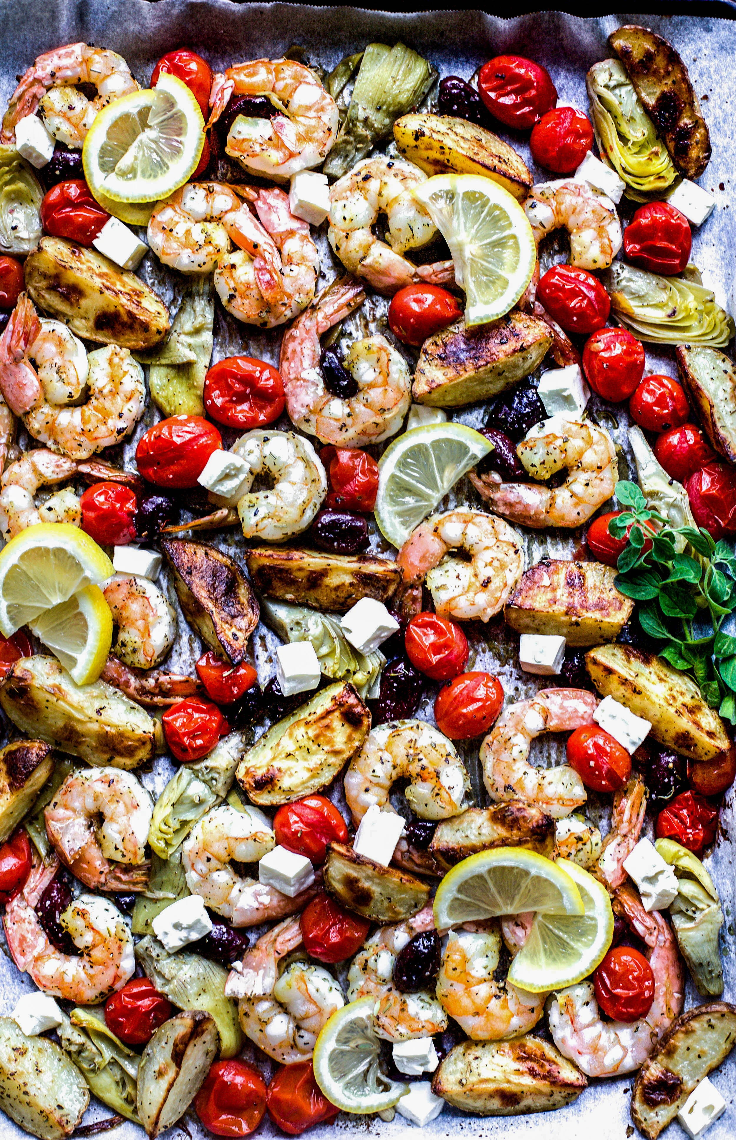 Well, funny you mention it, because sheet pan meals are my new favorite weeknight dinner kitchen hack! They are quick, the clean up is super simple and you get your protein, vegetables, and carbs right on the same pan. I also think that sheet pan meals end up being super flavorful because of the fact that everything gets cooked together and the flavors intermingle and do magical things. My easy Greek shrimp sheet pan meal is going to quickly become one of your favorite dinners because not only are the flavors so fresh and delicious, but it’s ridiculously easy to make too!