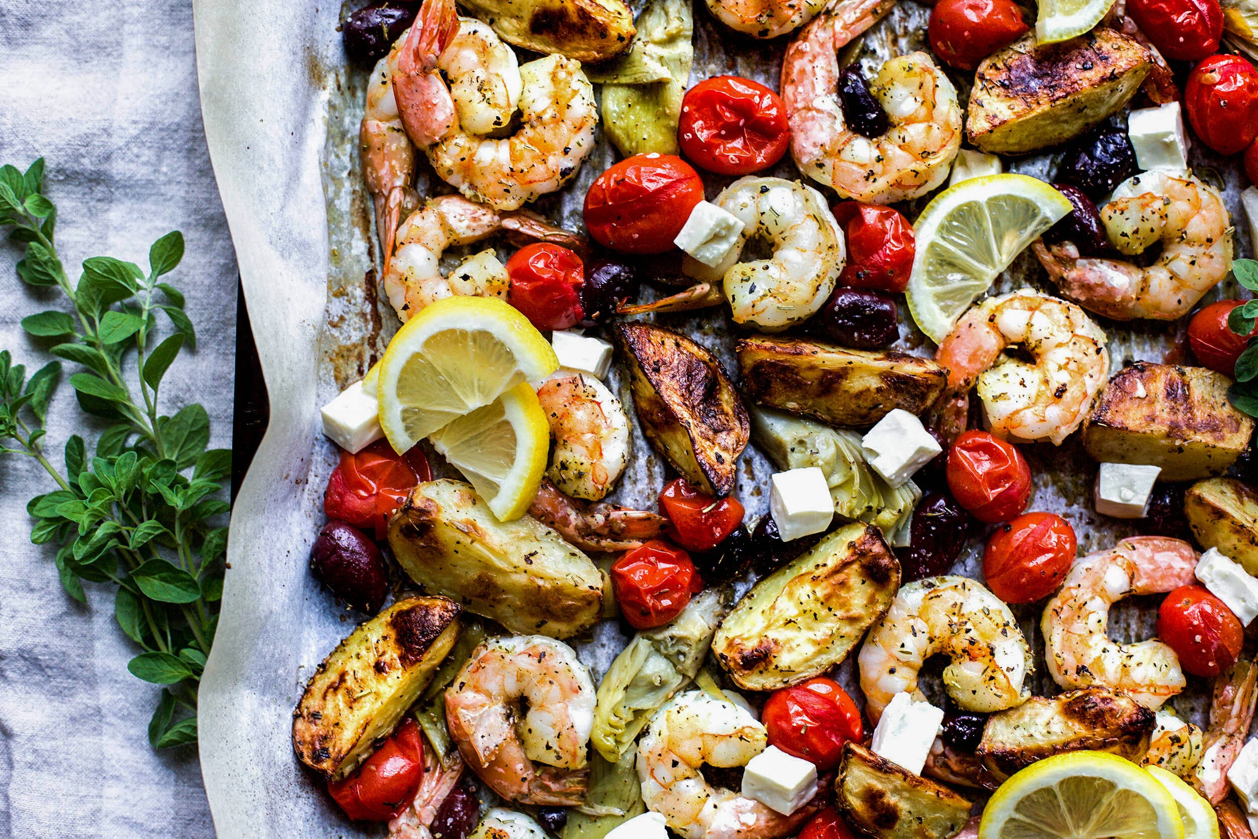 Add shrimp, tomatoes, artichokes, olives, and partially cooked potatoes to a parchment paper lined baking sheet.