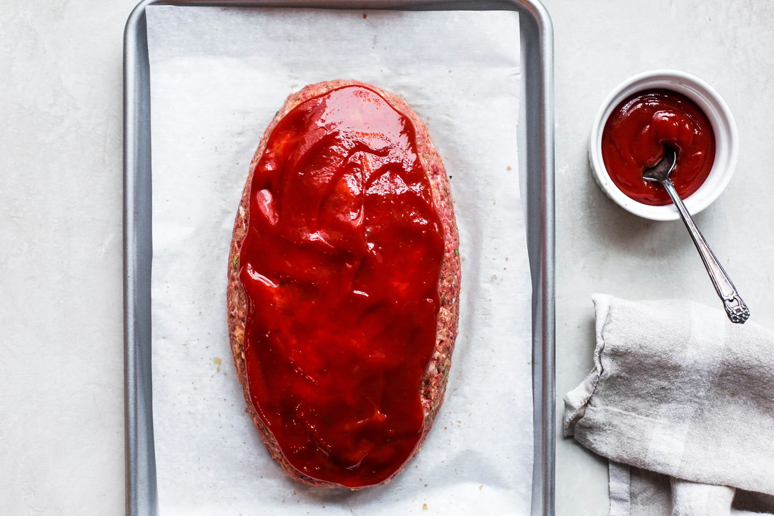 Tip: To prevent ketchup cracking, place a pan full of water on the bottom rack in the oven. You can also make this gluten free by subbing gluten free bread pieces or bread crumbs and make dairy free by subbing an unflavored non-dairy milk.