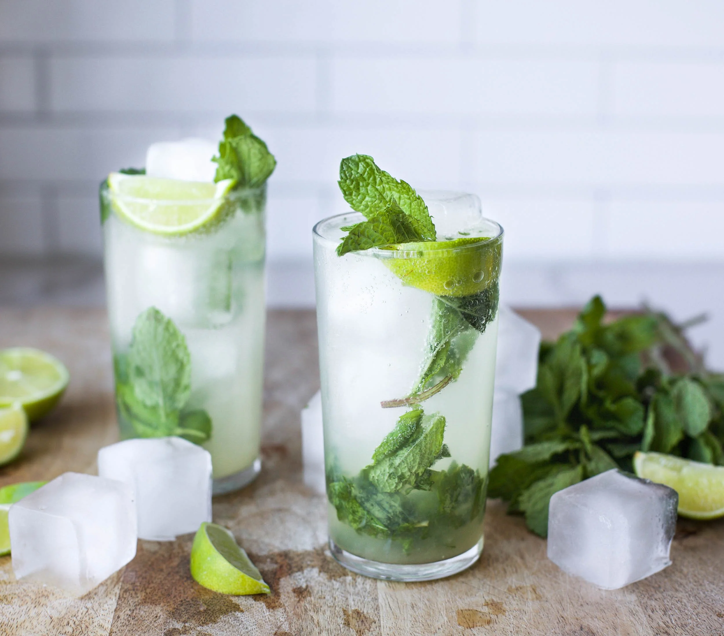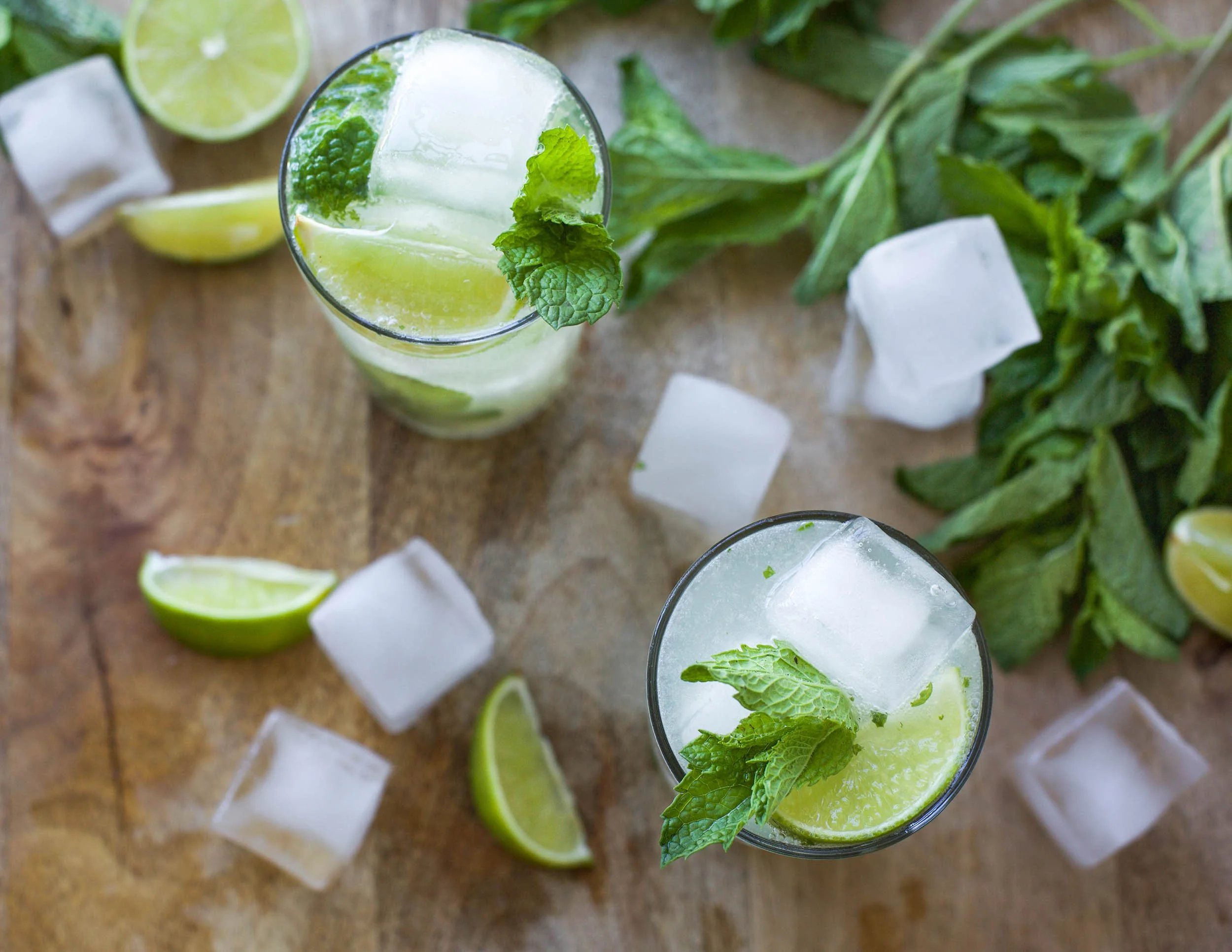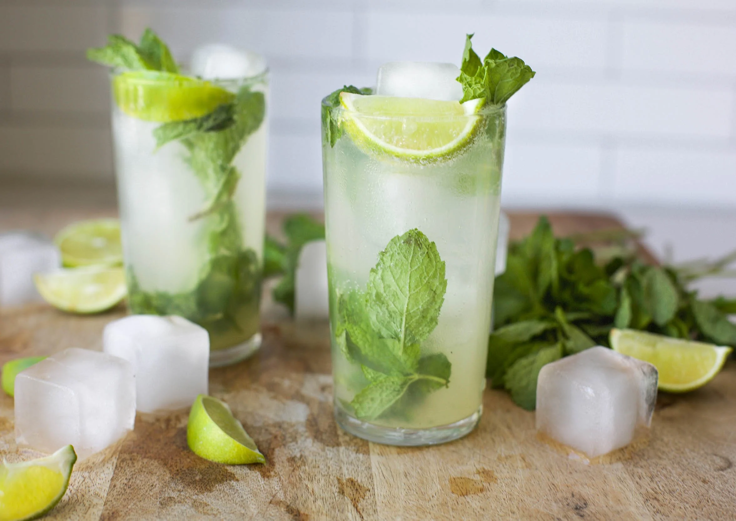 A mojito is a highball drink that originated in Cuba and is made with fresh lime juice, fresh mint, granulated sugar, rum, and club soda. Some people make a simple syrup here, but traditionally the drink is made with granulated sugar to keep it from being too sweet and because the texture of the sugar granules that do not dissolve is part of the drink experience.