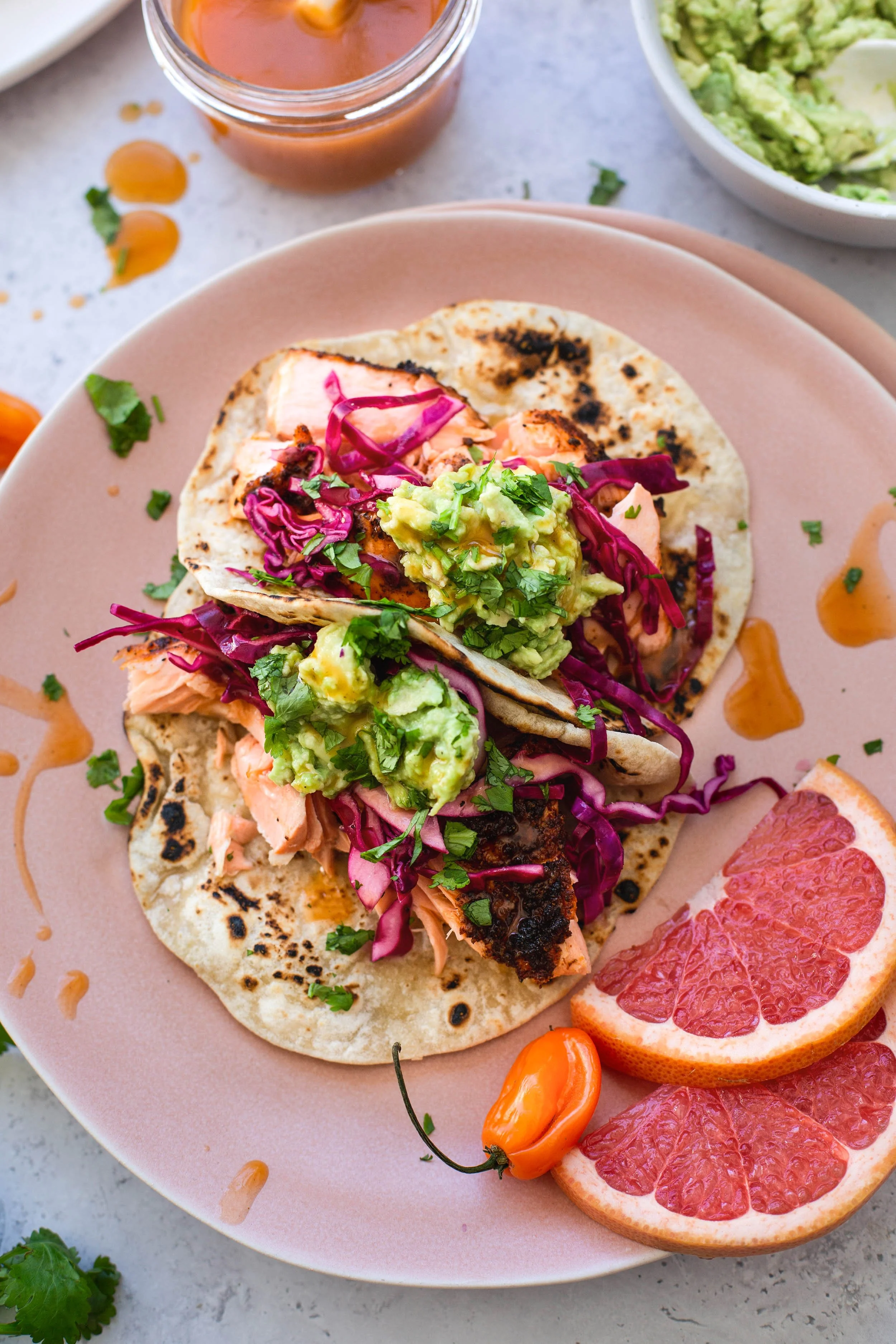 How gorgeous are these easy salmon tacos with that delicious grapefruit habanero sauce? They are so good and so perfect for a healthy weeknight dinner!