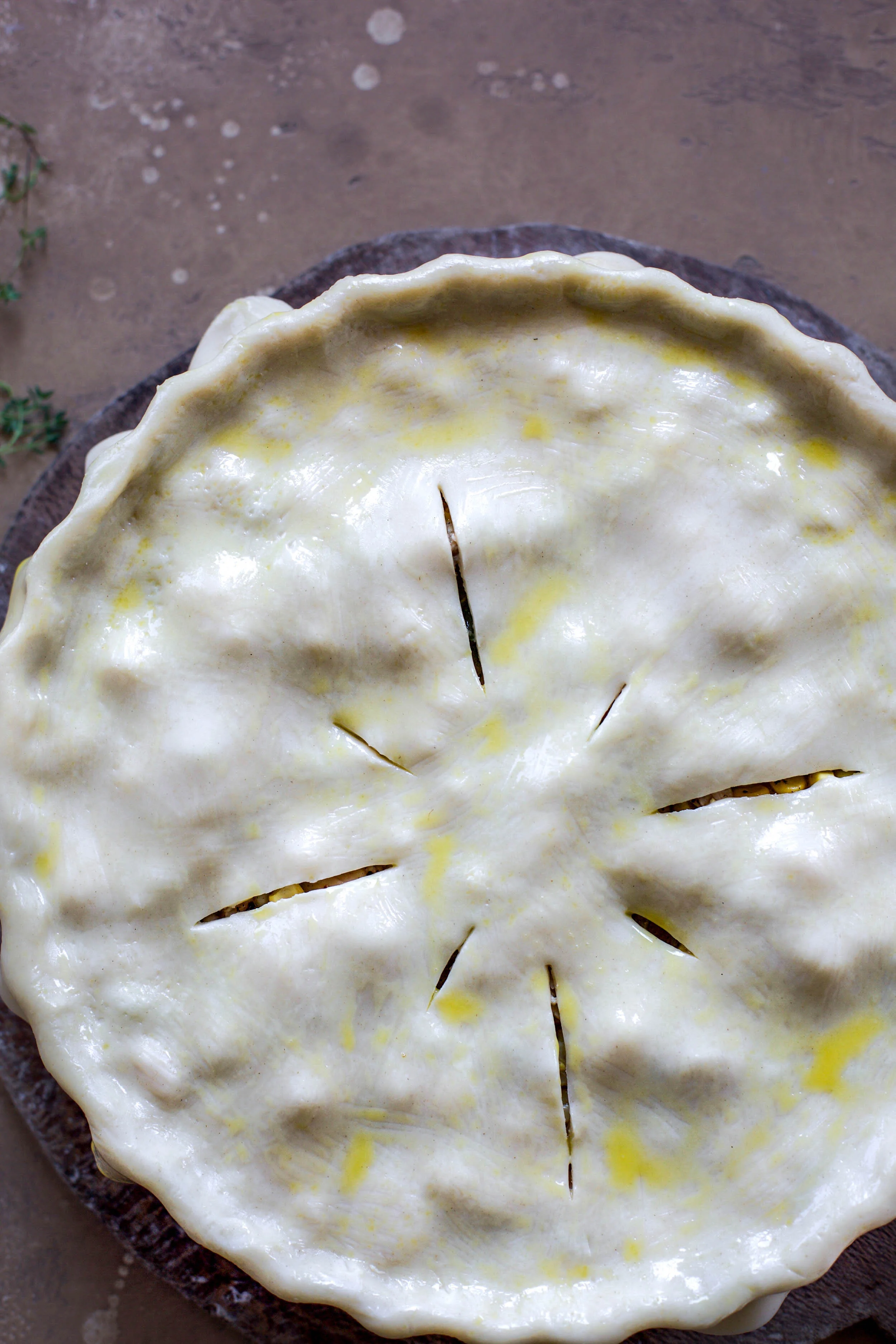 Brush the top of the pie dough with the beaten egg to lightly coat.