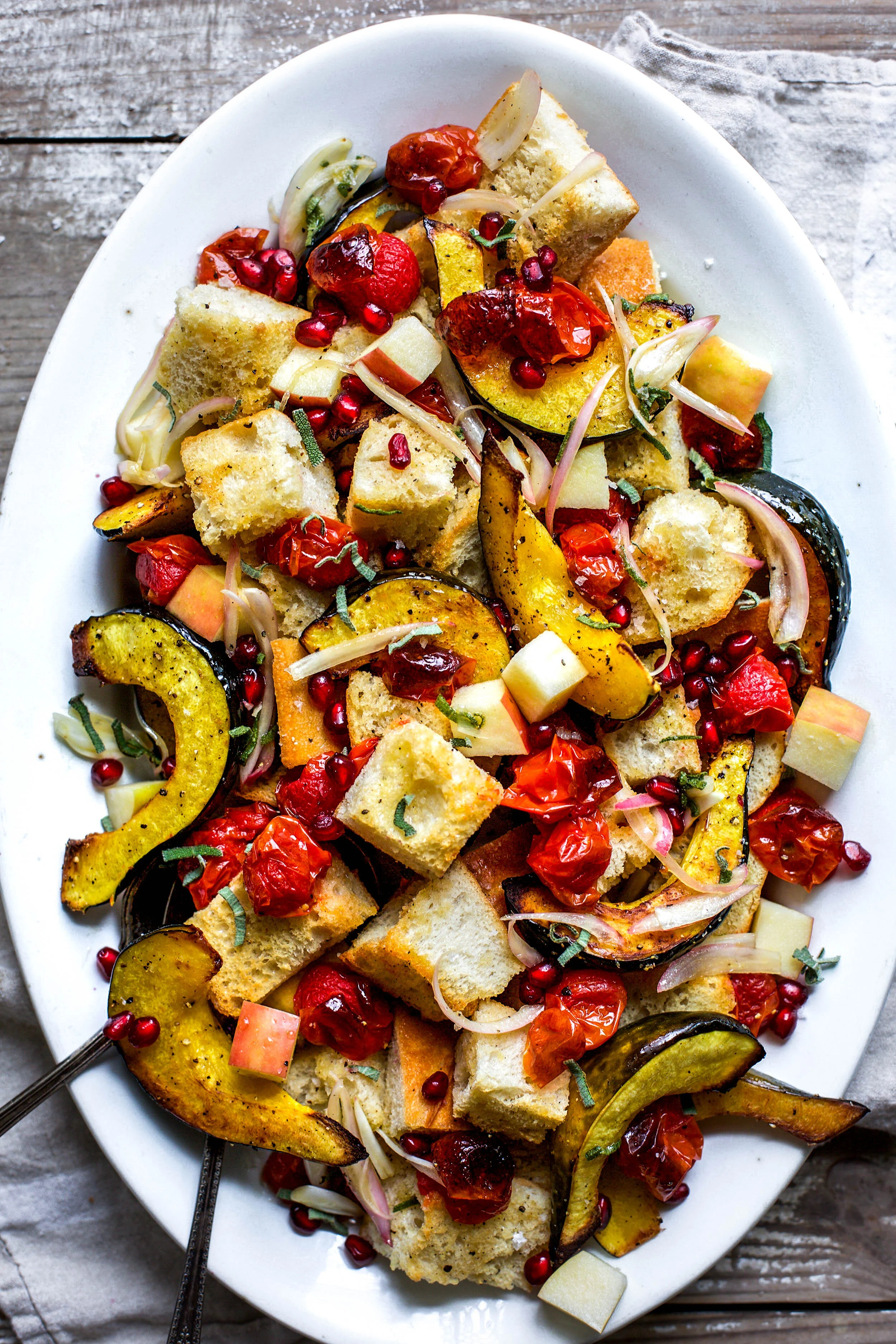 To assemble salad, add toasted bread, squash, and tomatoes to a large platter. Add diced apples and pomegranates and then toss with 1/2 of the dressing.