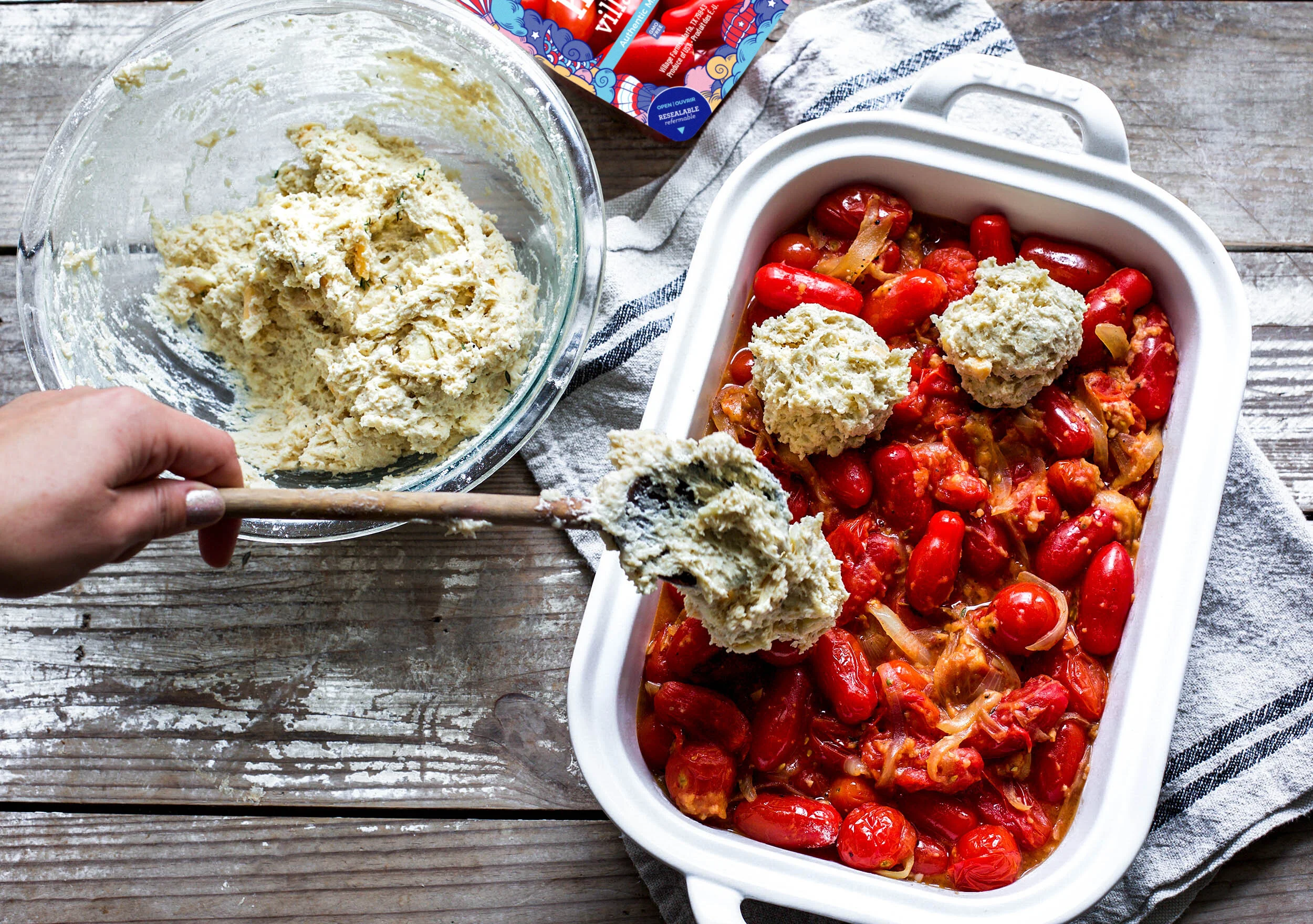Drop spoonfuls of the biscuit dough directly on top of the tomatoes.
