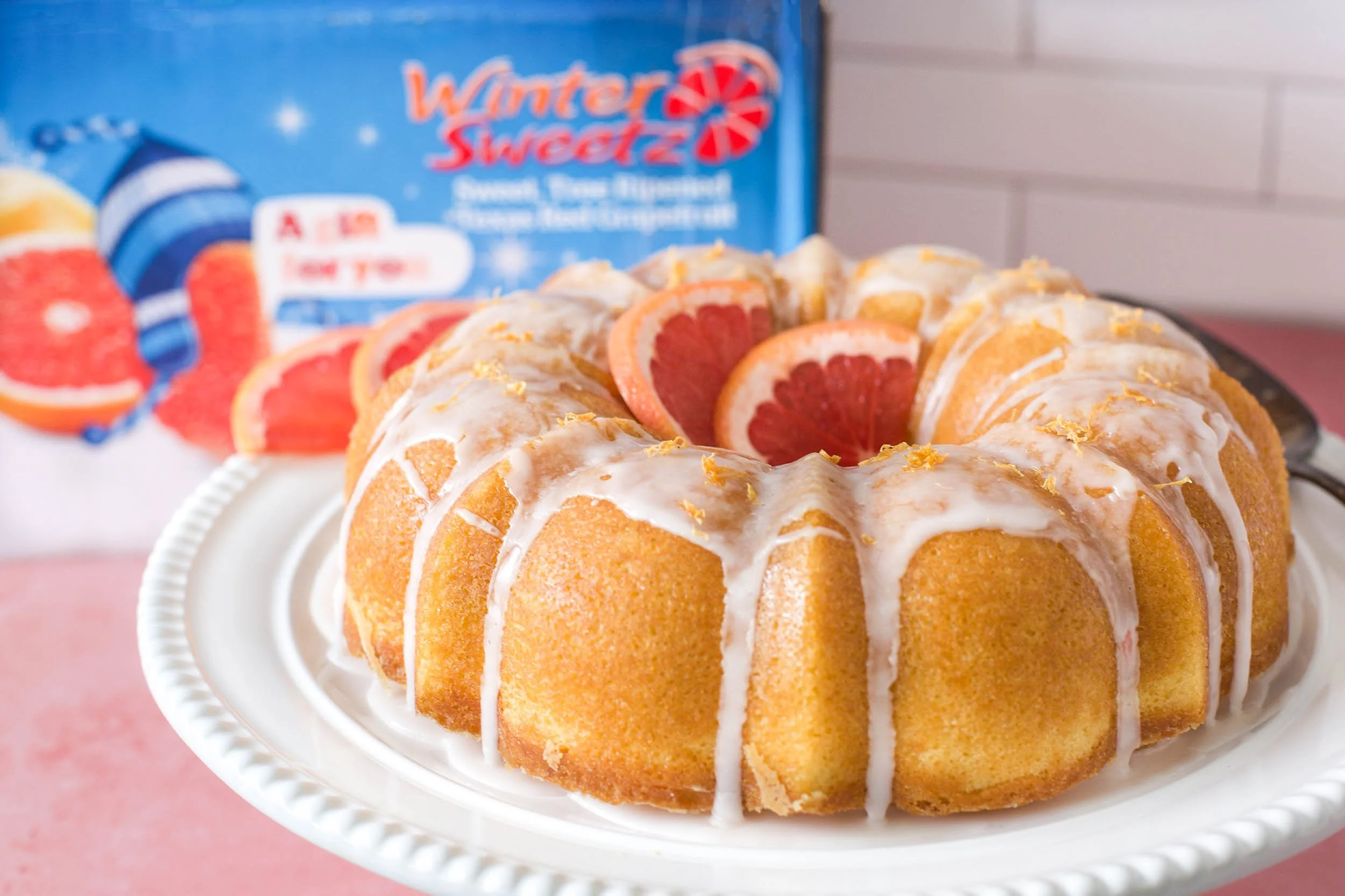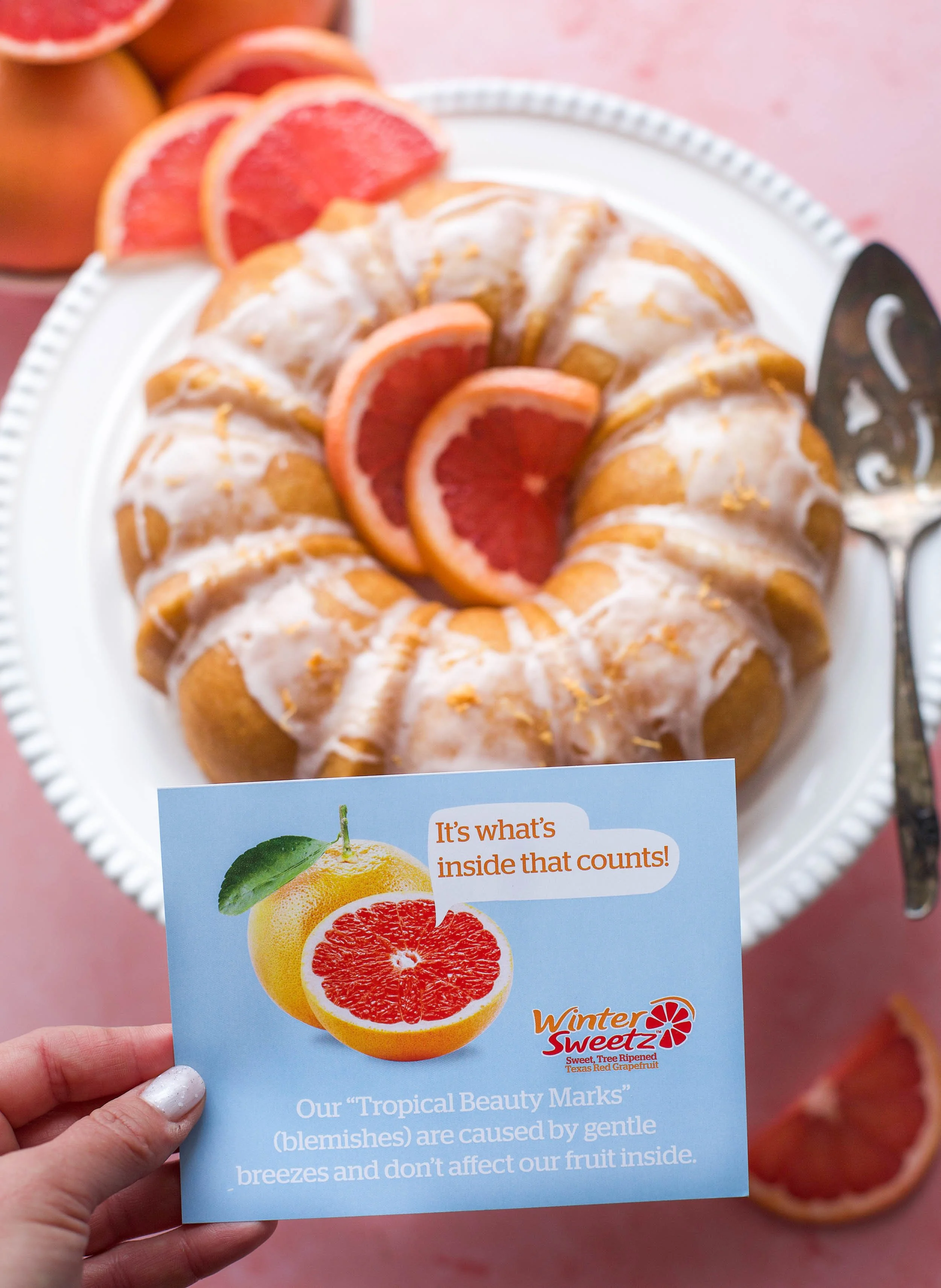 I love the flavor of grapefruit that subtly is in the background of each bite that you take, keeping this cake light enough for a brunch or even a breakfast, but is also sweet enough to be served as a dessert. The Winter Sweetz grapefruits are Texas Red Grapefruits and are just gorgeous when you slice them open. They are perfectly sweet and make this bundt cake extra special. They are at their peak ripeness from November to March, making them the ideal citrus to have on hand for recipes and snacking!