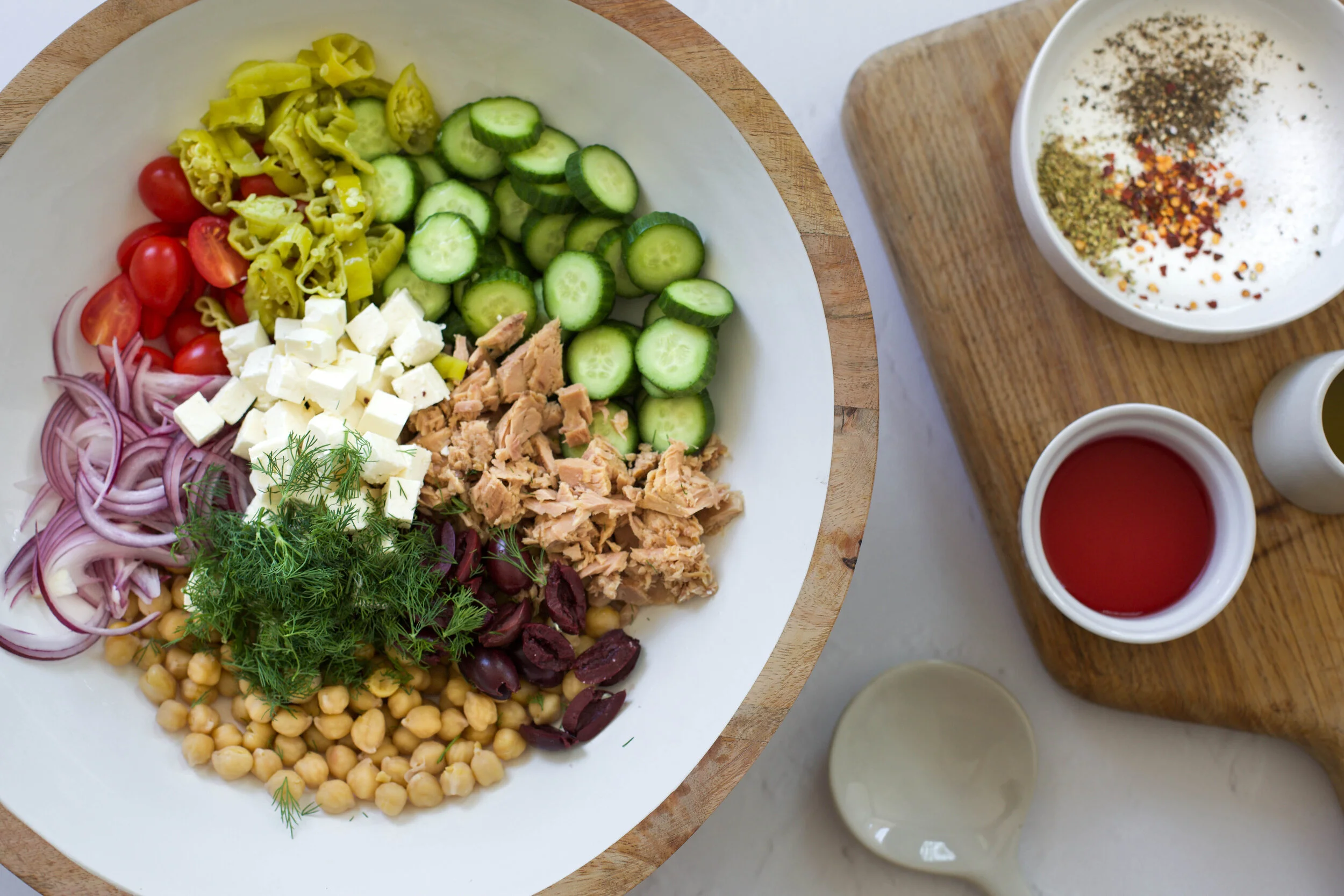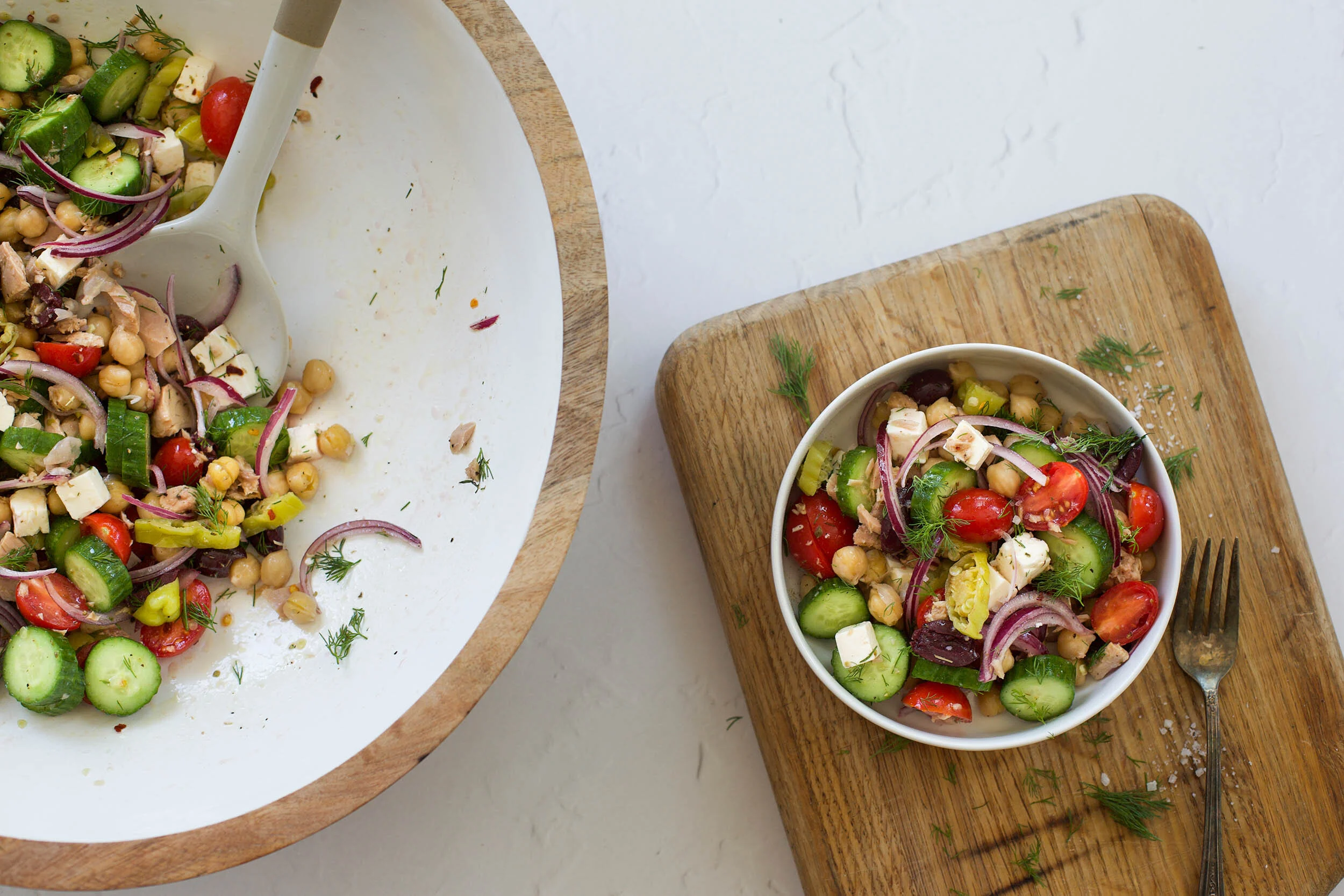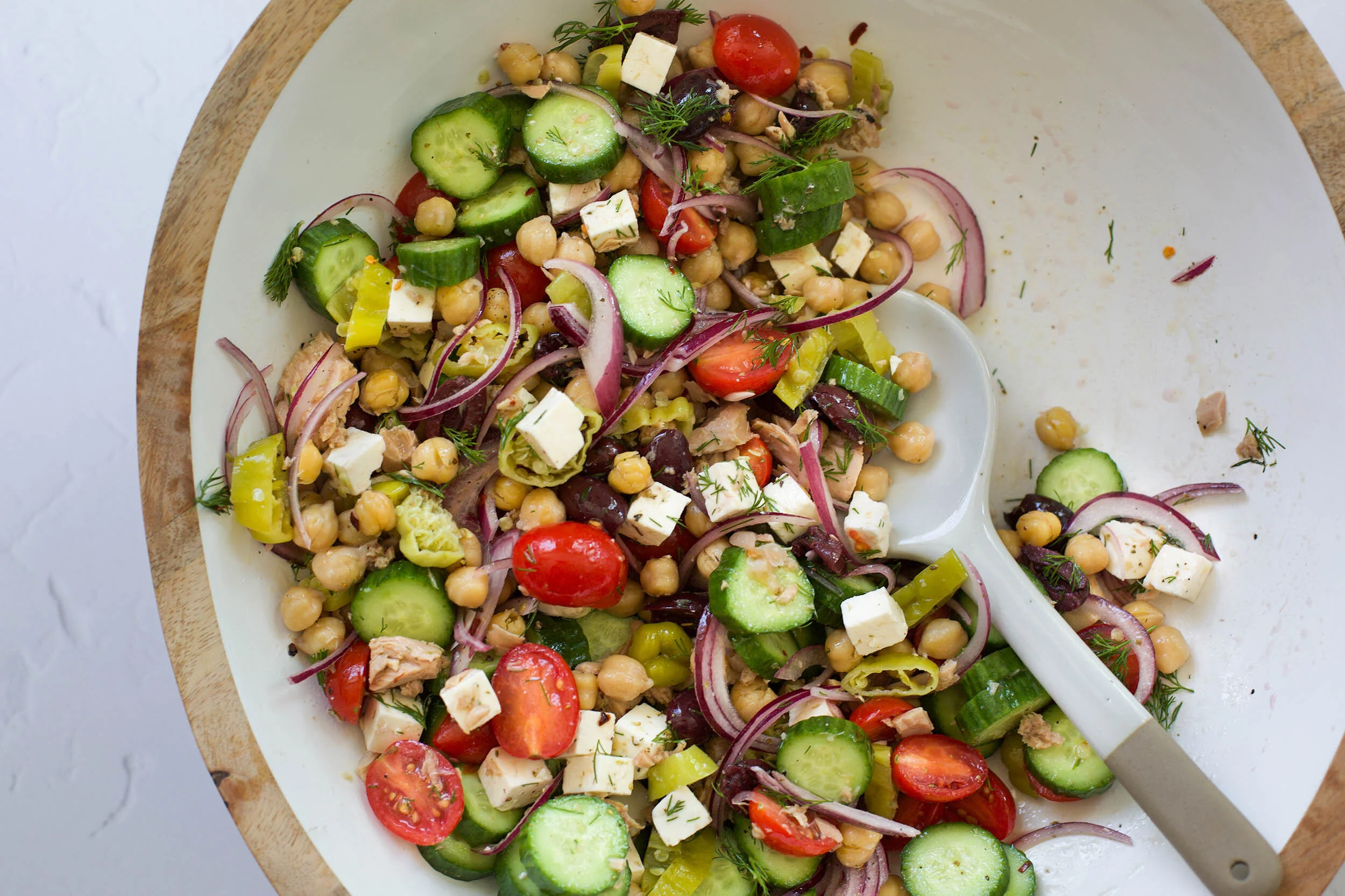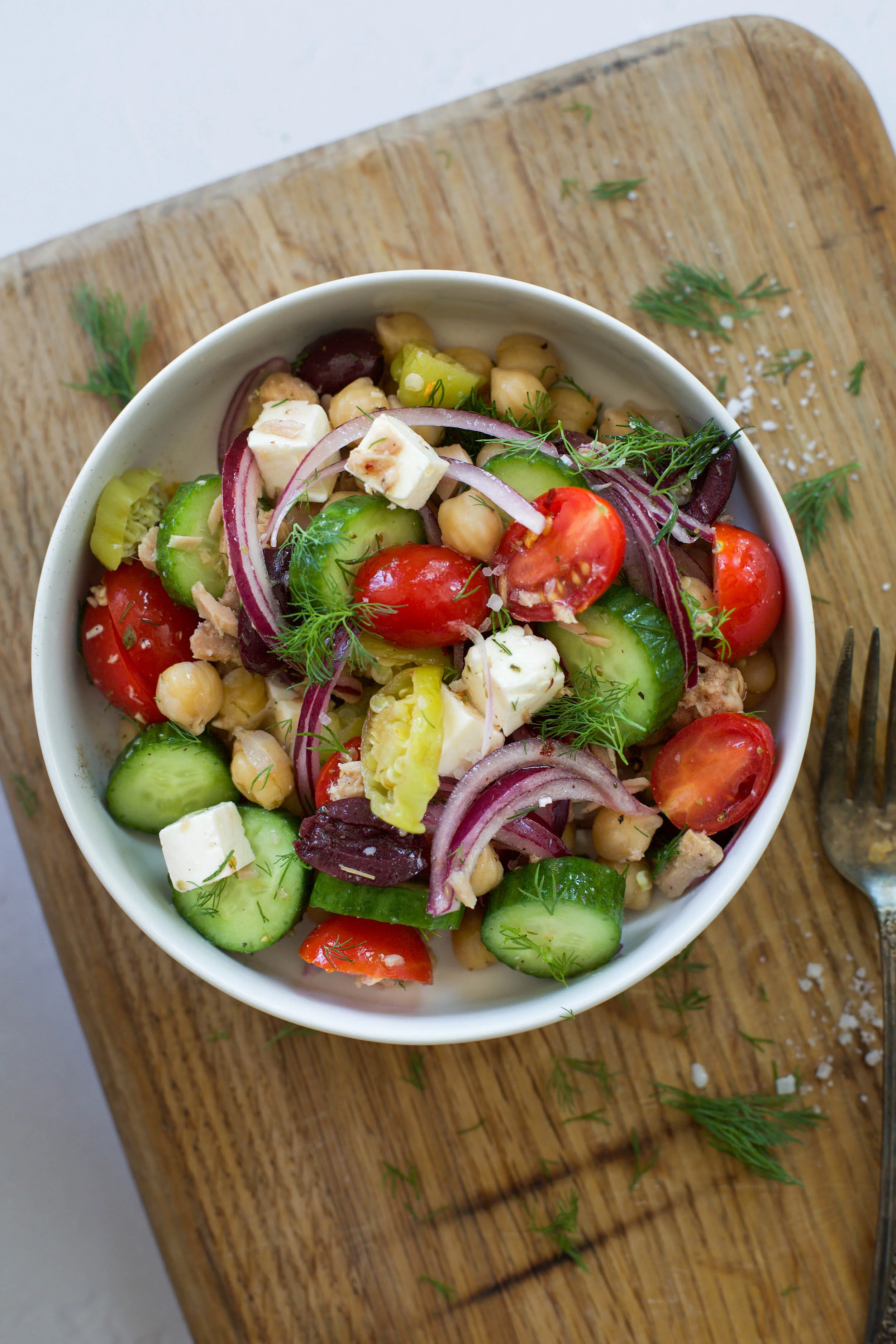 This Greek Chickpea and Tuna Salad is one of those recipes that was a happy accident resulting from a day that I needed to go to the grocery, but needed lunch before I could make that happen. I ended up using what veggies I had in the fridge plus a can of chickpeas and tuna from the pantry and ended up with a delicious Greek salad that I have been making for myself ever since.