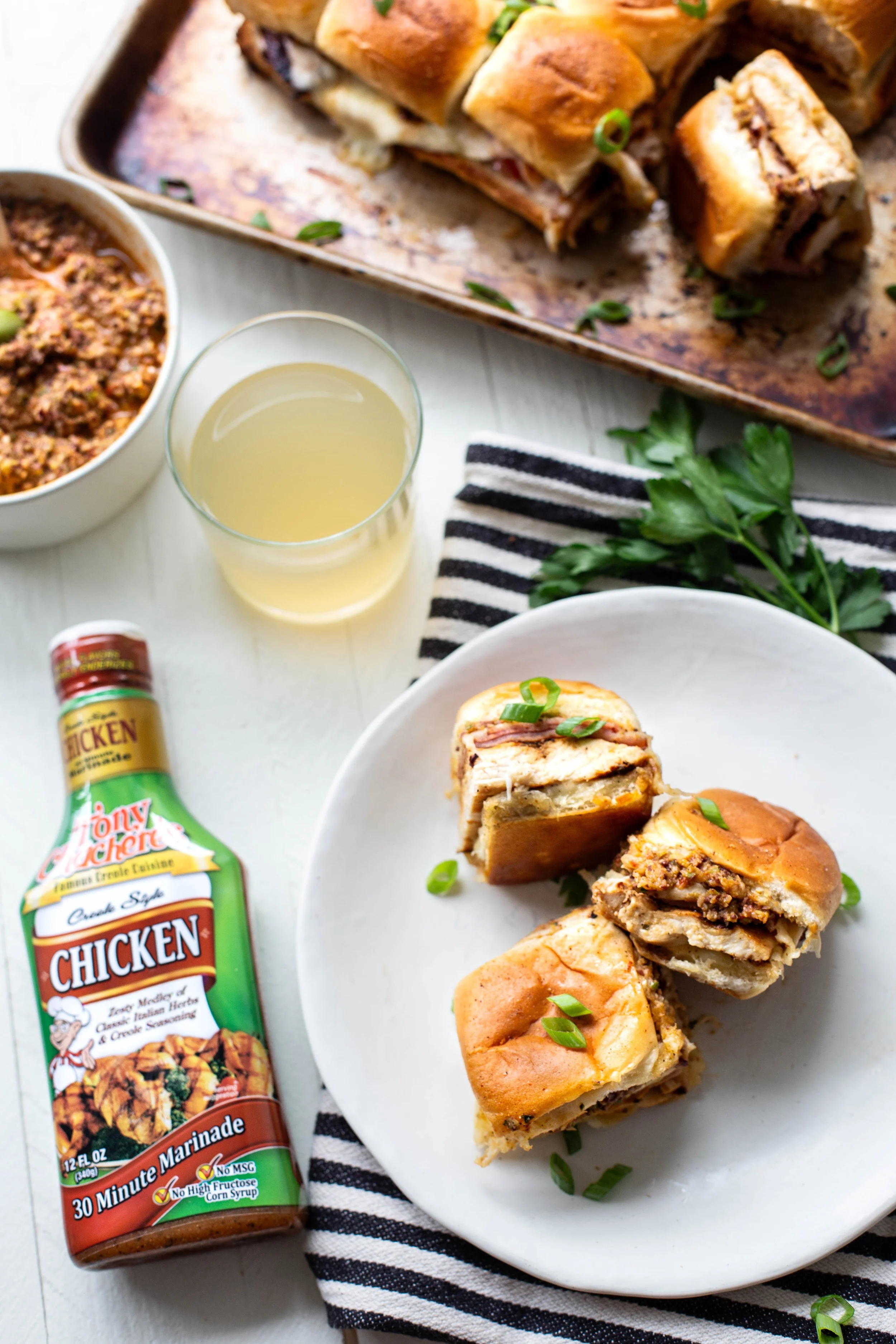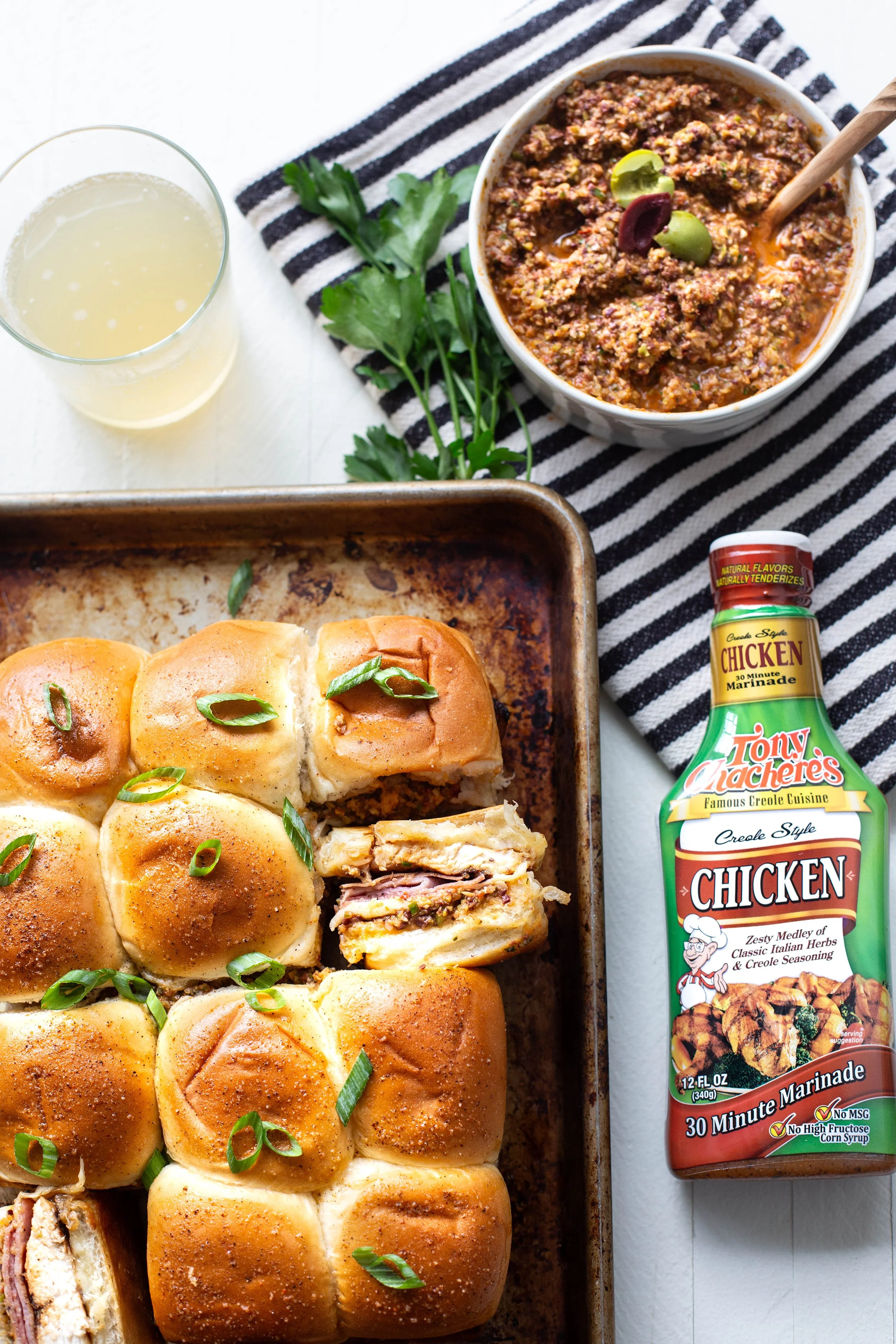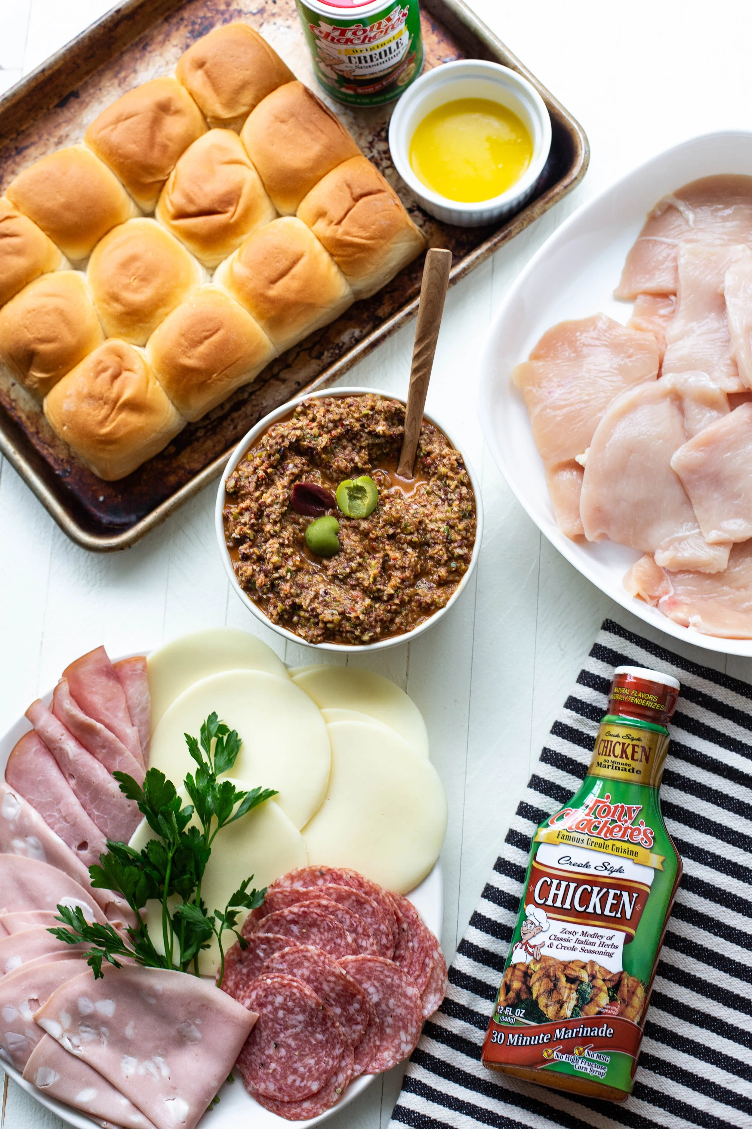 Traditionally muffulettas are served up on a specific type of bread made just for the sandwich, but since that bread can be hard to find, these sliders are made on Hawaiian rolls. They are just perfect for serving up an appetizer sized muffuletta and I love the hint of sweetness the rolls have as well. I added grilled chicken to these sliders because the flavor from the chicken marinade by Tony Chacheres adds so much flavor that pairs so well with the other flavors in the sandwich, plus it adds extra protein too!
