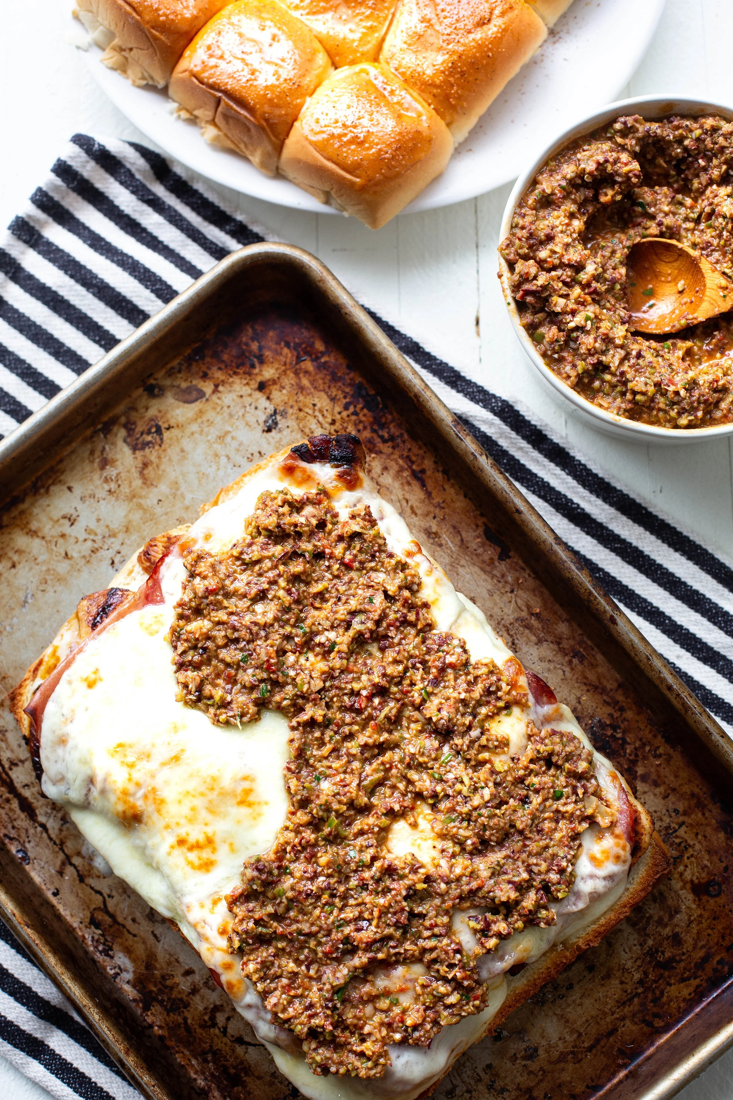 Add muffuletta spread in an even layer on top of melty cheese.