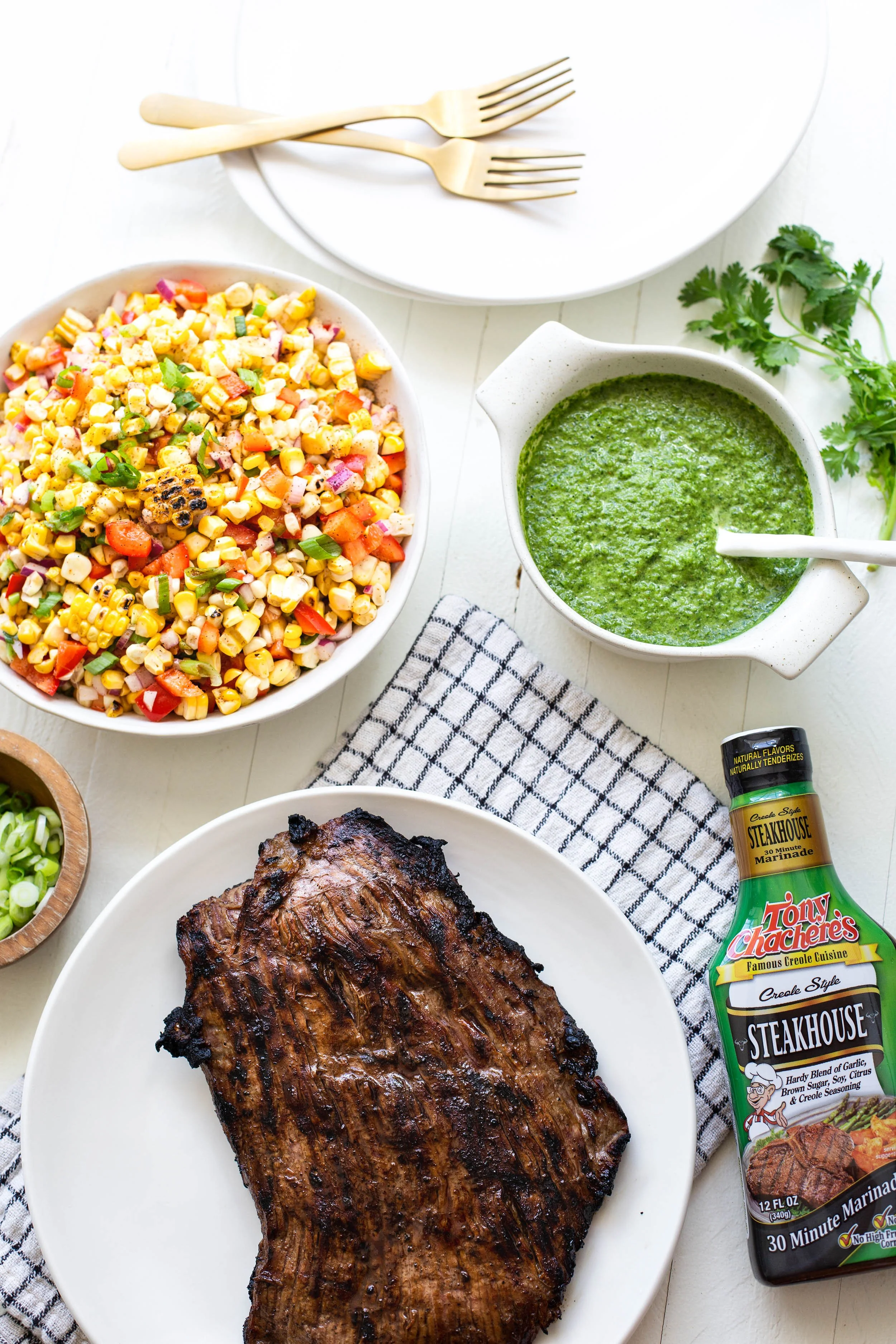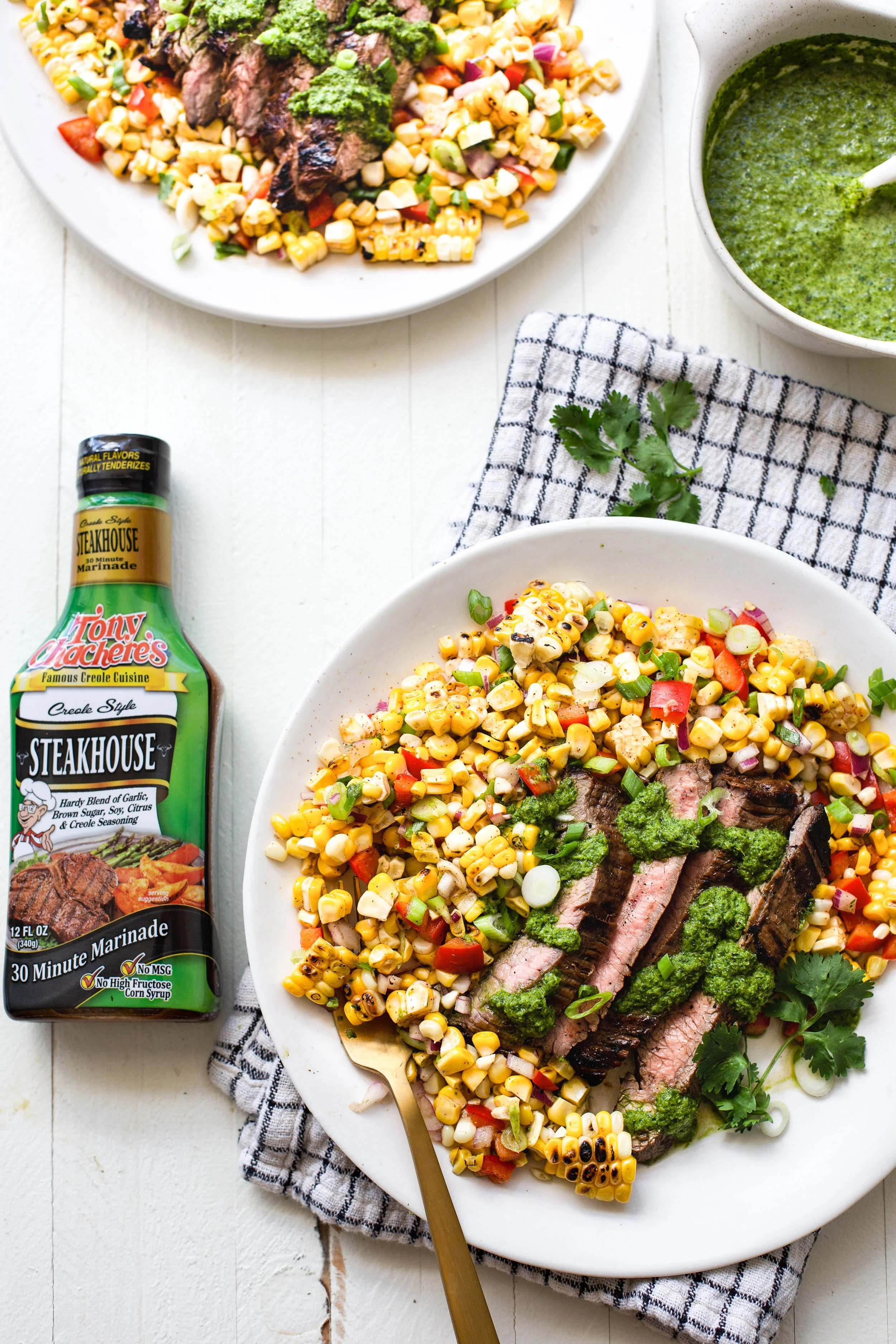 This grilled flank steak over a charred corn salad with chimichurri sauce is fresh and vibrant for summer. I partnered with my friends at Tony Chachere’s to create this delicious meal featuring their Steakhouse marinade that flavors and tenderizes the flank steak so well before grilling. With sweet corn being at its best of the season, this charred corn salad is the perfect base for a perfectly seasoned and grilled flank steak topped with a fresh chimichurri sauce that brings the whole dish together seamlessly. You will love grilling up this delicious meal all summer long.