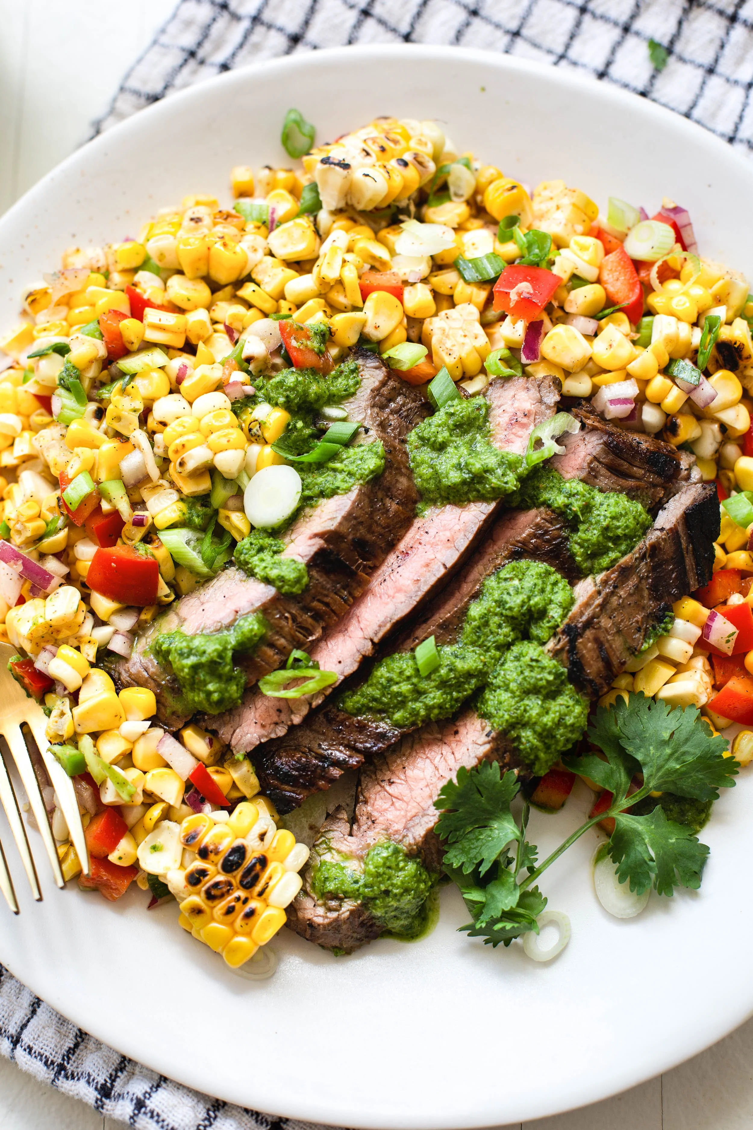 How good does this grilled flank steak over a charred corn salad with chimichurri sauce look? I hope you love this summer dinner as much as we do!