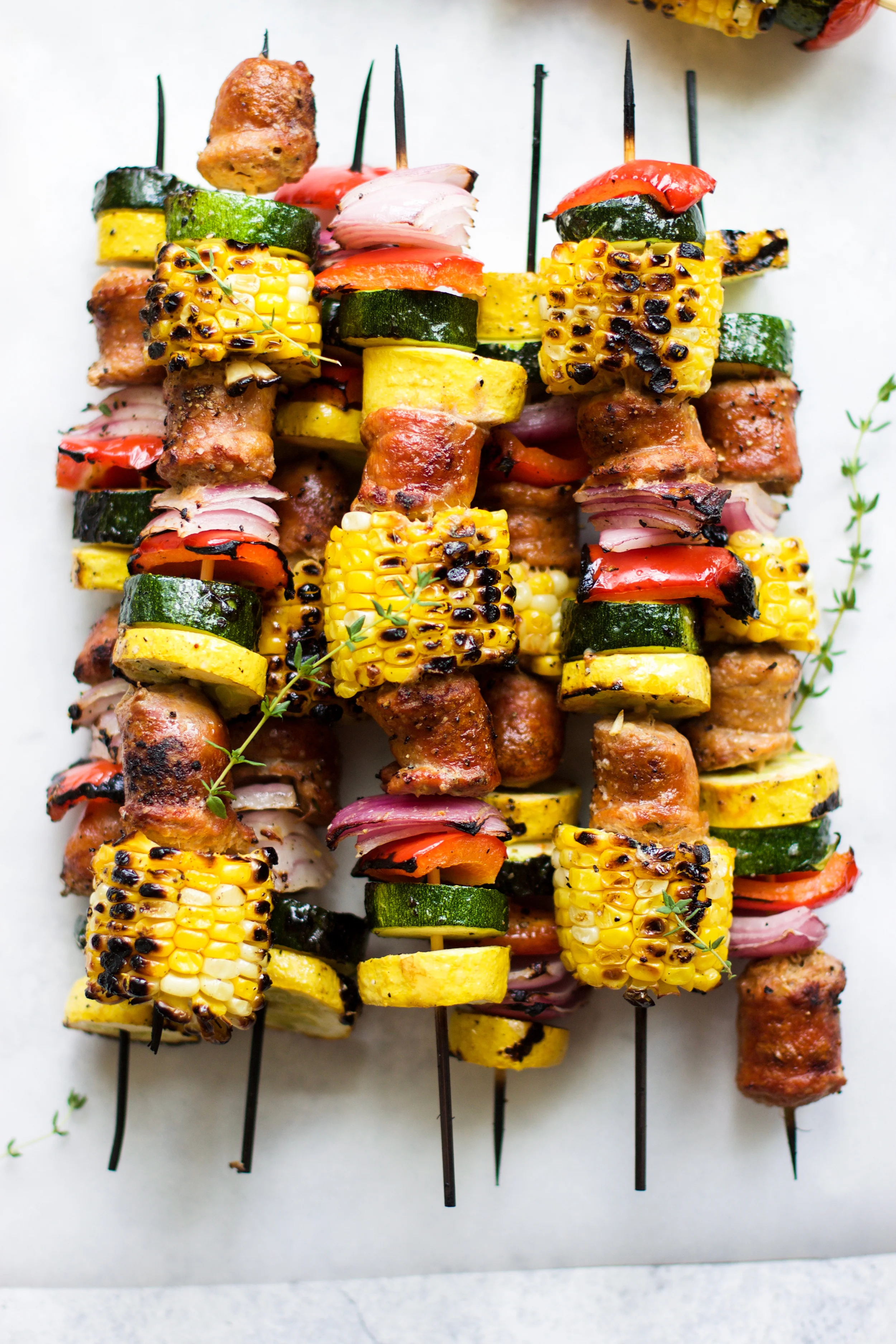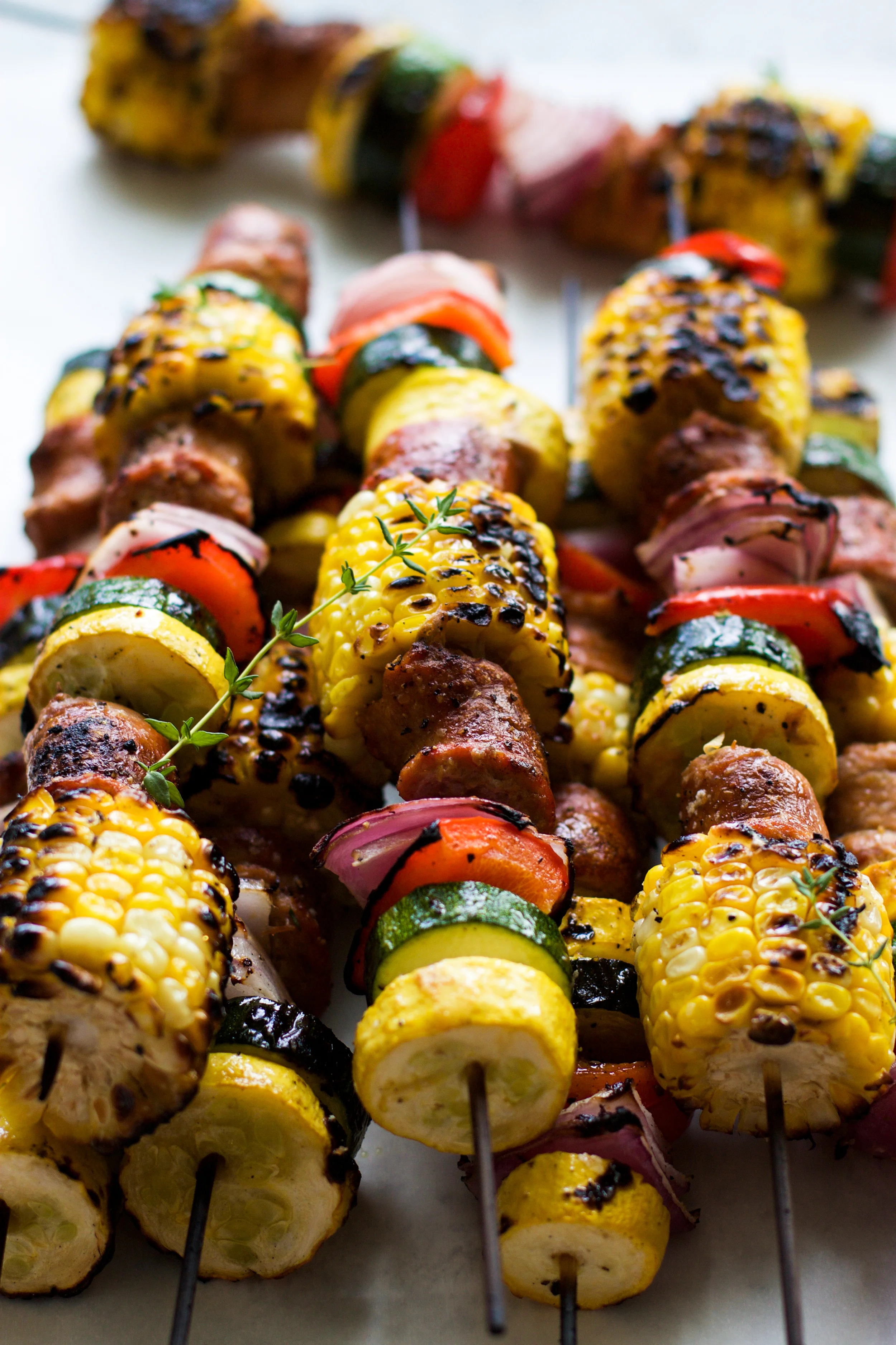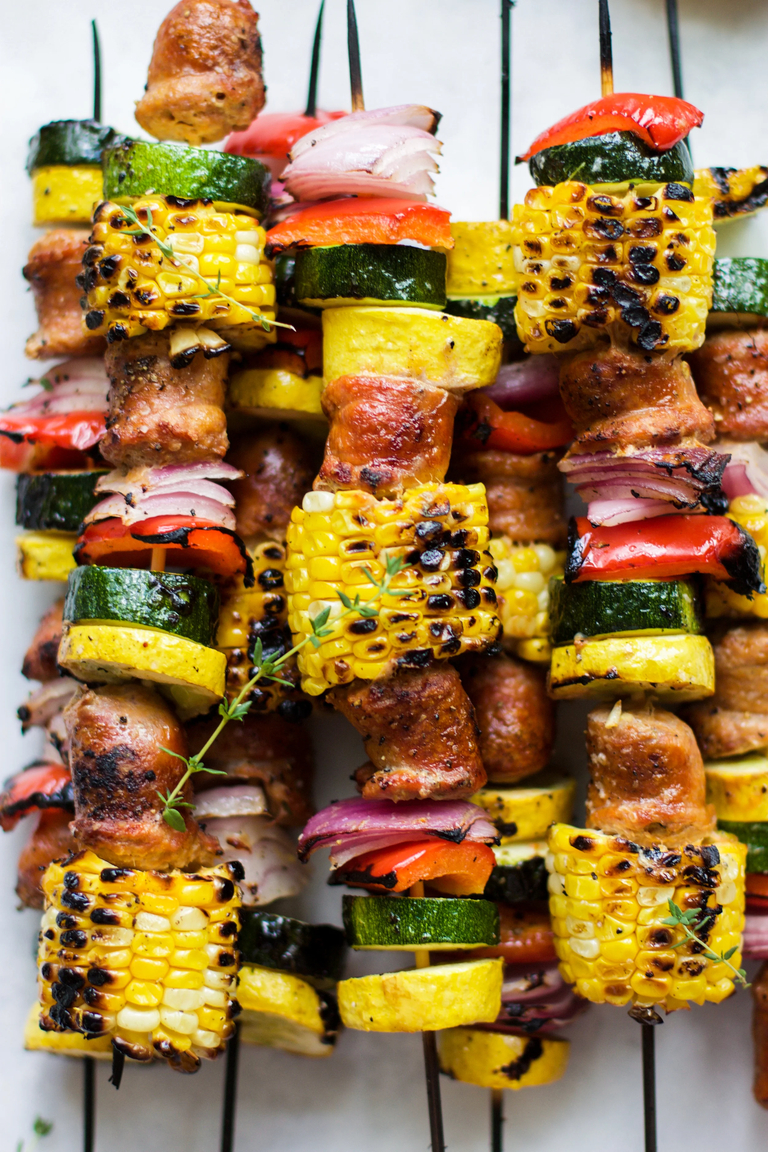 These skewers are so full of flavor thanks to the chicken sausage and the grilled lemon thyme oil that gets brushed over top of the skewers right before they come off the grill! These skewers are so beautiful too and would be perfect for your July 4th celebrations, but are simple enough for an easy weeknight meal! I use all of my favorite summer vegetables like sweet peppers, squash and zucchini, and sweet corn but feel free to add or swap in any of your favorite veggies!
