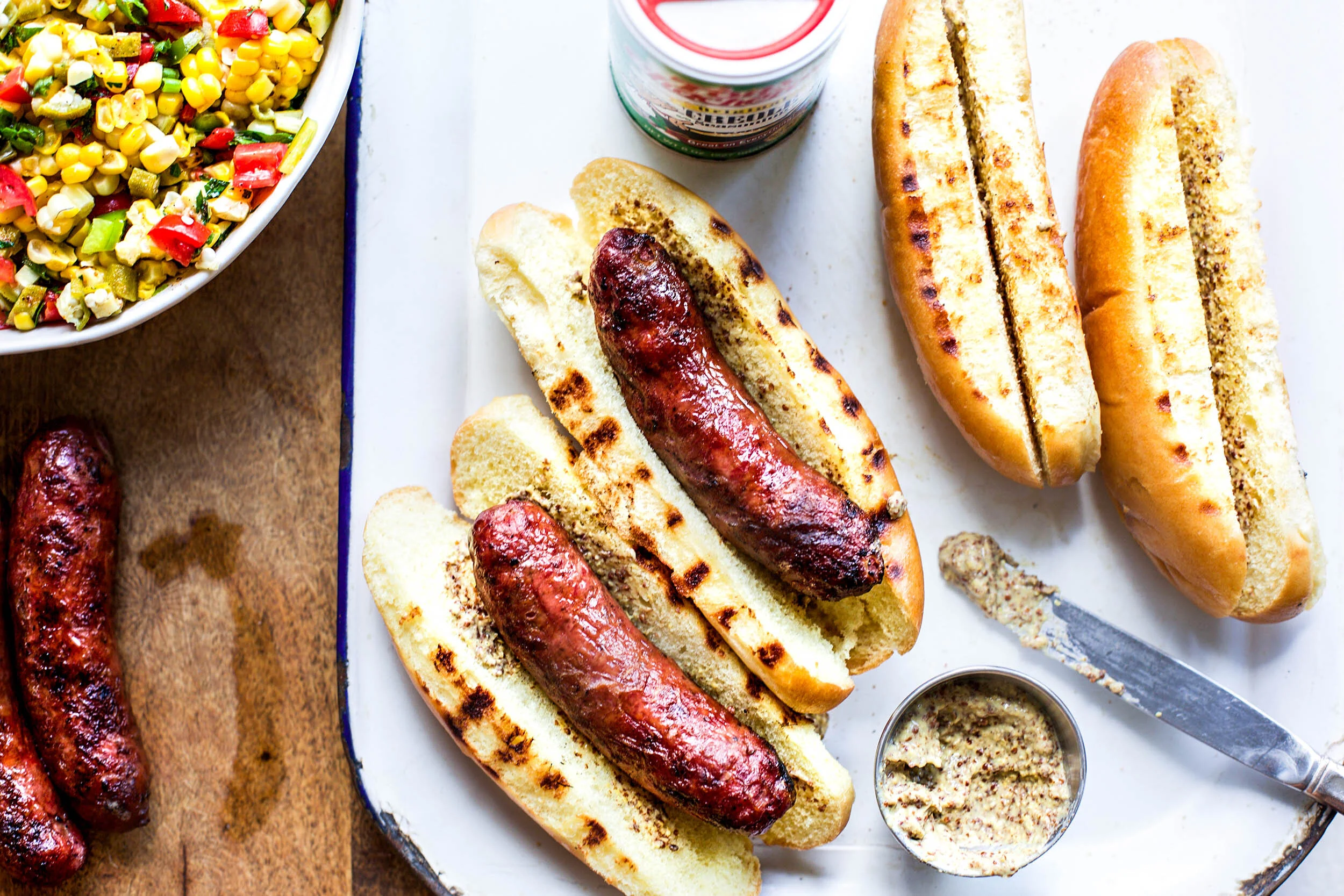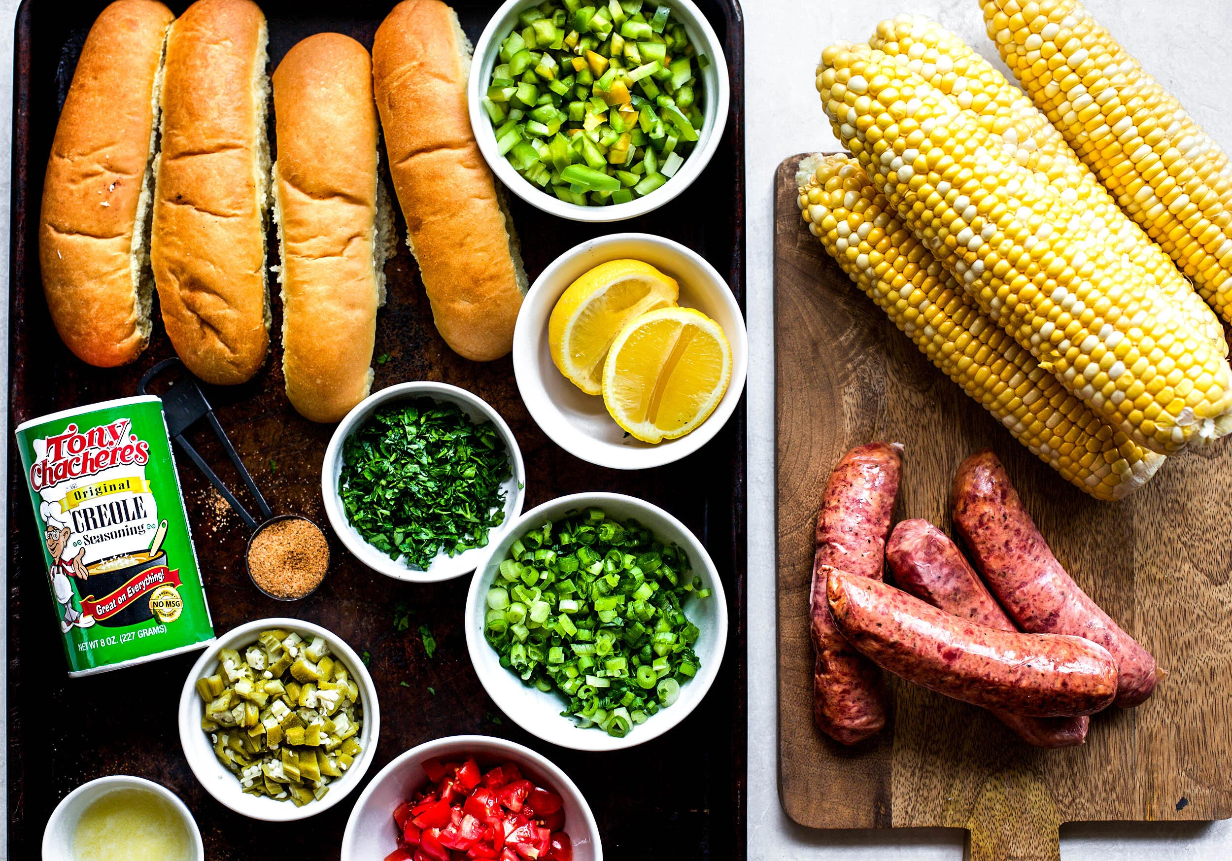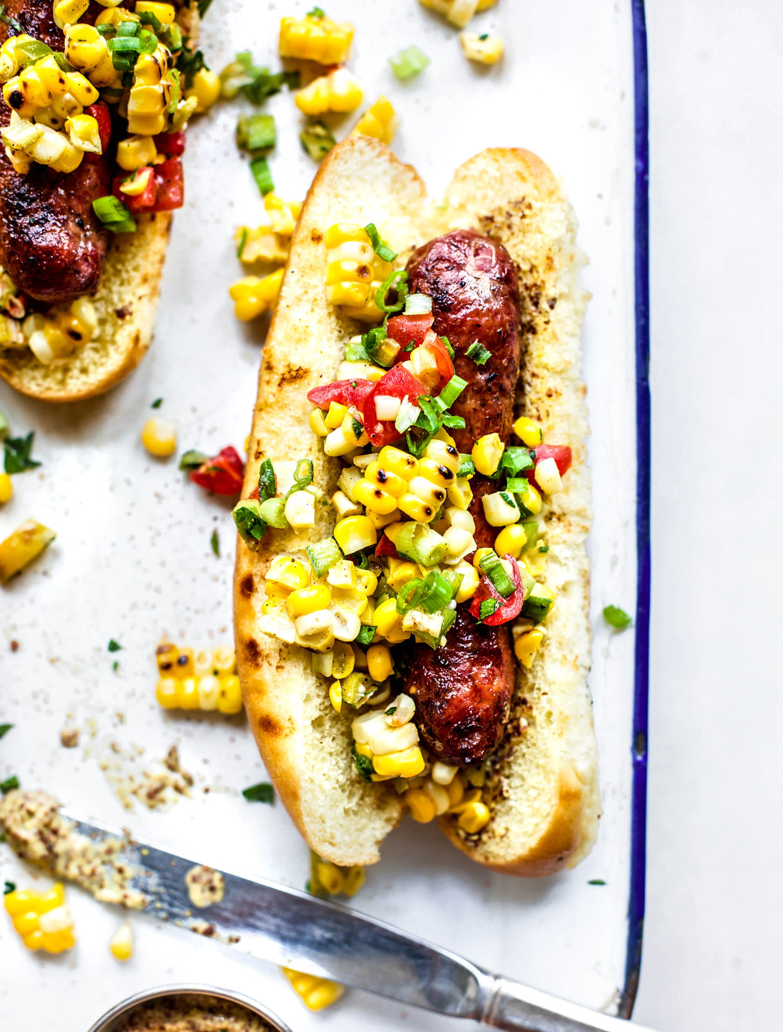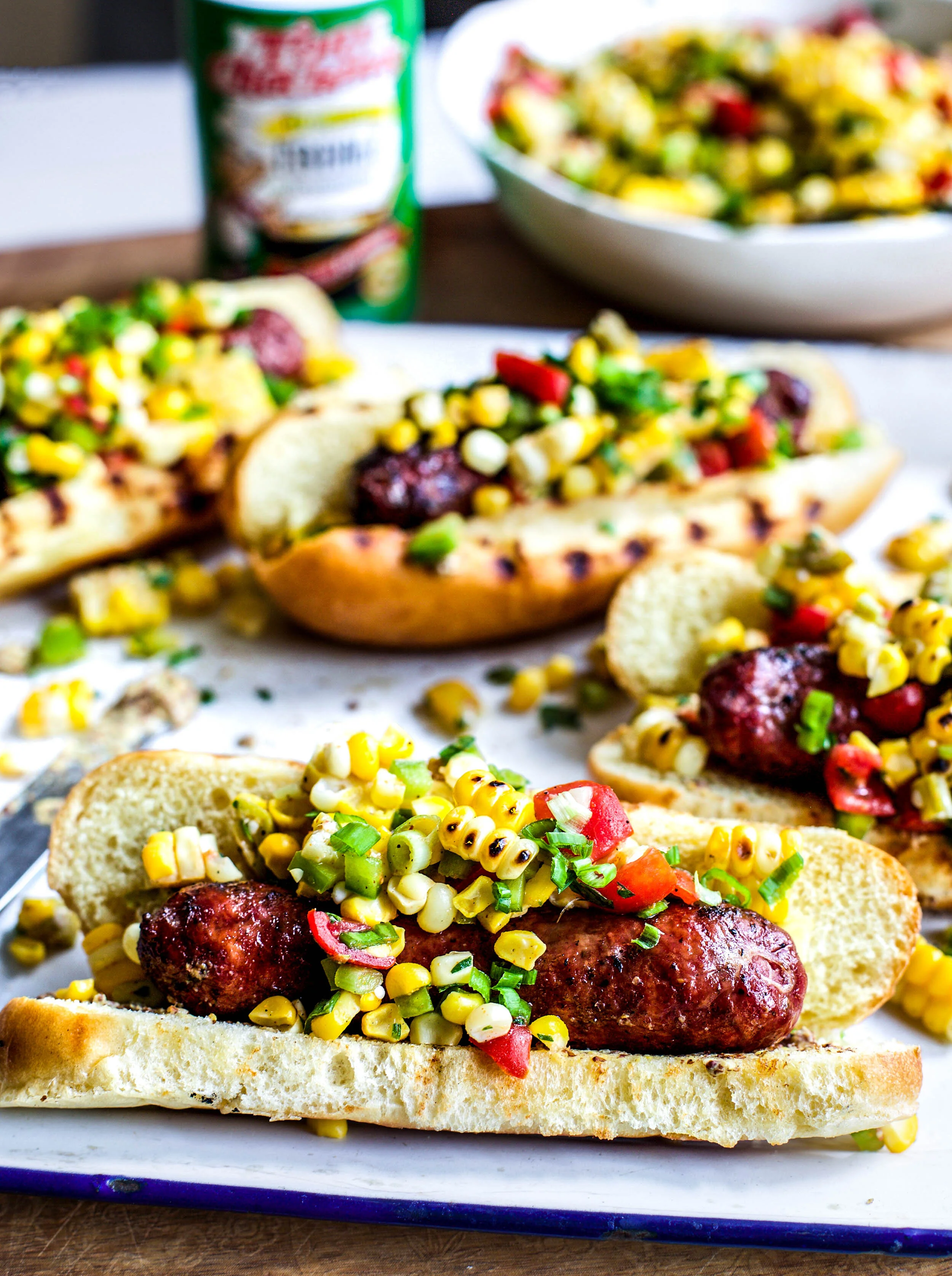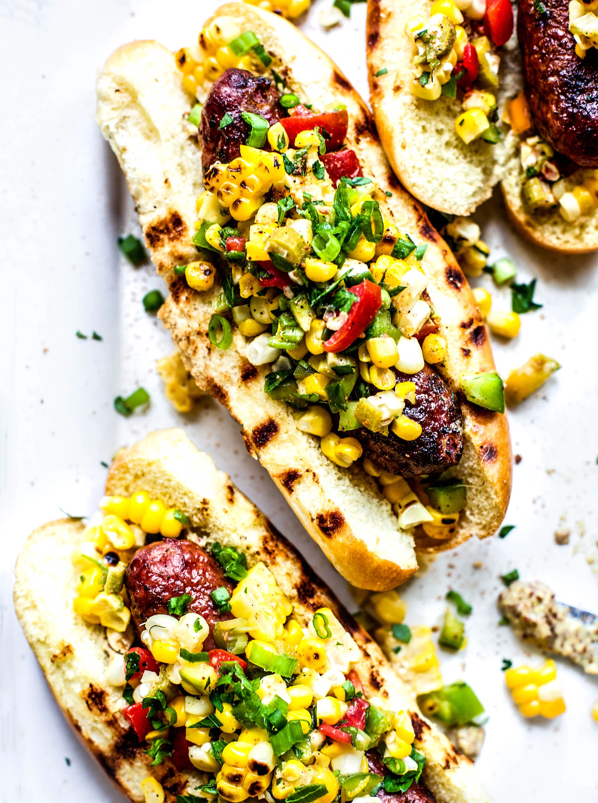 Summertime means lots of grilling is happening at my house for a couple of reasons. Number one, grilling means not having to turn on the oven or the stove on when its scorching outside, and number two, grilling makes clean up a breeze when you don’t have dishes to wash after the meal is done. Need I say more? I partnered with Tony Chachere’s to bring you a super simple, but out of this world tasty recipe that you are going to want to make all season long. Grilled sausages get sandwiched between a perfectly grilled bun and topped with a Cajun corn salsa to create the ultimate summer grilled sausage dog. I can guarantee that this recipe for grilled sausage dogs with Cajun corn salsa is going to make you do a happy dance with every single bite.
