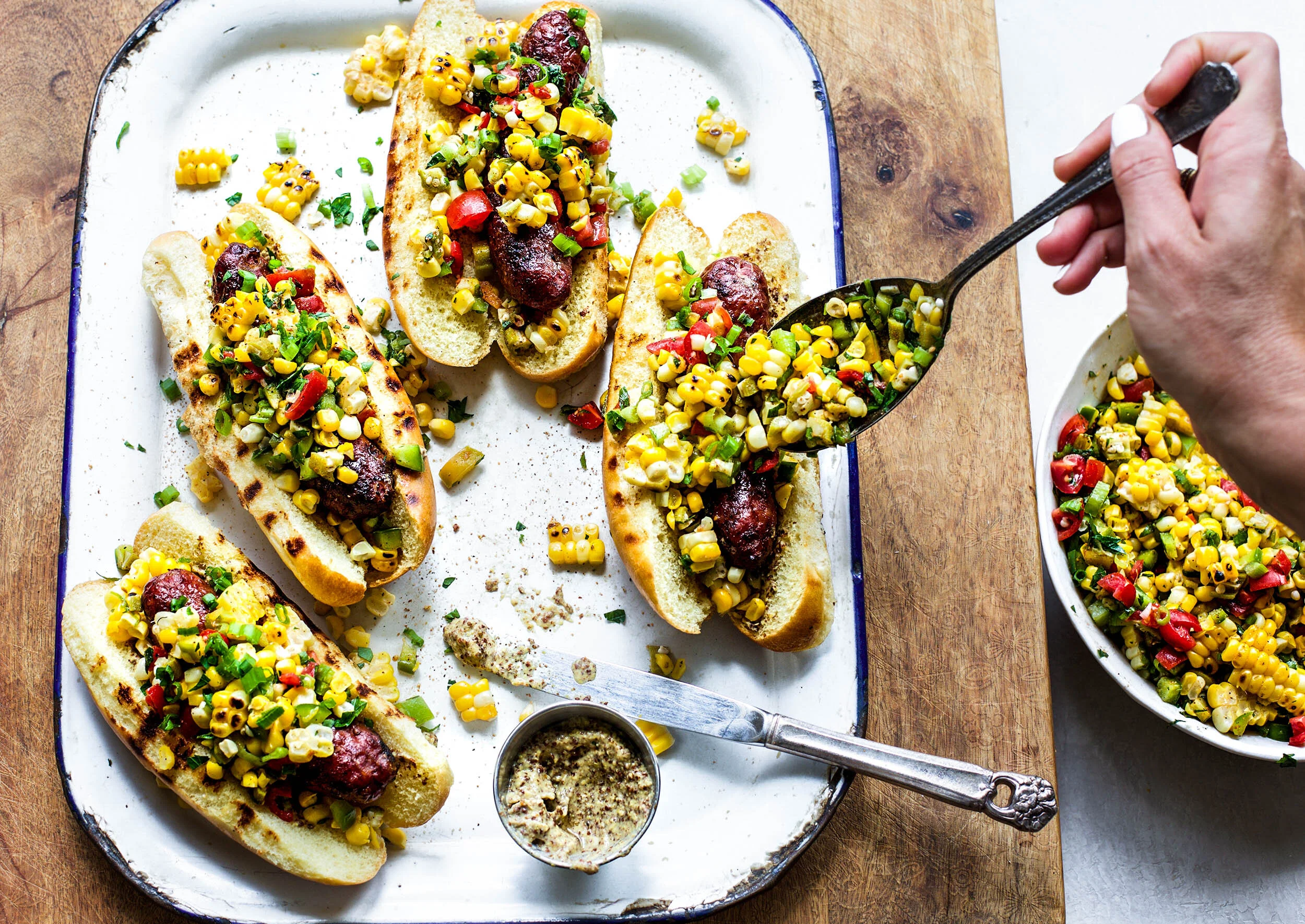 Tell me I am not the only one who does a little happy dance when a meal is extra yummy? Even my four year old does a little jig when he is eating something that he loves. These grilled sausage dogs with Cajun corn salsa are one of those dishes that will make you move at the table as you savor the deliciousness that comes with every single bite. The combination of the grilled andouille sausage with a toasted bun and crisp spicy Cajun corn salsa is truly a match made in heaven.